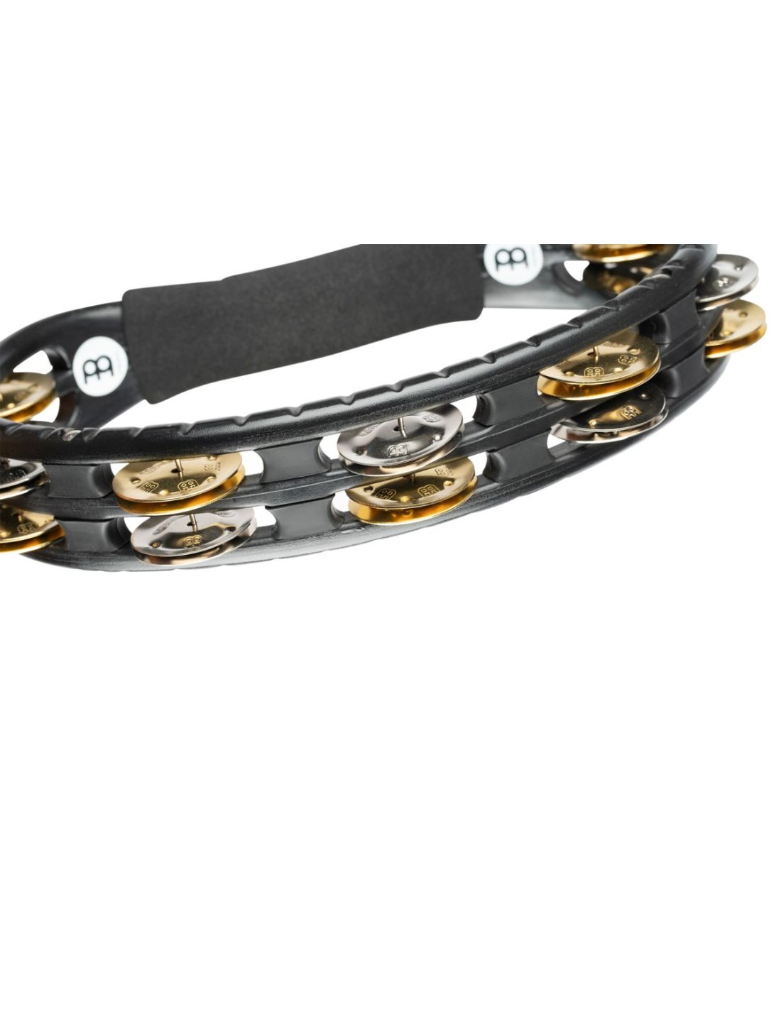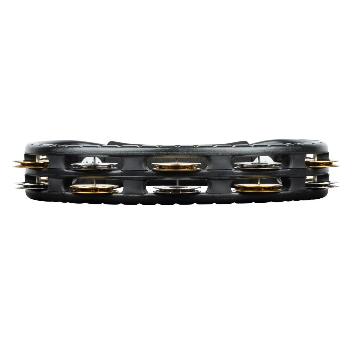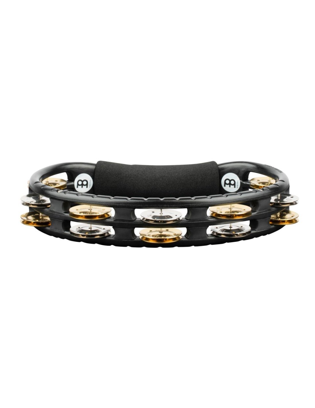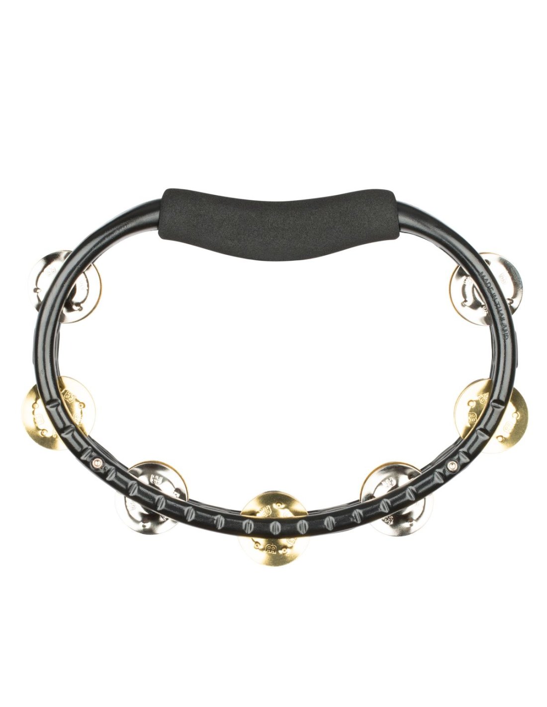 'Soft padded handle for maximum comfort Ergonomic design Guiro rough frame Position of sandwich jingles for maximum resonance 14 pairs of steel and brass jingles in a double row ABS frame Color: Black Perfect for any musician, from percussionists and drummers to singers and horn players, this portable tambourine has a balanced feel to easily add movement or accents to your music. 14 pairs of mixed jingles in nickel silver plate steel and solid brass respond with a brilliant attack and a warm tone, with a sharp volume. The jingles are mounted in a special “sandwich” position with the flanged edges facing each other for a more precise attack and full resonance. The crescent shaped frame made with ultra resistant synthetic material made to last. It features a rippled 'guiro' style surface on which you can drag a wand for sound effects. '