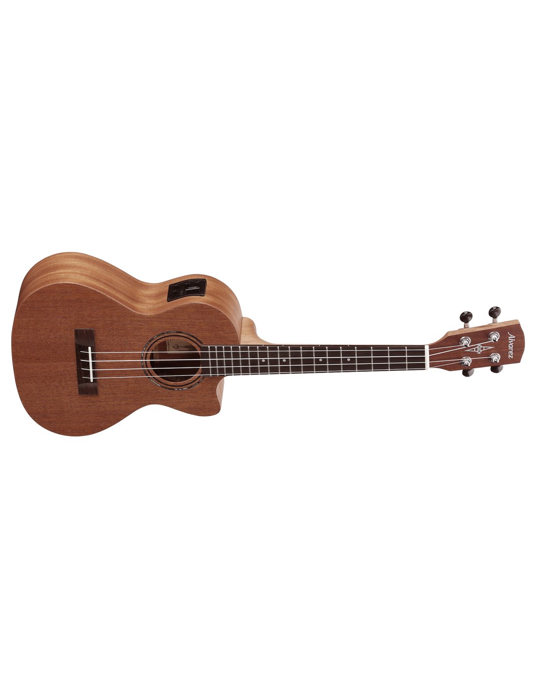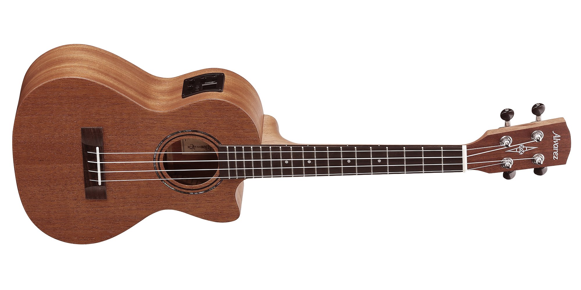 Electrified Missing Shoulder Tenor Ukulele. Construction: Dovetail Neck Joint. Scale: 16.93 (430 mm). Sound Box: Tenor. Chain: Traditional Fan. Back and Sides: Laminated mahogany. Top: Laminated mahogany. Top Finish: Natural Satin. Handle: Mahogany Keyboard: Techwood Nut/Saddle: Bone - 35 mm (1.38"). Keys: 18. Mechanics: Alvarez chrome. Bridge: Techwood, with bone saddle. Electronics: Alvarez AUE-20. Strings: Eagle Nylgut Total Length: 662mm. Case Width: 233 mm. Heel Case Thickness: 68mm. Case Thickness at the Base: 80mm
