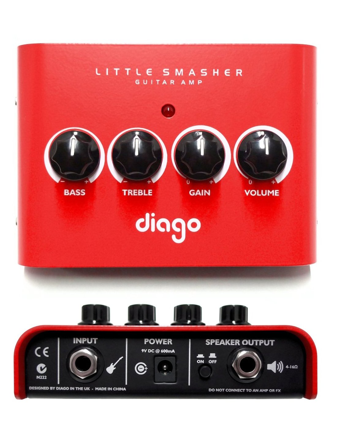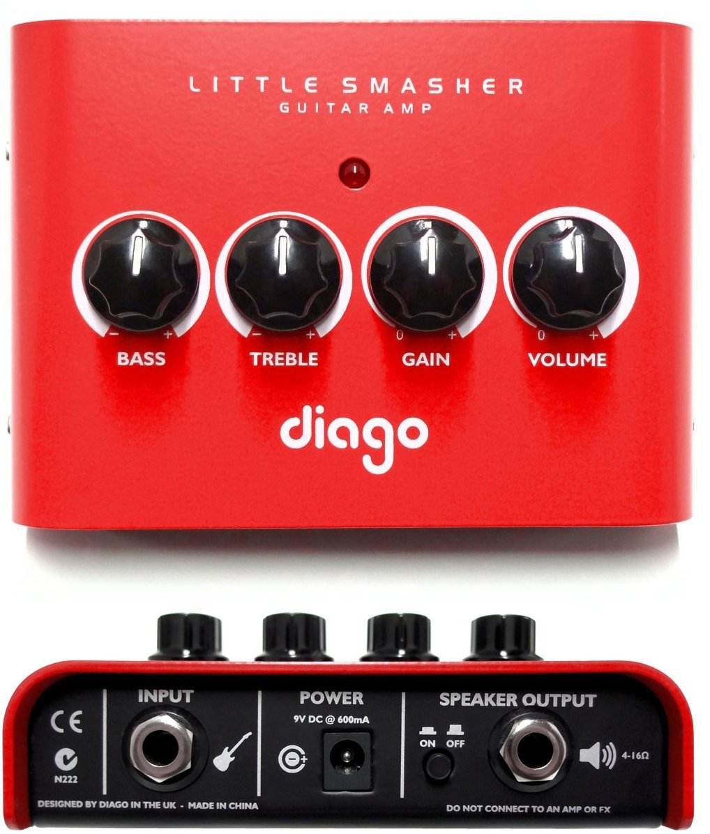 Diago LS01 Little Smasher Head red color. The Diago LS01 is a 5 Watt mini electric guitar head. It has 1 channel with Bass, Treble, Gain and Volume controls. It is equipped with an input, a Speaker output and a socket for the external power supply.