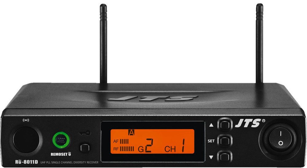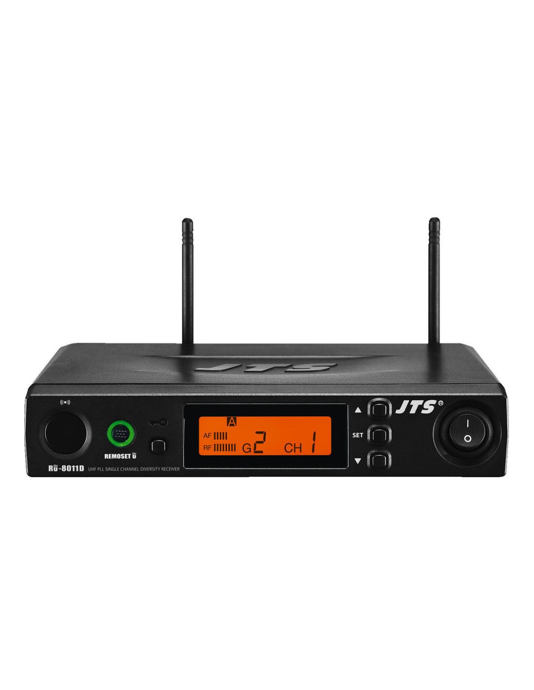 JTS RU-8011D/RU850TB 614-650MHZ. 2nd generation UHF PLL system with wireless diversity technology consisting of: RU-8011 single-channel receiver and RU-850TB bodypack transmitter. Technical features include 36 MHz bandwidth, 16 selectable frequencies per channel, dual 7-segment display on the receiver. 614-650 MHz Frequency Band