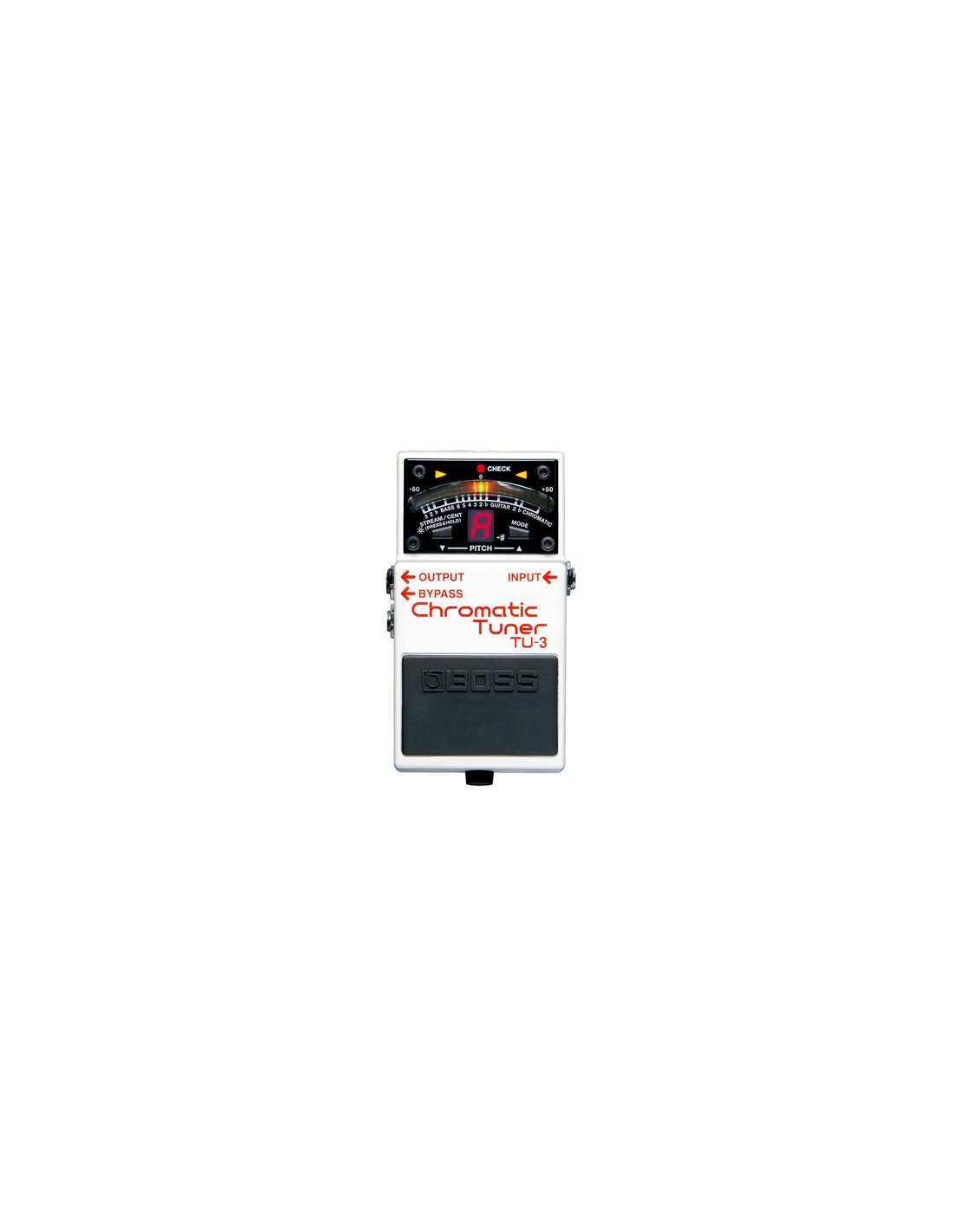 Boss TU-3 Chromatic Tuner Pedal Tuner. The Boss TU-3 Chromatic Tuner is a chromatic pedal tuner for guitar/bass. It is equipped with a 21-segment LED meter with brightness control, “High Brightness” function for greater visibility and control over the tuning, “Accu-Pitch Sign” function with which it is possible to verify the tuning visually, Chromatic and Guitar/Bass modes (tuning by string number with support for 7-string guitar and 6-string bass), the possibility of Flat Tuning in the “Guitar Flat” mode that will allow you to create “Drop” type tunings up to six semitones, audio signal automatically muted when turned on, possibility to power up to 7 BOSS compact pedals via DC Out.