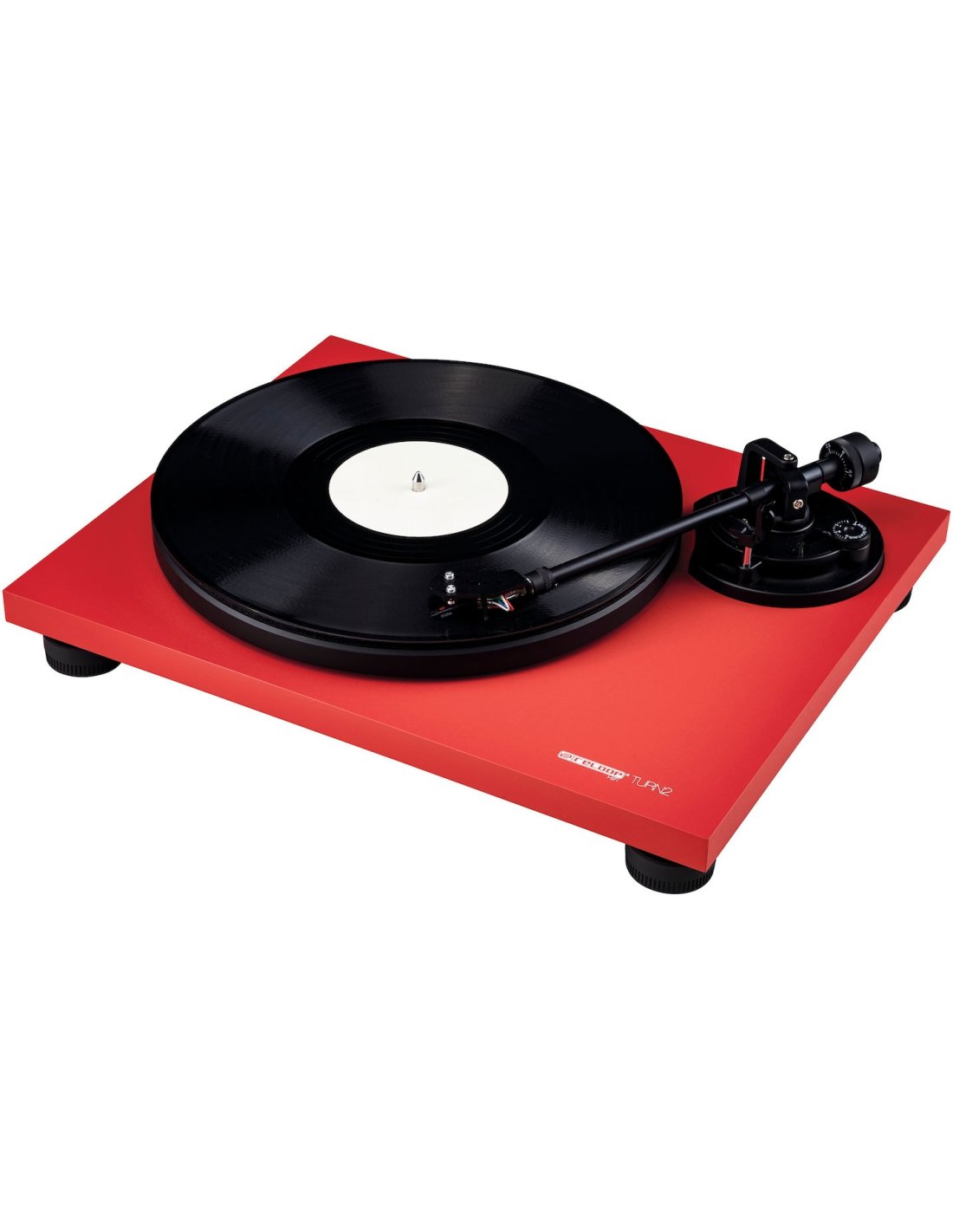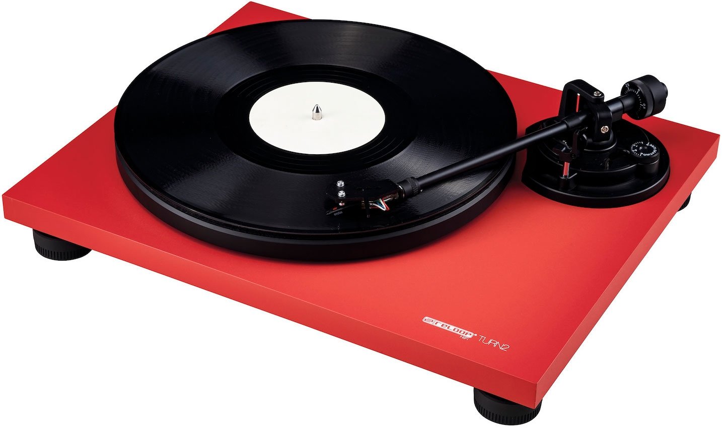 The Reloop Turn 2 Red is a manual turntable with belt drive, color Red. Suitable for HiFi use. It features a straight arm with hydraulic lift, static balancing and adjustable antiskating. Universal head holder to GM/SME standard, with Ortofon OM10 head included. Reinforced MDF chassis to contain vibrations. DC motor with two selectable speeds: 33-1/3 and 45 revolutions. Die-cast aluminum plate with felt mat. RCA outputs with Ground terminal, for connection to Phono inputs. Transparent lid and external power supply are included