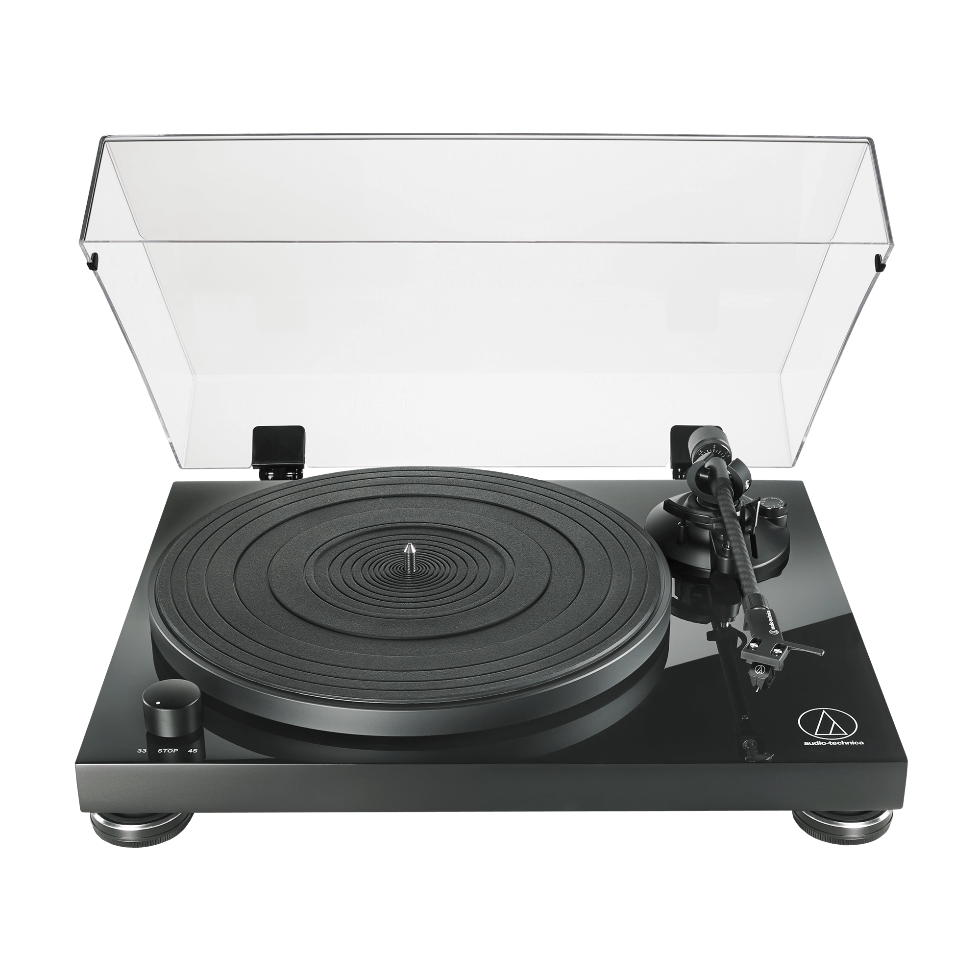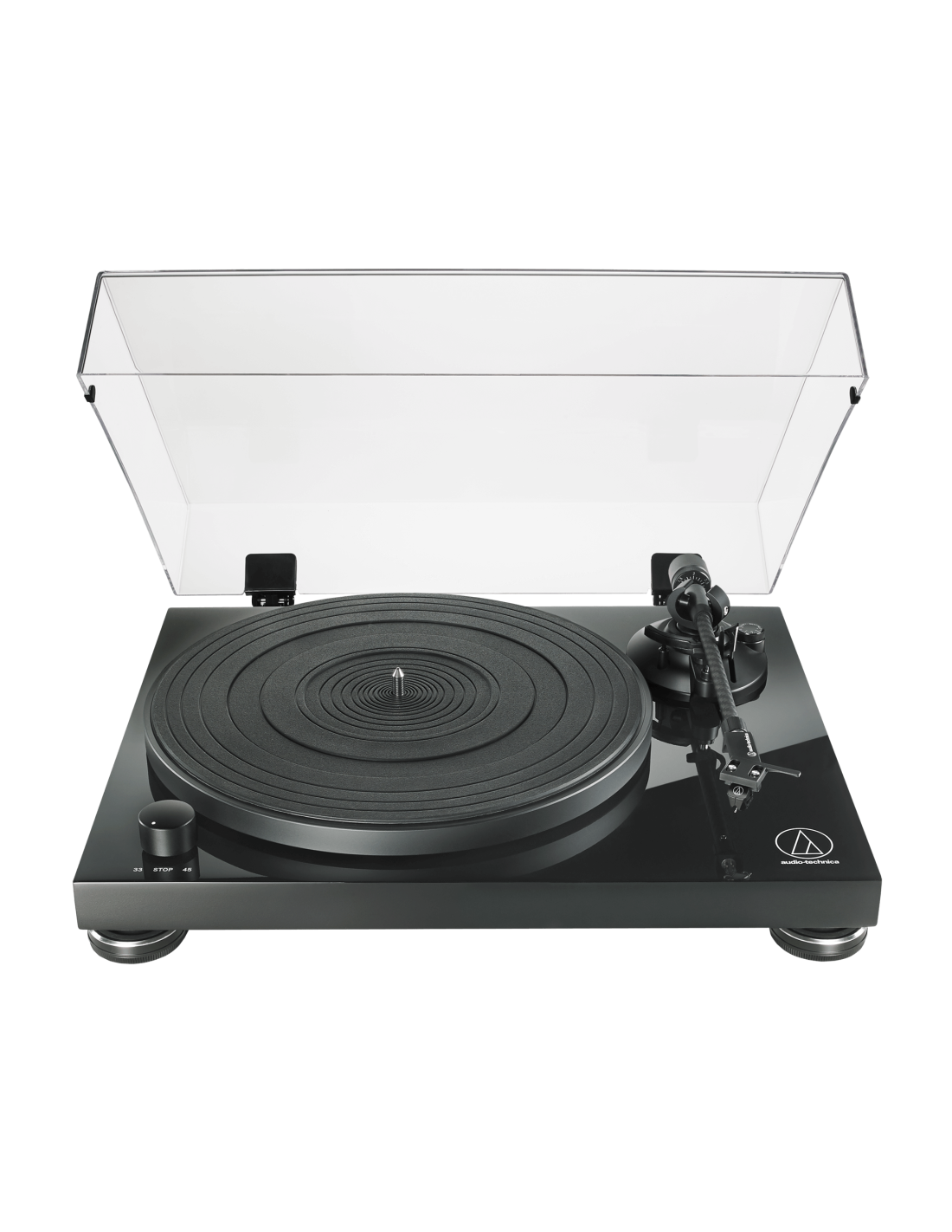The Audio-Technica AT-LPW50PB is a manual turntable with belt drive, in Lacquered Black color. Suitable for HiFi use. It is equipped with a straight carbon fiber arm, with adjustable counterweight and tracking, AT-HS4 universal head shell and AT-VM95E double magnet MM head with elliptical stylus. Servo-controlled DC motor, with speed monitoring sensor, selectable at 33-1/3 and 45 revolutions. Manual operation with hydraulic damping arm lifting and falling mechanism. High-density MDF chassis, optimized for the best vibration damping. Die-cast aluminum plate with rubber mat. Integrated RIAA Phono preamplifier, selectable for connection to both Phono and Line inputs. RCA outputs. Includes stereo RCA cable, adapter for 45 rpm discs, transparent cover. External power supply.