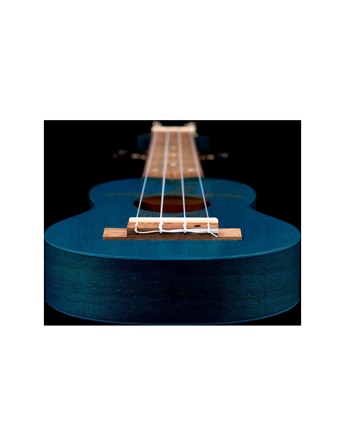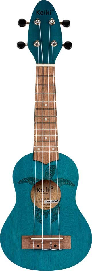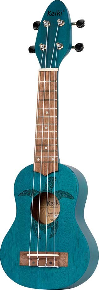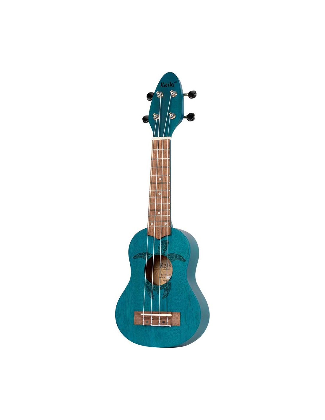 Keiki K1-MM Soprano Ukulele (smaller than the soprano, 248 mm scale). Satin blue finish. Okume body and neck, keyboard and bridge in walnut. Top in okume with laser engraving of a turtle. Black chrome mechanics. It mounts Ortega UWNY--4-SO strings for standard soprano.