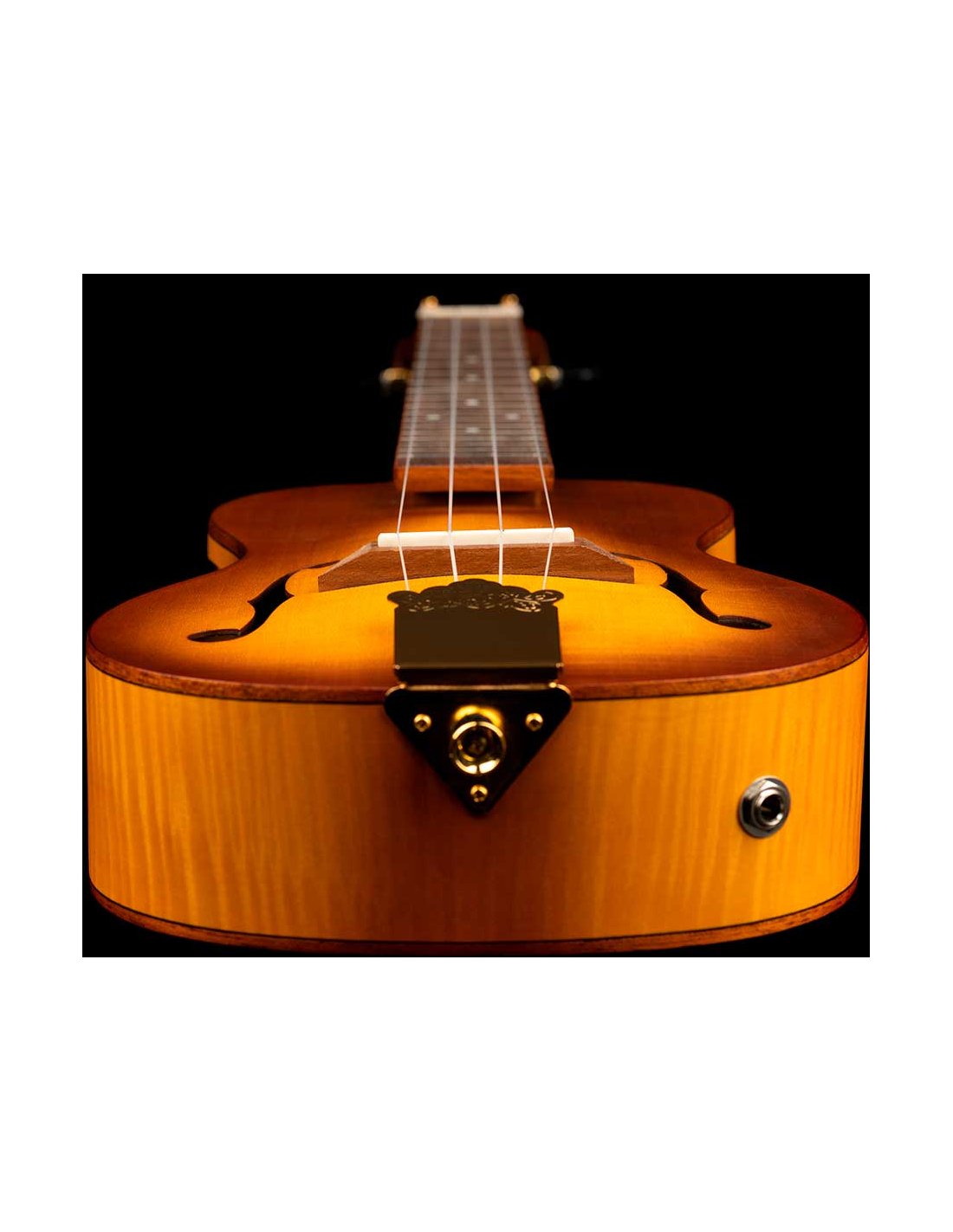 Archtop style acoustic electric ukulele size concert size RUSL-HSB Saloon Series. Flamed maple body, curved top with F-shaped mouths in flamed maple, curved back in flamed maple, walnut fingerboard, mandolin-style bridge in walnut, okume handle. Honey sunburst satin finish Golden mechanics. Golden tailpiece jazz style. Ortega Magus Uke electronics with tuner. UWNY-4-CC strings. Includes deluxe bag. 382 mm scale.