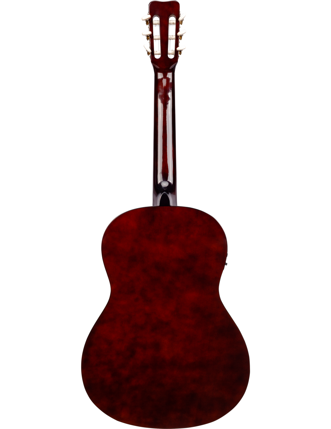'Amplified classical guitar 4/4 Preamp with EQ/tone and tuner Laminated Spruce Body Okoume Bottom and Bands Total Length: 39" Body Depth: 3.7" Shoulders: 11.1" Waist: 9.5" Hips: 14.6" Head Width: 52mm Poplar Fretboard Keys: 18 Seasoned Woods Internal Chain Adjustable Nylon Truss Rod Strings Padded Bag Included'
