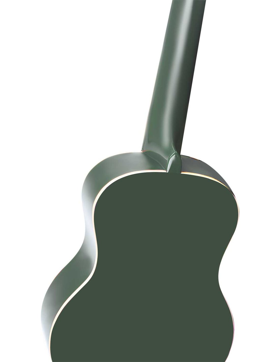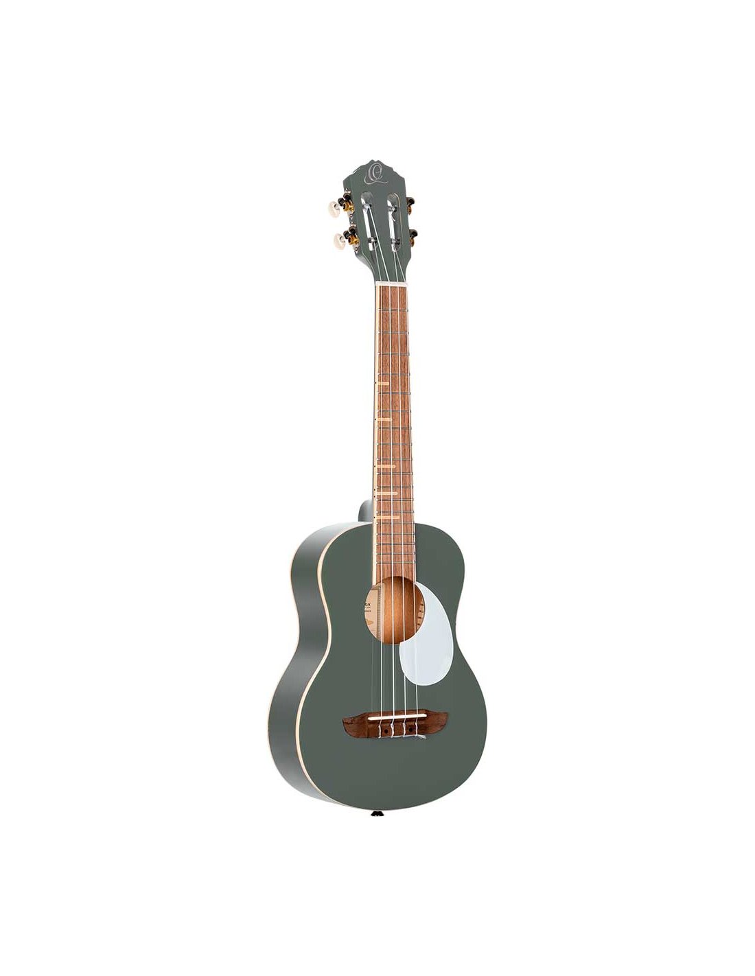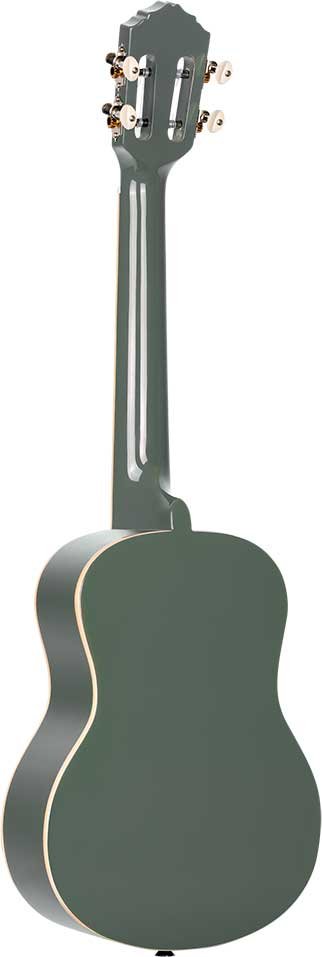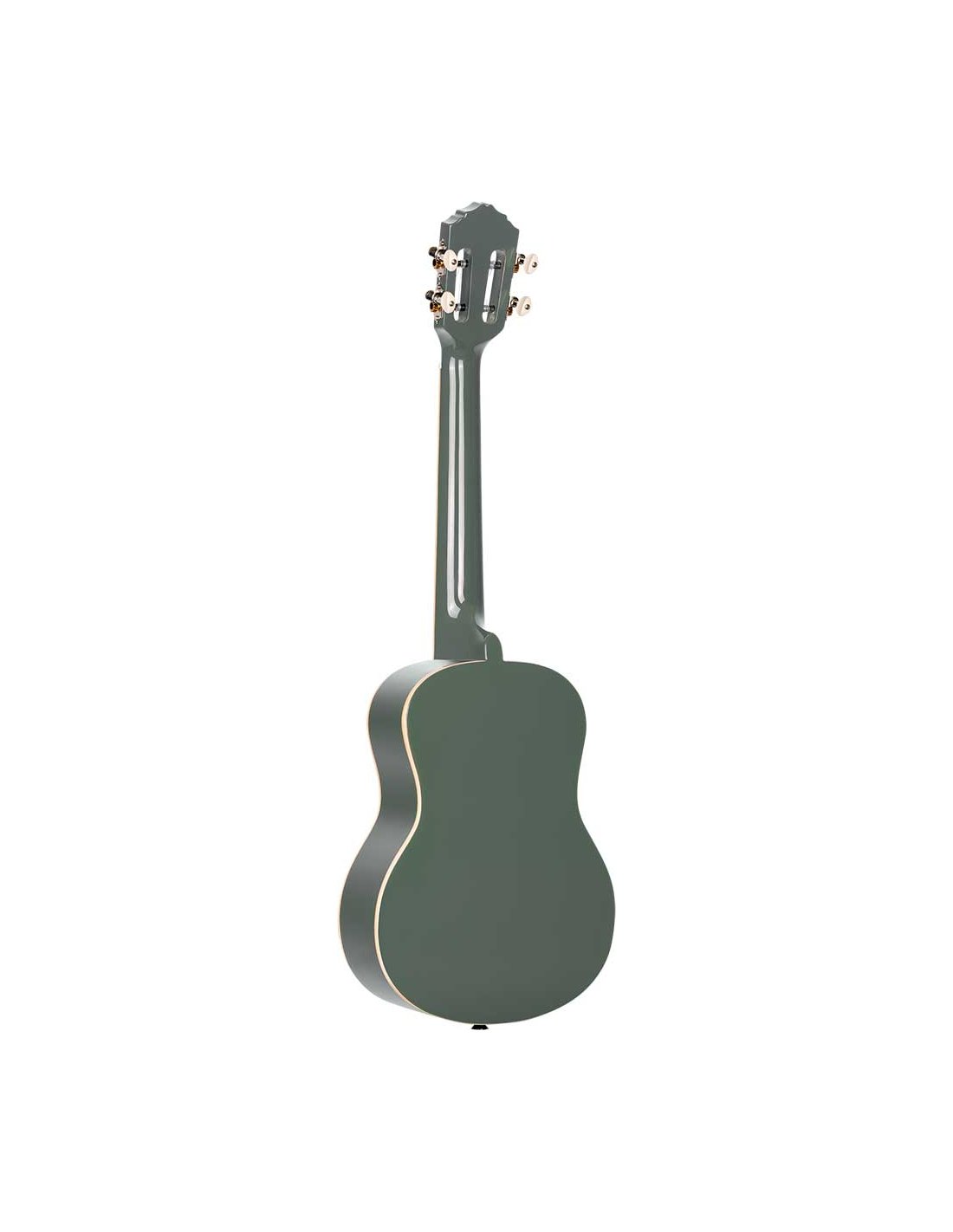 RUGA-PLT Tenor Ukulele from the Gaucho series. Agathis top in bright platinum gray. Back and sides: Agathis. Ivory ABS binding. Shiny Okoumé handle. Classic style tuner with okoume foil. Walnut keyboard and bridge. Maple keyboard inlays. Chromed mechanics with white wing nut. White teardrop pickguard. Bag included with colorful details to match the finish of the ukulele.
