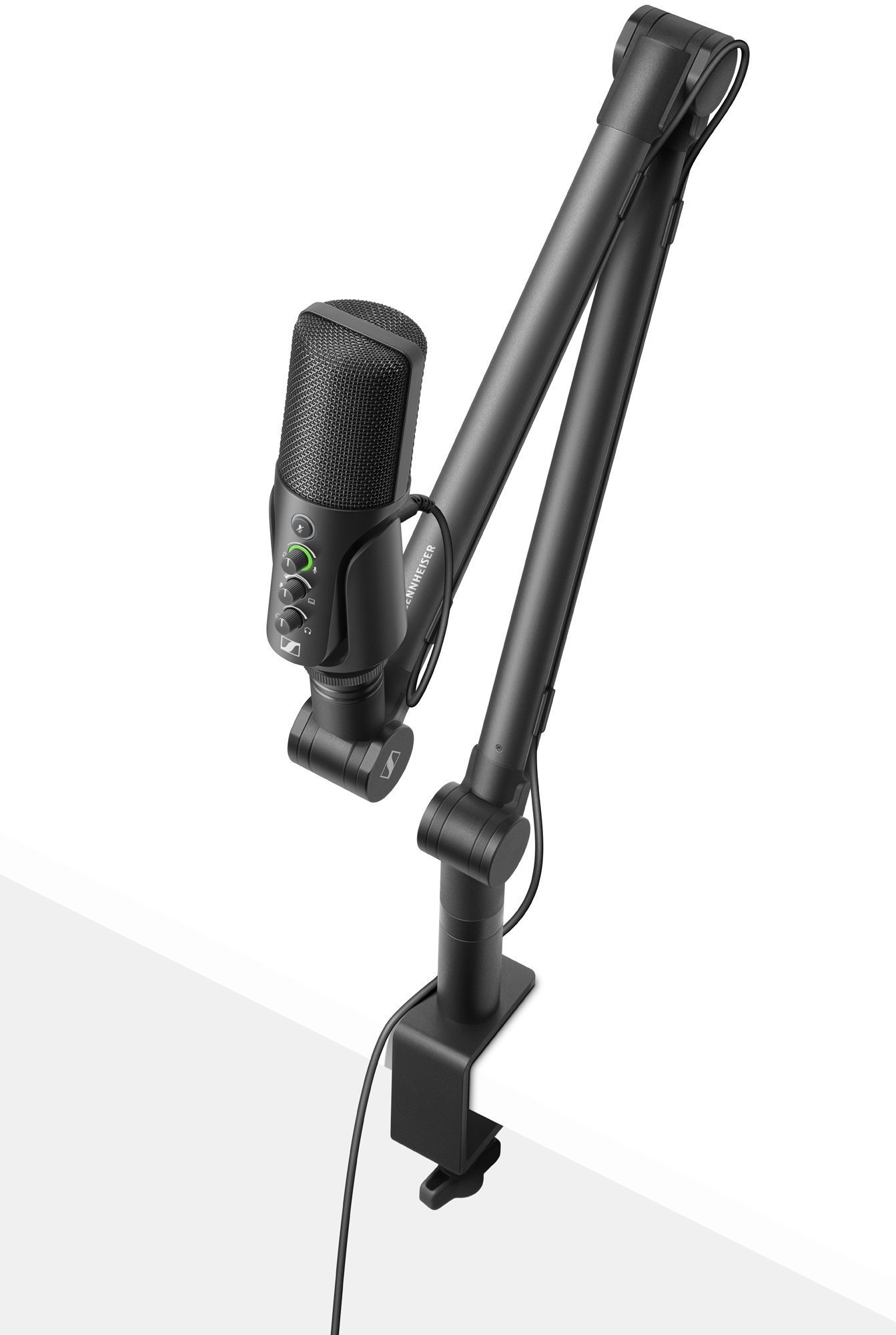 SENNHEISER PROFILE STREAMING SET. Microphone set for streaming applications consisting of a USB-C microphone and an articulated table arm support. The microphone features a cardioid condenser capsule, integrated functionality, gain control, mix control to balance the microphone with the device's audio, volume control to set the headphone monitoring level. The table stand has a 3-point joint, adjustable inclination with self-locking joint and table clamp