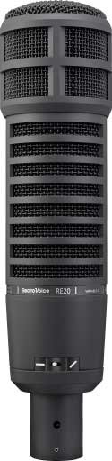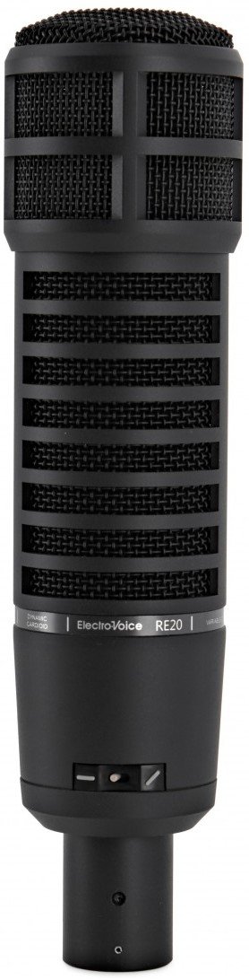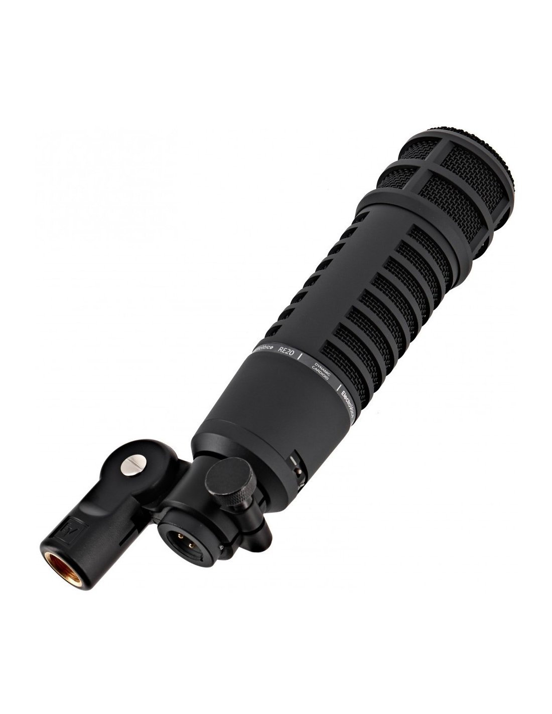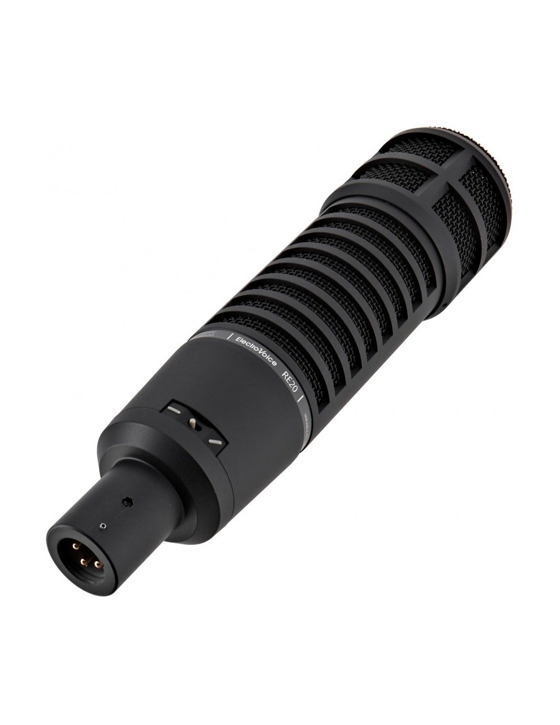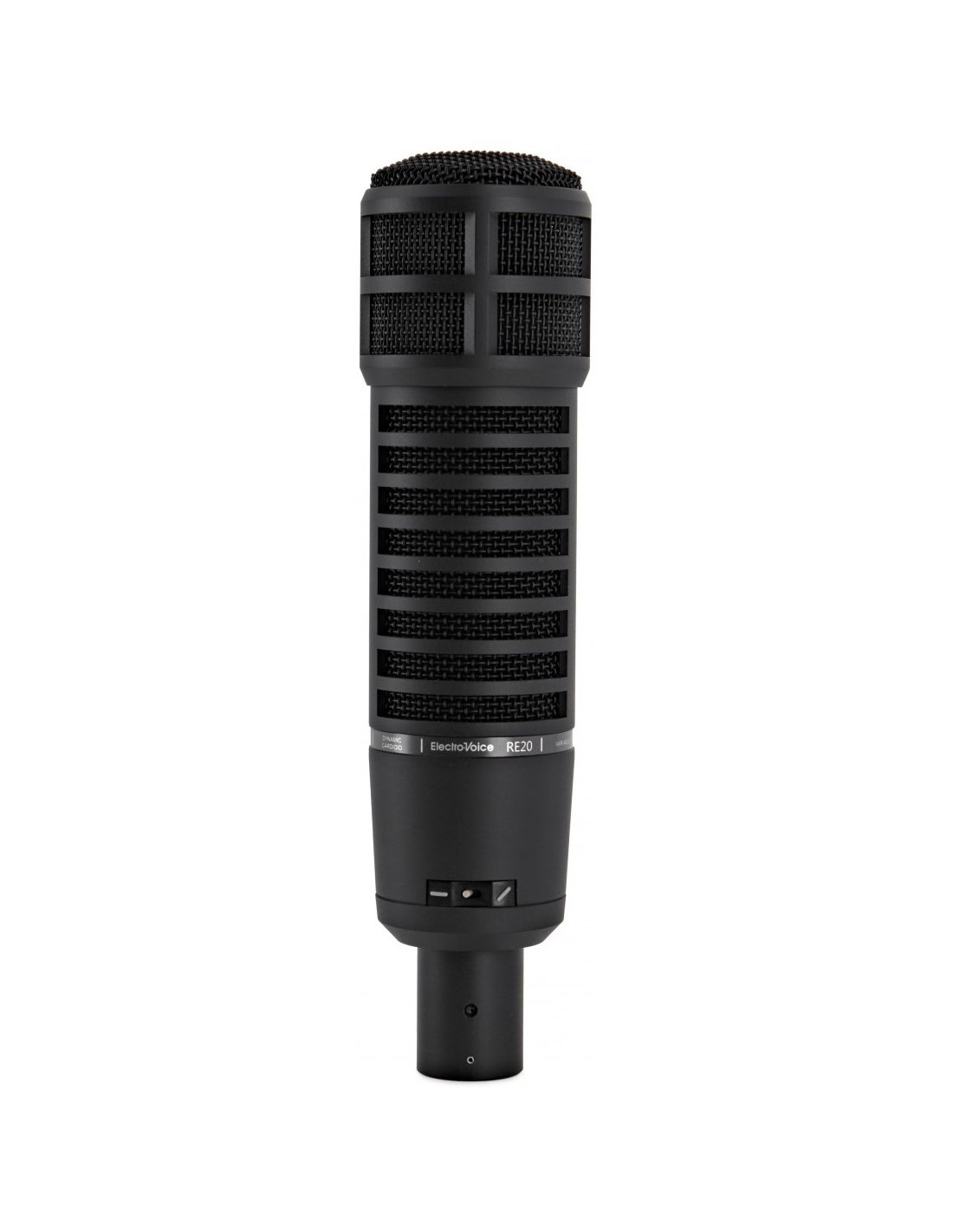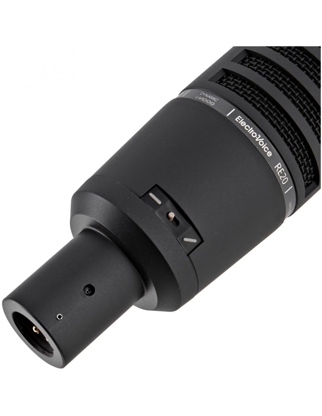 ELECTRO VOICE RE20 BLACK. Dynamic cardioid polar pattern microphone with large diaphragm and variable D diaphragm ideal for both drum and voice microphones. Technical features include integrated pop filter, integrated internal shockmount, Humbucking hum protection coil, switch for roll-off adjustment of the mid-bass tone. Includes rod mount clip.