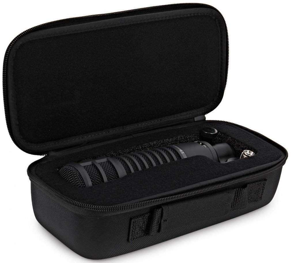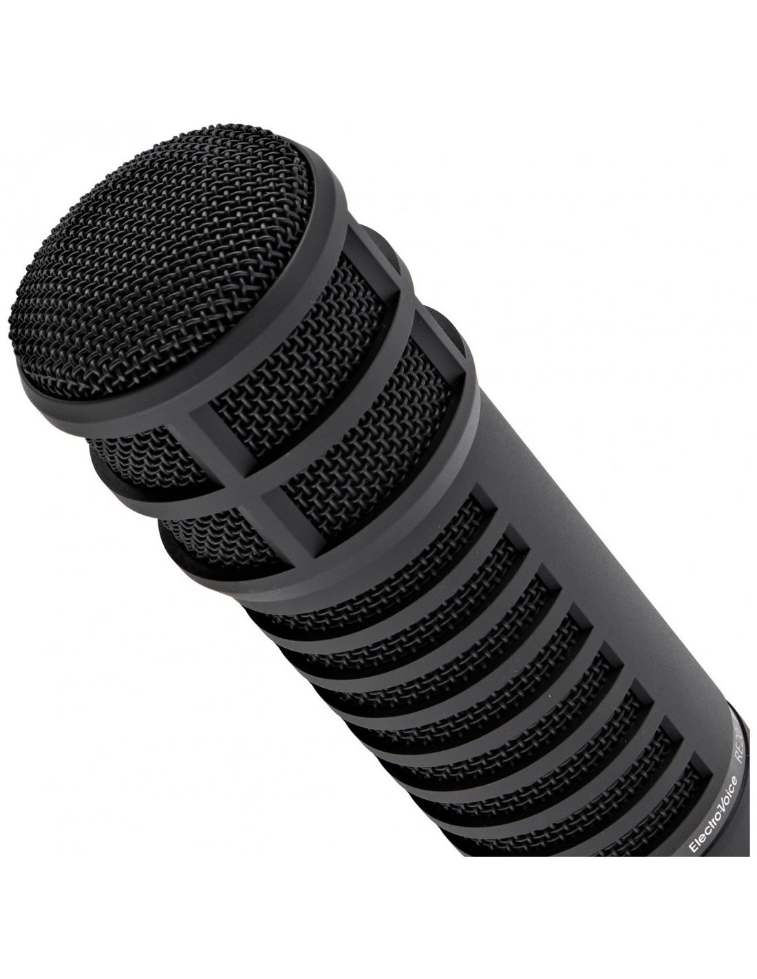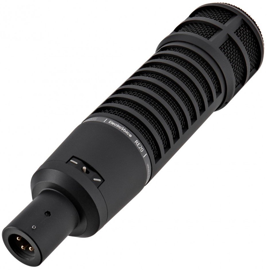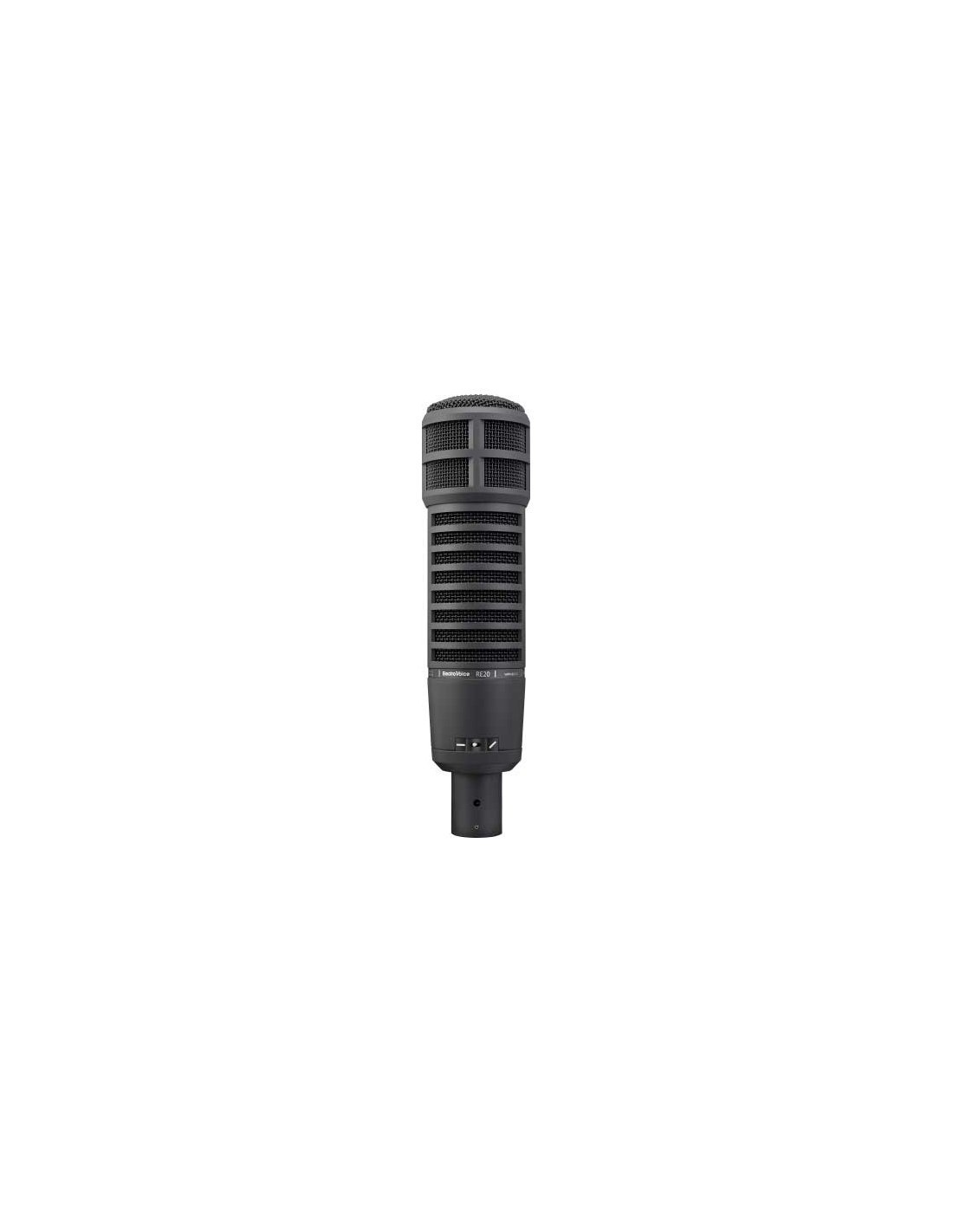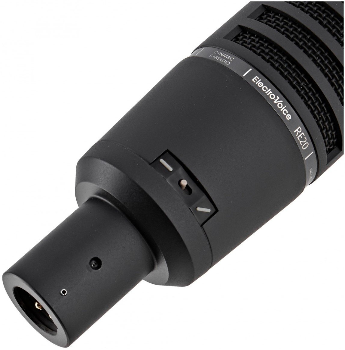ELECTRO VOICE RE20 BLACK. Dynamic cardioid polar pattern microphone with large diaphragm and variable D diaphragm ideal for both drum and voice microphones. Technical features include integrated pop filter, integrated internal shockmount, Humbucking hum protection coil, switch for roll-off adjustment of the mid-bass tone. Includes rod mount clip.