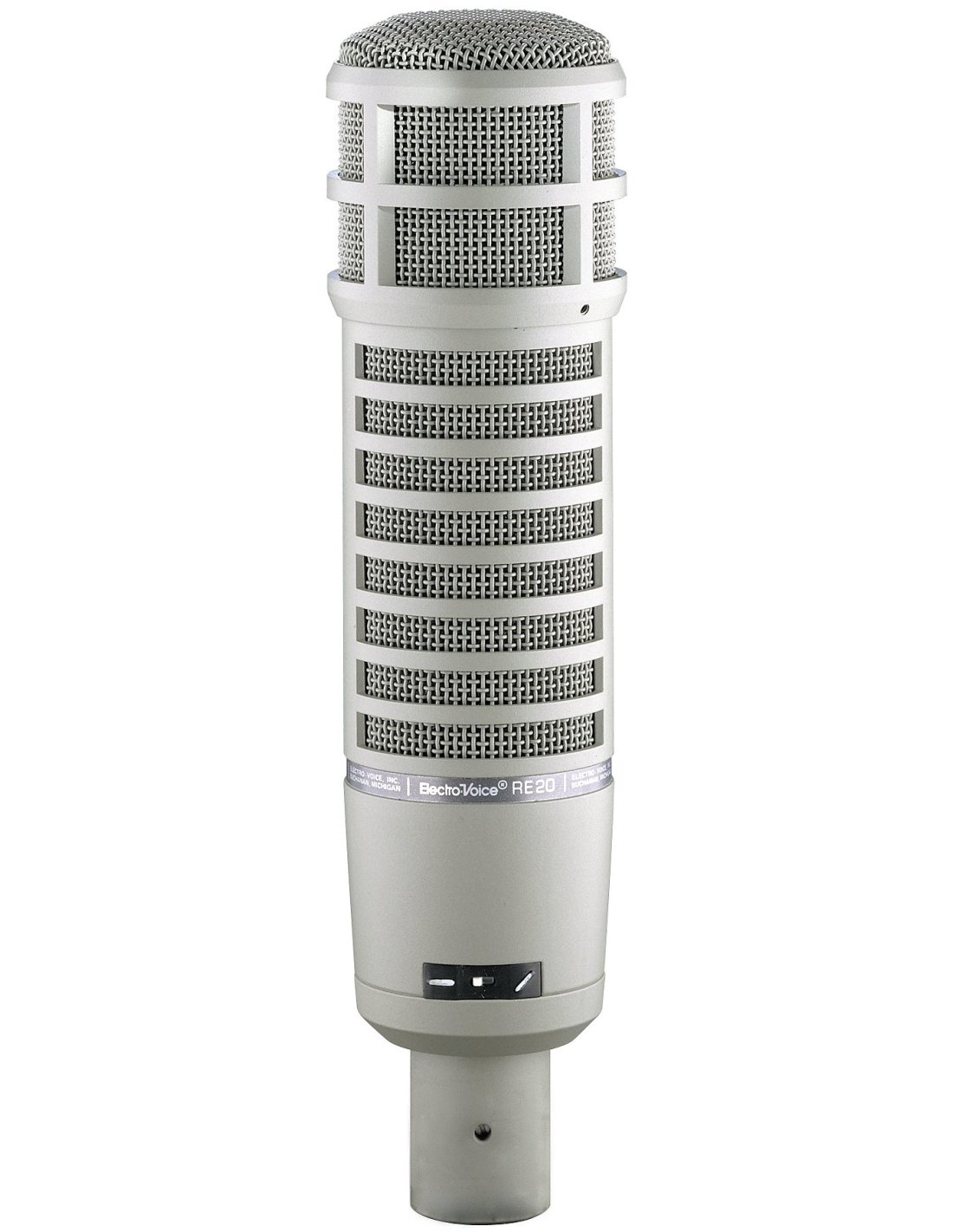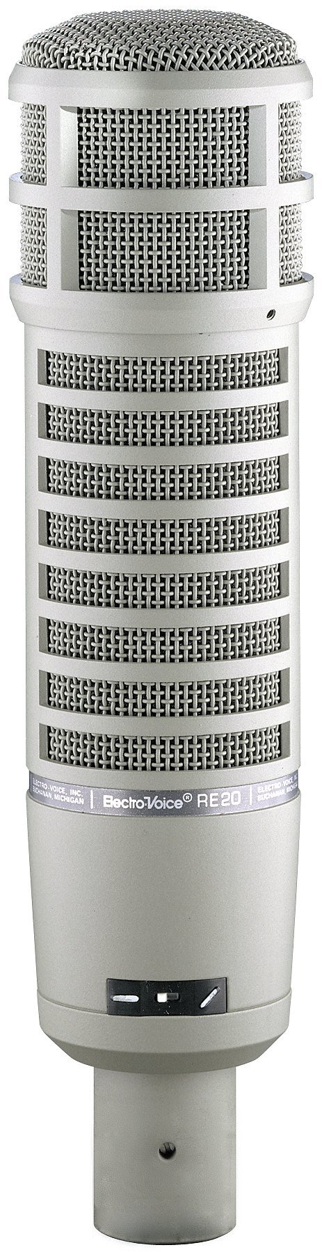 ELECTRO VOICE RE20. Dynamic cardioid microphone suitable for vocals, brass and drum bass. Technical features include Variable-D design for distortion-free close-ups, integrated pop filter and shockmount