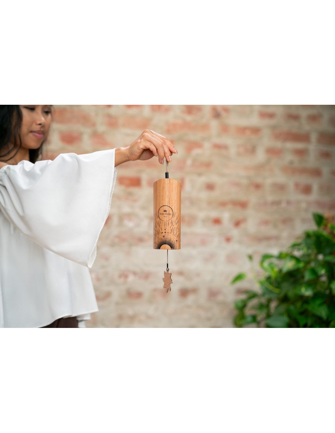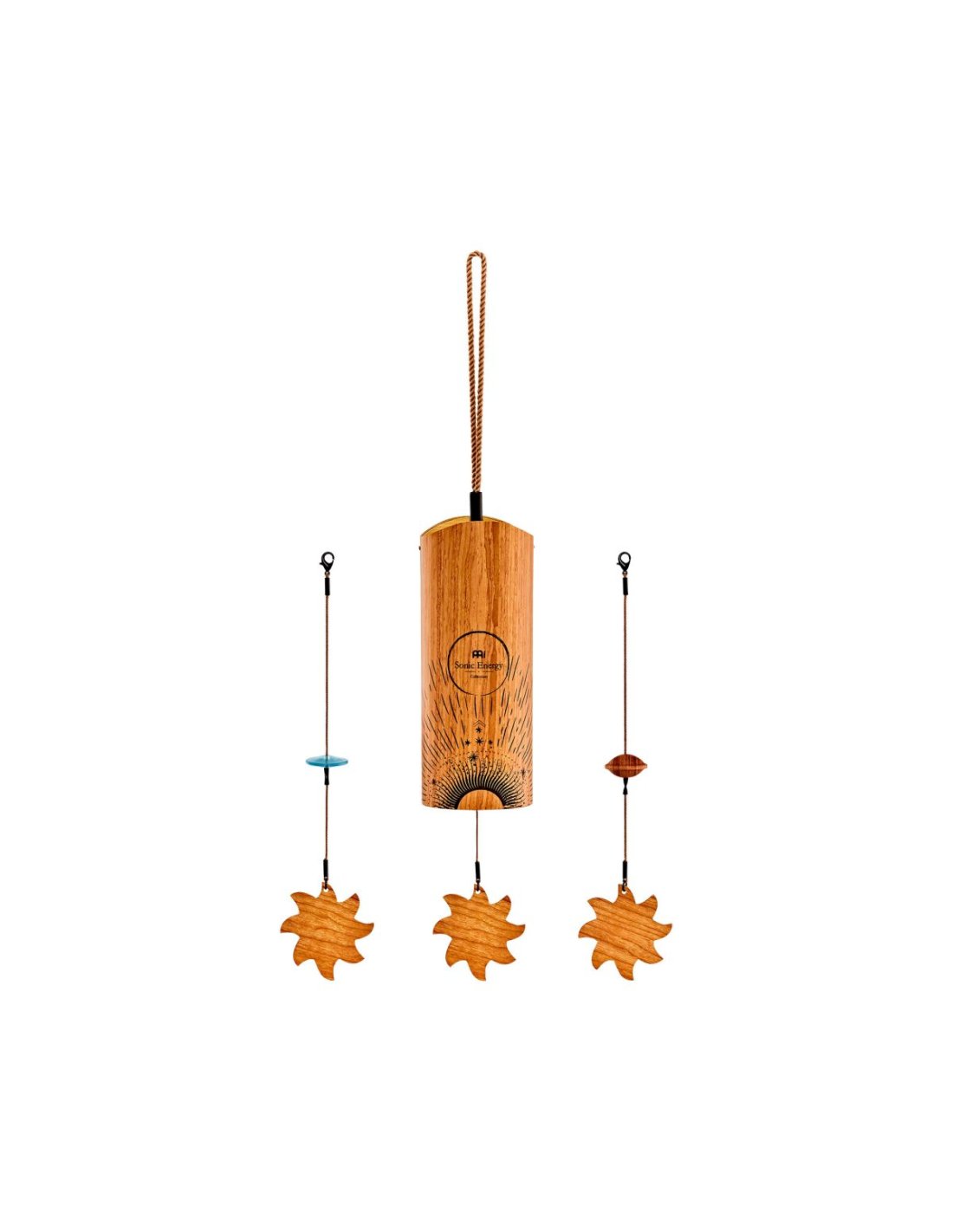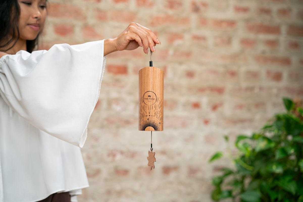'The Cosmic Bamboo Chimes by Meinl Sonic Energy produce soft, resonant tones that fill your space with serene sound. Ú for meditation, sound baths and yoga. Or create a relaxing space in your home to reflect. Hold the cord and gently rotate the doorbell to reactivate it. Inside there is a pendulum and a group of metal pins tuned to specific tones. Easily change the tone by moving between the two pendulums: acrylic (hard) and wood (soft). Insert the end of the pendulum clasp through the bottom of the bells. Attach the buckle to the wooden crossbar hook. Pull the braided cable straight and pull it up to make the bells ring. Available in four settings adapted to the time of day: Aurora (morning), Sun (day), Moon (afternoon) and Stella (night). Combine two or more to create a contrast in mood. Each doorbell is equipped with two additional replacement pendulums (acrylic, wood). Soft, resonant tones, For meditation, sound baths and yoga, Tuned to adapt to the time of day, Wrist strap for easy attachment. Dimensions 2.6” /6.5 cm in diameter, 17” /43 cm in height SE2024'