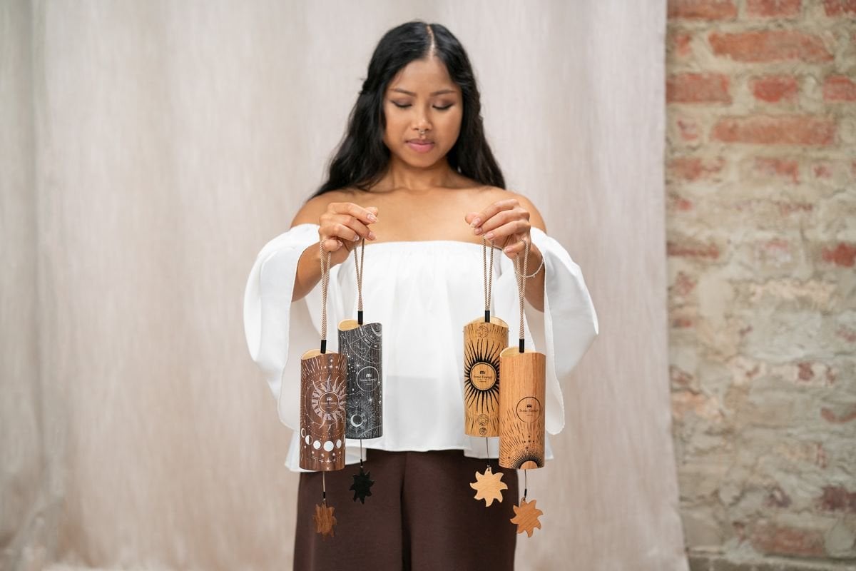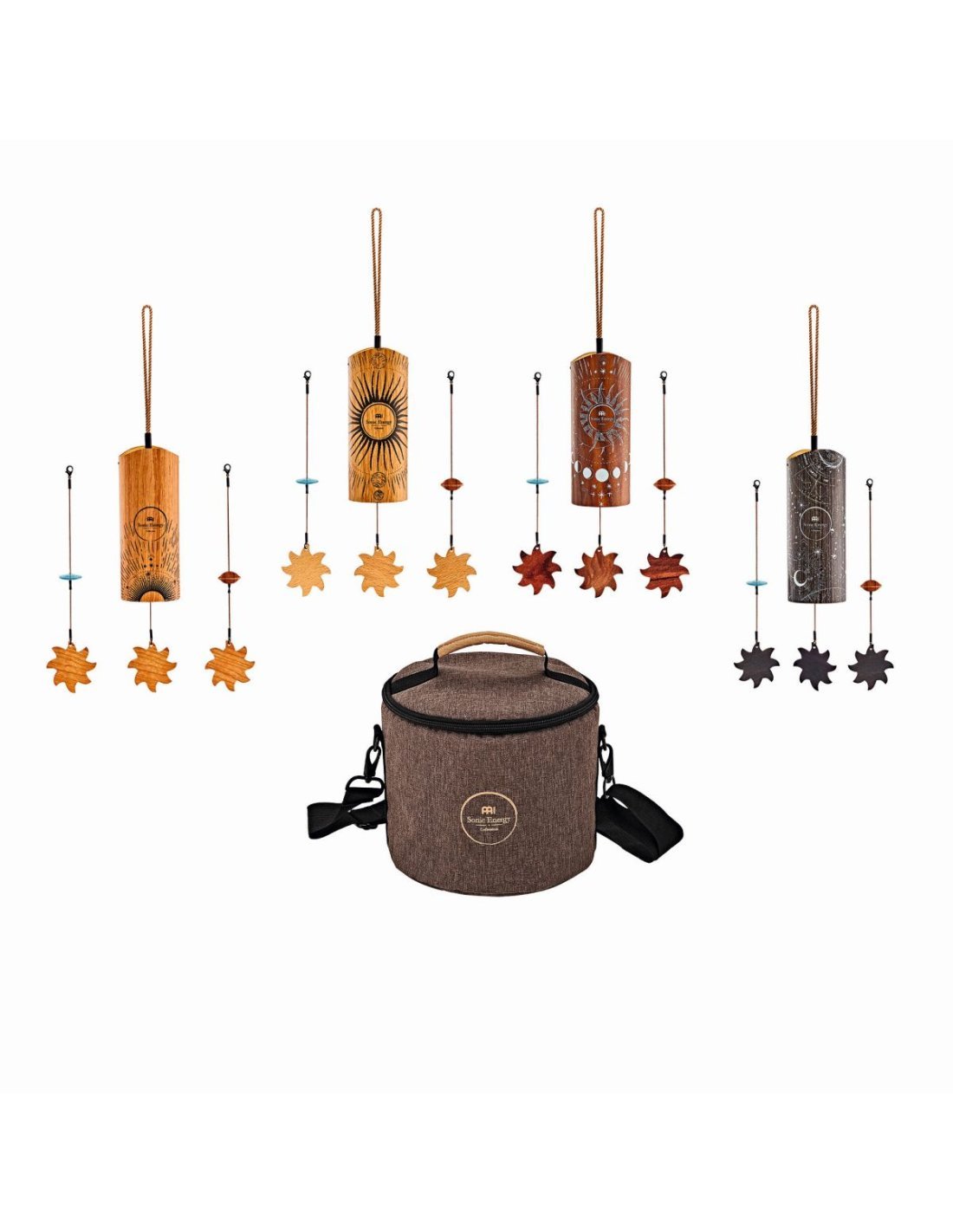 'The Cosmic Bamboo Chimes by Meinl Sonic Energy produce soft, resonant tones that fill your space with serene sound. Ú for meditation, sound baths and yoga. Or create a relaxing space in your home to reflect. Hold the cord and gently rotate the doorbell to reactivate it. Inside there is a pendulum and a group of metal pins tuned to specific tones. Easily change the tone by moving between the two pendulums: acrylic (hard) and wood (soft). Insert the end of the pendulum clasp through the bottom of the bells. Attach the buckle to the wooden crossbar hook. Pull the braided cable straight and pull it up to make the bells ring. Available in four settings adapted to the time of day: Aurora (morning), Sun (day), Moon (afternoon) and Stella (night). Combine two or more to create a contrast in mood. Each doorbell is equipped with two additional replacement pendulums (acrylic, wood). Soft, resonant tones, For meditation, sound baths and yoga, Tuned to adapt to the time of day, Wrist strap for easy attachment. Dimensions 2.6” /6.5 cm in diameter, 17” /43 cm in height SE2024'