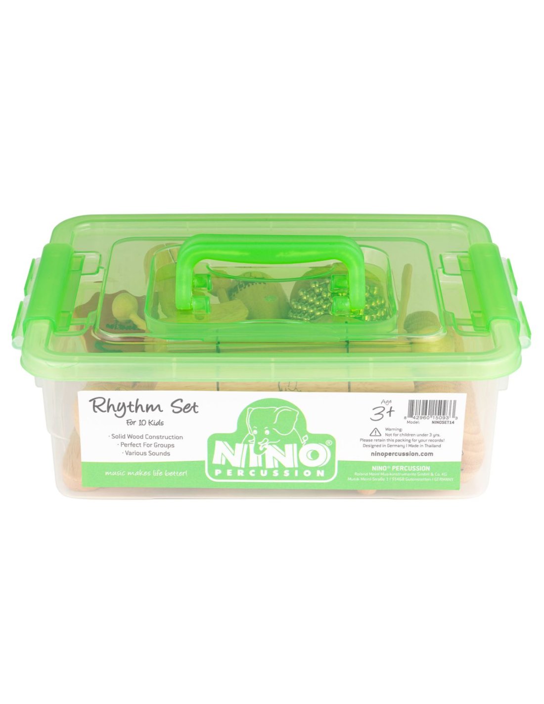 Get a range of percussion sounds in a single set with NINO¨ mixed drum rhythm sets. This set contains a mix of instruments designed to help teach young musicians about percussion with the practical use of real rhythm instruments that are fun to play. Great for the classroom or at home. Suitable for 10 children. Includes: 1x Wood Egg Maracas, Pair (NINO565) 1x Wood Claves, Pair, small (NINO502) 1x Wood Pecker (NINO519) 1x Wood Egg Shaker, Pair, small (NINO562-2) 1x Wood Hand Castanet (NINO585) 1x Wood Gÿiro Shaker (NINO520) 1x Cabasa, small (NINO701) 1x Energy Chime, small (NINO579S) 1x Storage Container Box Dimensions: 27.5 x 20 x 9 cm 10.8Ó x 7.9Ó x 3.5Ó NINO24V Status/Repacked item