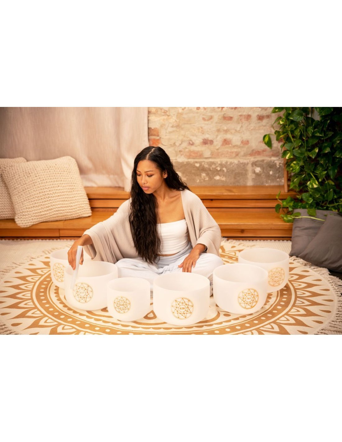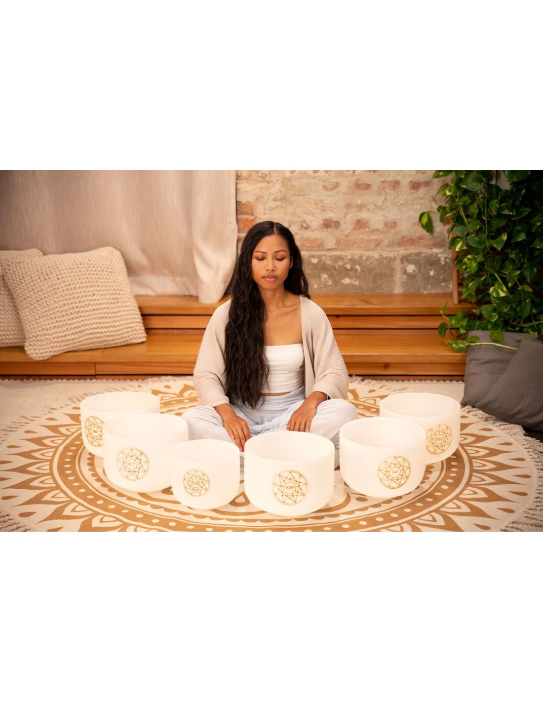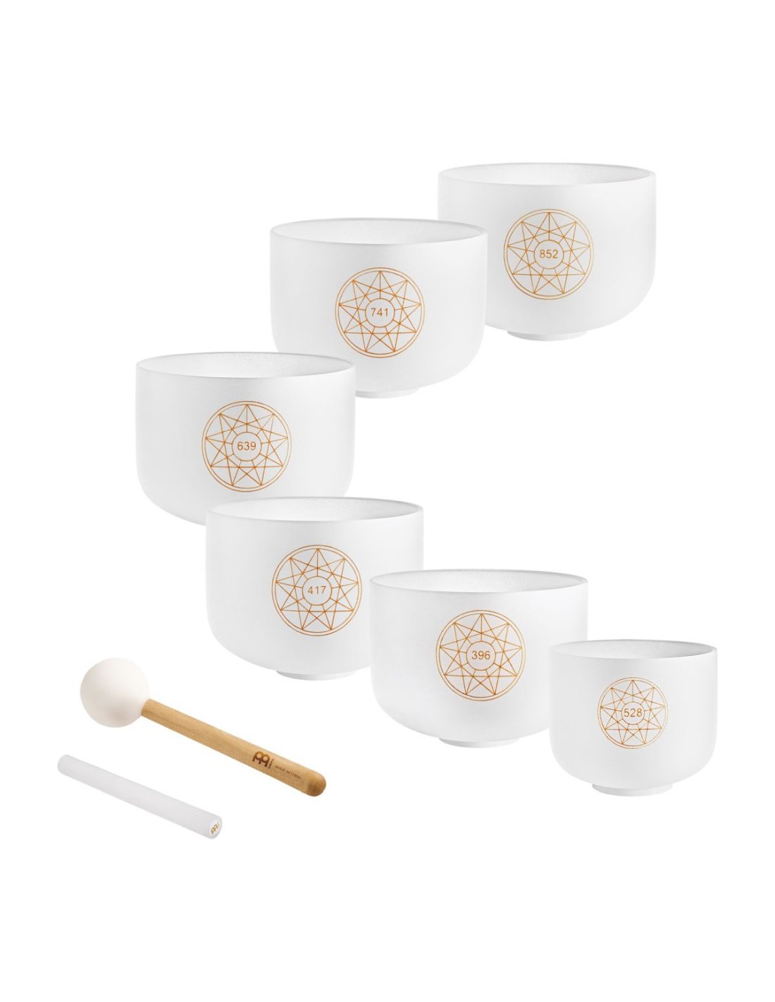 The Meinl Sonic Energy Solfeggio Crystal Tibetan bells are made using ancient frequencies. Solfeggio frequencies are vibrations of sounds that are said to have a healing and health-promoting effect on our body, mind and soul. Already in ancient times, these frequencies were known and used for the treatment of physical and psychological illnesses. For example, the monks used these historic frequencies in their Gregorian choirs and saw a healing effect in the transmission of vibrations to the body. These white frosted Tibetan bells made of high purity quartz create a very pleasant aura with their sound and design. Their long-lasting spherical tone spreads when the Tibetan bell is gently tapped or rubbed so that the energy can be felt throughout the surrounding environment. All crystal bells are equipped with a silicone ring to avoid possible shocks and ensure the best resonance. You can use crystal bells for a variety of purposes: chakra healing, meditation, sound therapy, yoga, improving the Fengshui of your home, regulating your emotional state or for decoration. Complete Frequency Set: 528 Hz positively affects life. Frequency represents transformation, miracles and signs and, according to some studies, it even seems able to influence our DNA. Fa (Famuli tuorum): 639 Hz represents harmonious relationships, love, tolerance and communication. Listening to this frequency harmonizes relationships between people and promotes inner balance. G (Solive polluti): 741 Hz represents intuition, problem solving, cleanliness and greater awareness. Listening regularly to this Solfeggio frequency helps you live healthier and promotes lifestyle changes, for example, in the field of nutrition. A (Labii reatum): 852 Hz supports the return to mental and spiritual harmony. Intensive listening to this frequency provides an opening of consciousness.