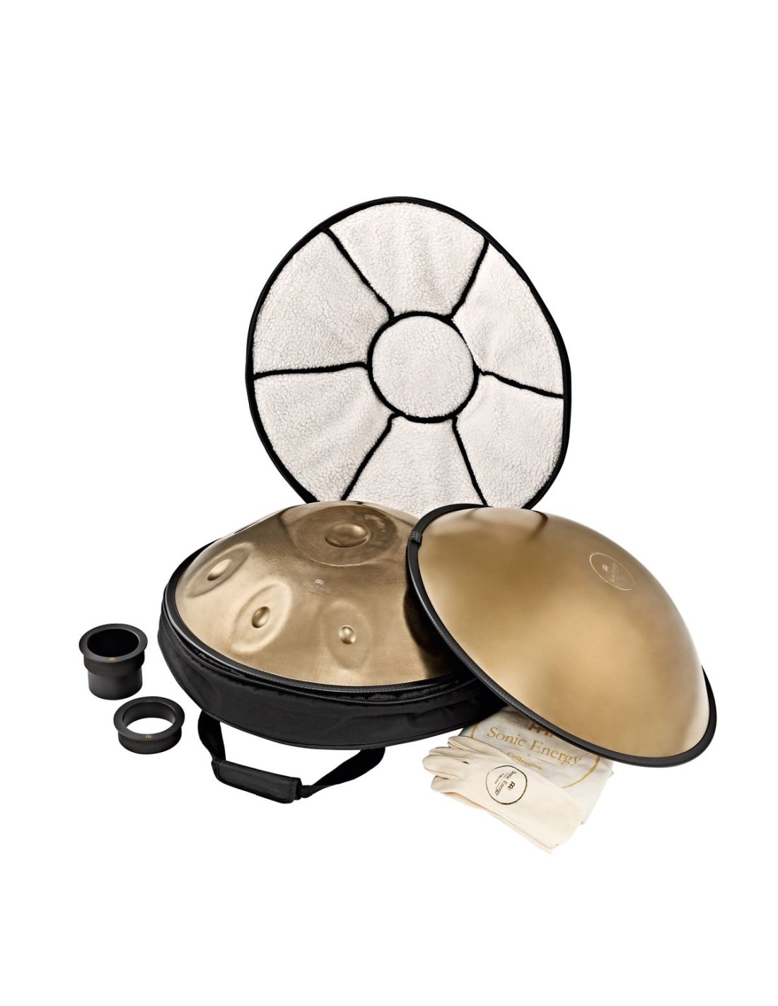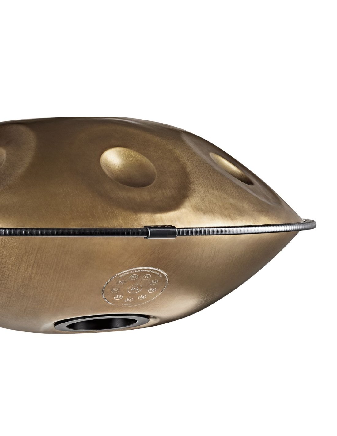 440 Hz. The Sensory Handpan Sonic Energy are handmade in high-quality stainless steel with great care and precision that results in clean, ethereal sounds that fill the space around you with ambient tones. The gorgeous vintage gold finish says it all before you even play them. Anyone can enjoy the relaxing sound and create music without any previous skill because each note completes all the others, which means there are no wrong notes you can hit. On the underside of our Sensory Handpans, there are two sound holes facing out in opposite directions to provide a completely immersive effect for both the musician and the listeners. Included in all Sensory Handpans are two removable sound tubes that allow you to alter the tonal qualities of the instrument. The longer tube placed in the hole faces the lowest heights of the handpan, and the shorter tube faces the sharpest heights. The immersive effect of these handpans makes them perfect for sound healing retreats, sound baths, meditation, or simply to calm your mind in the morning or evening before bed. This is a fantastic tool to use as a gateway to relaxation and learning melodies. Included with the handpan are a stainless steel protective cover, a soft case and a padded travel bag with synthetic wool interior, adjustable backpack straps and a strong carrying handle. 10 Notes Tonalities: D Amara D3/G3, A3, C4, D4, D4, E4, F4, G4, A4, C5 Handcrafted masterpieces Harmonic and balanced sounds Sweet sound with long sustain Engraved logo and note chart Removable sound tubes for advanced sound options Padded carrying bag Stainless steel protective cover Gloves