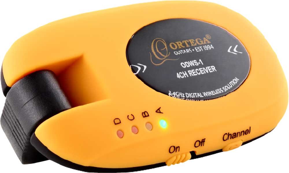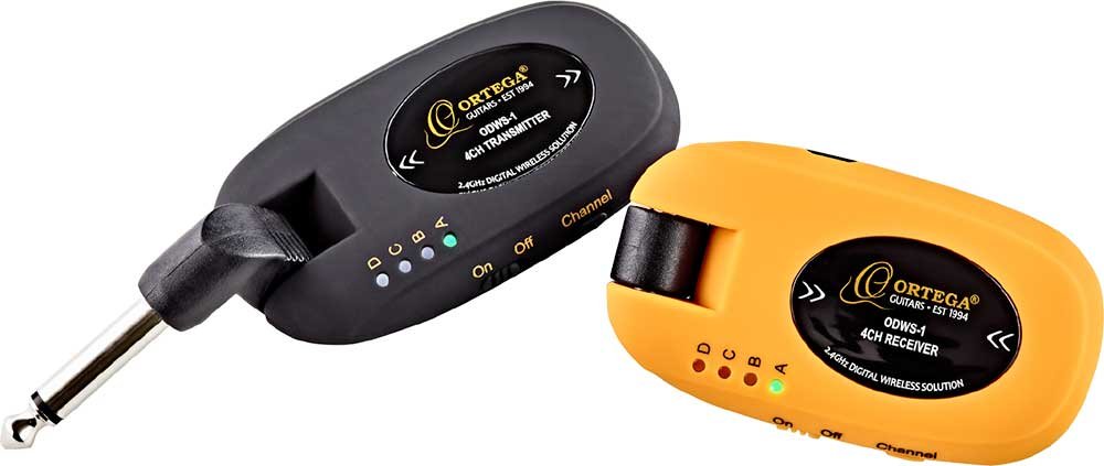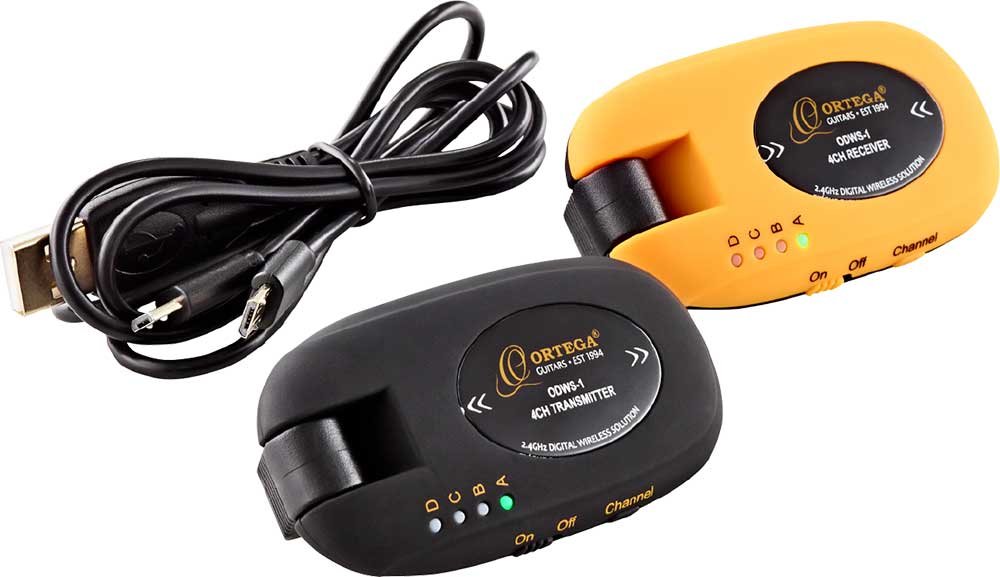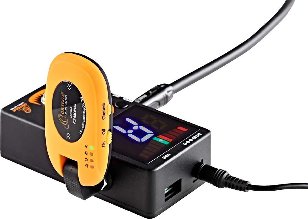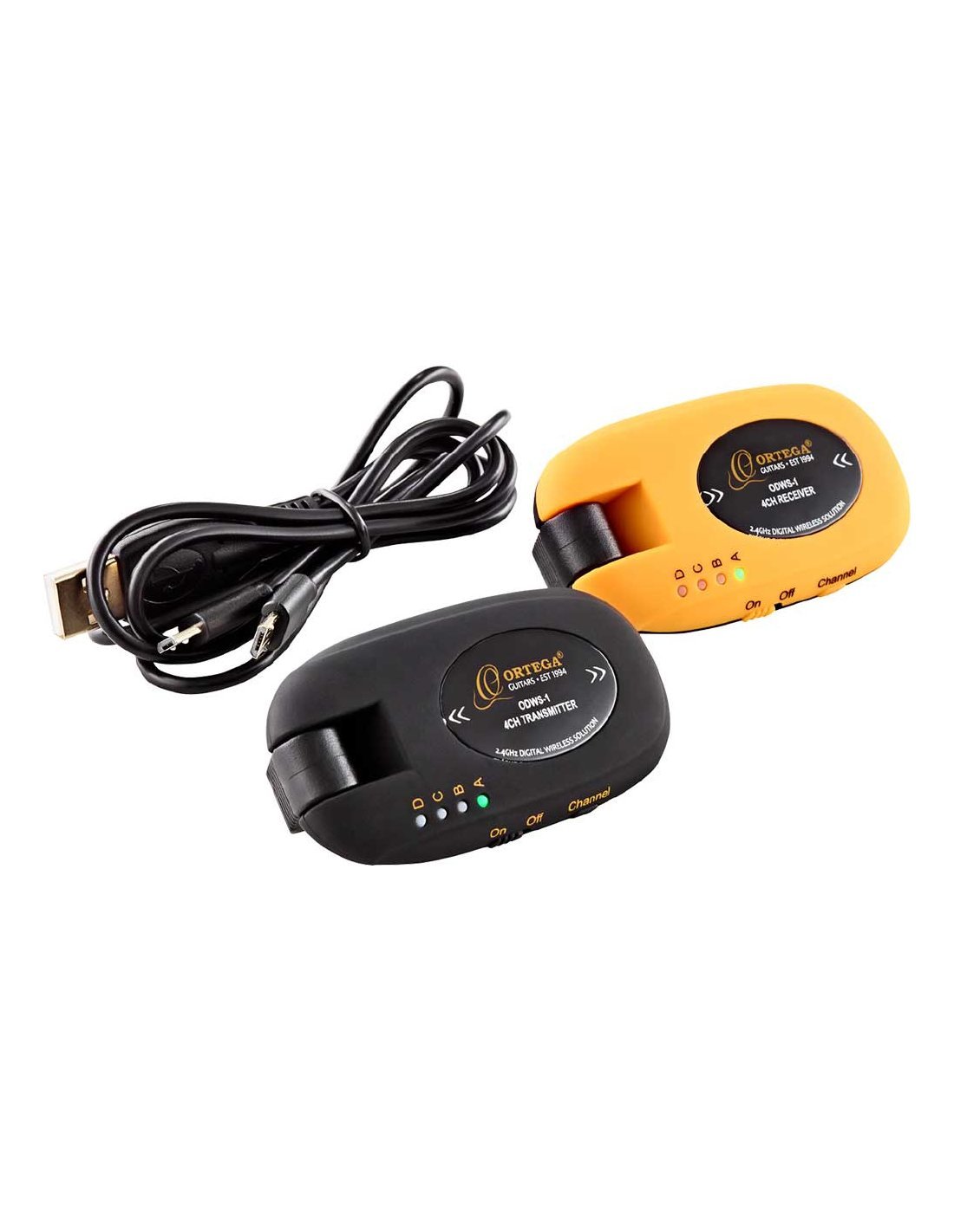 Wireless system for active and passive instruments. It works at 2.4 GHz ISM without interference. Up to 30 meters of coverage. With rechargeable batteries via USB for both the transmitter and the receiver. 5 hours of battery life. 4 selectable channels displayed with bright LEDs. Possibility to use 3 additional systems for a total of 4 simultaneous systems. 24-bit/48kHz transmission without compression. Plug and play. Stand by after 10 minutes of non-use. Includes black transmitter, orange receiver and USB charging cable.