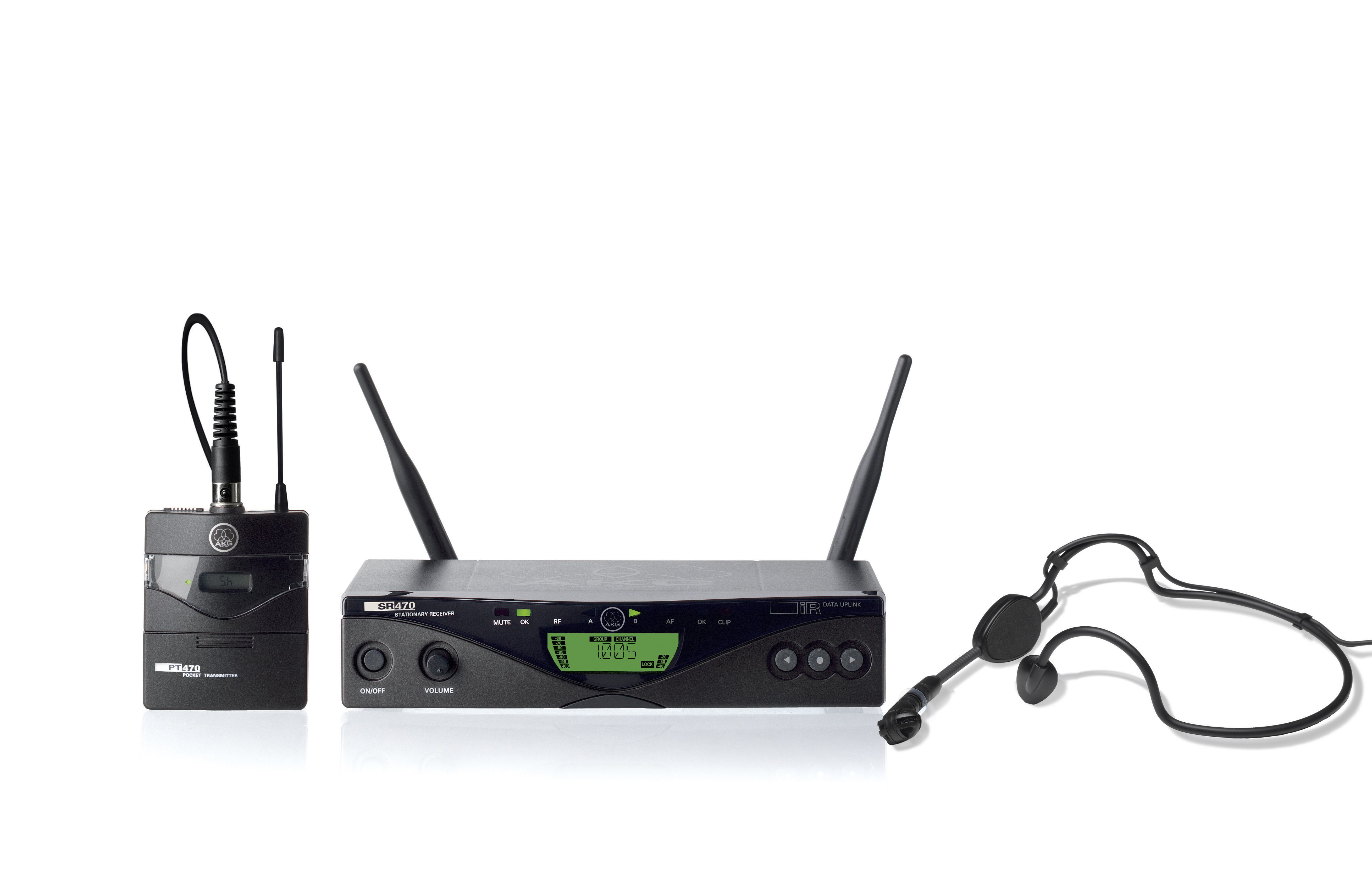 Wireless microphone system, SR470 receiver base, PT470 pocket transmitter, C544L headband, belt clip, AA battery, power adapter and rack mounting unit
