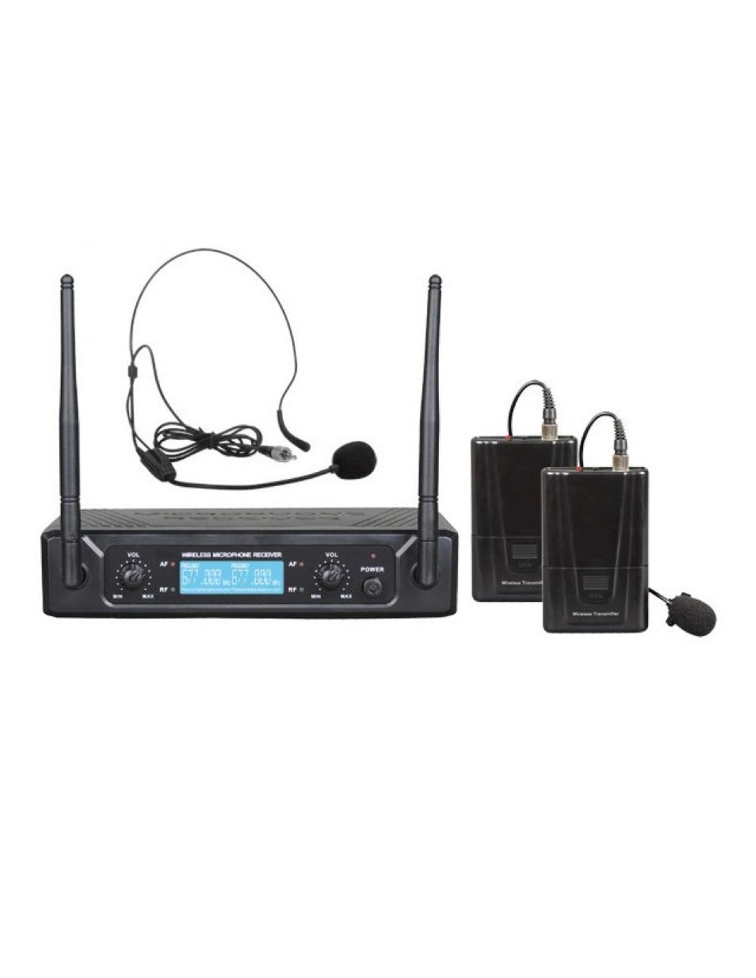 ZZIPP TXZZ520 R is a 674.20/694.00 fixed frequency UHF dual headband radio microphone. It includes receiver with dual antenna, volume control and display, 2 bodypack transmitters, 2