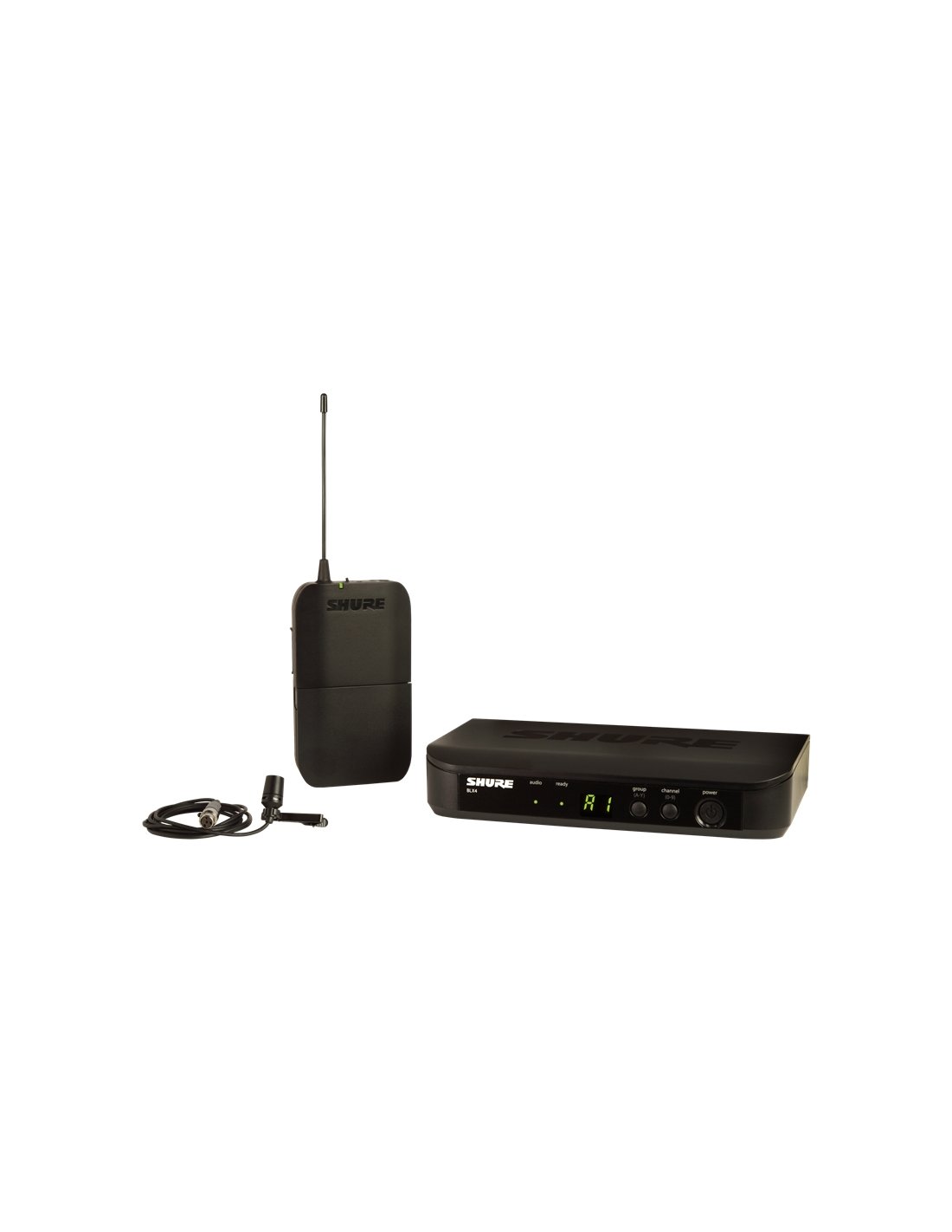 SHURE BLX14 CVL/M17 is a digital wireless microphone system (M17-Band): 662 - 686MHz, consisting of a BLX4 receiver, a BLX1 Bodypack transmitter and a Lavalier CVL microphone. Technical features include single-channel receiver with LED display for quick monitoring of system status, up to 12 systems simultaneously, QuickScan technology for frequency search and selection, BAL XLR/ UNBAL TRS outputs, power supply included. BLX1 bodypack transmitter with LED display, operation with 2 AA batteries with 14 hours of battery life, clip for attachment to clothing. CVL lavalier microphone with cardioid polar pattern miniaturized condenser capsule