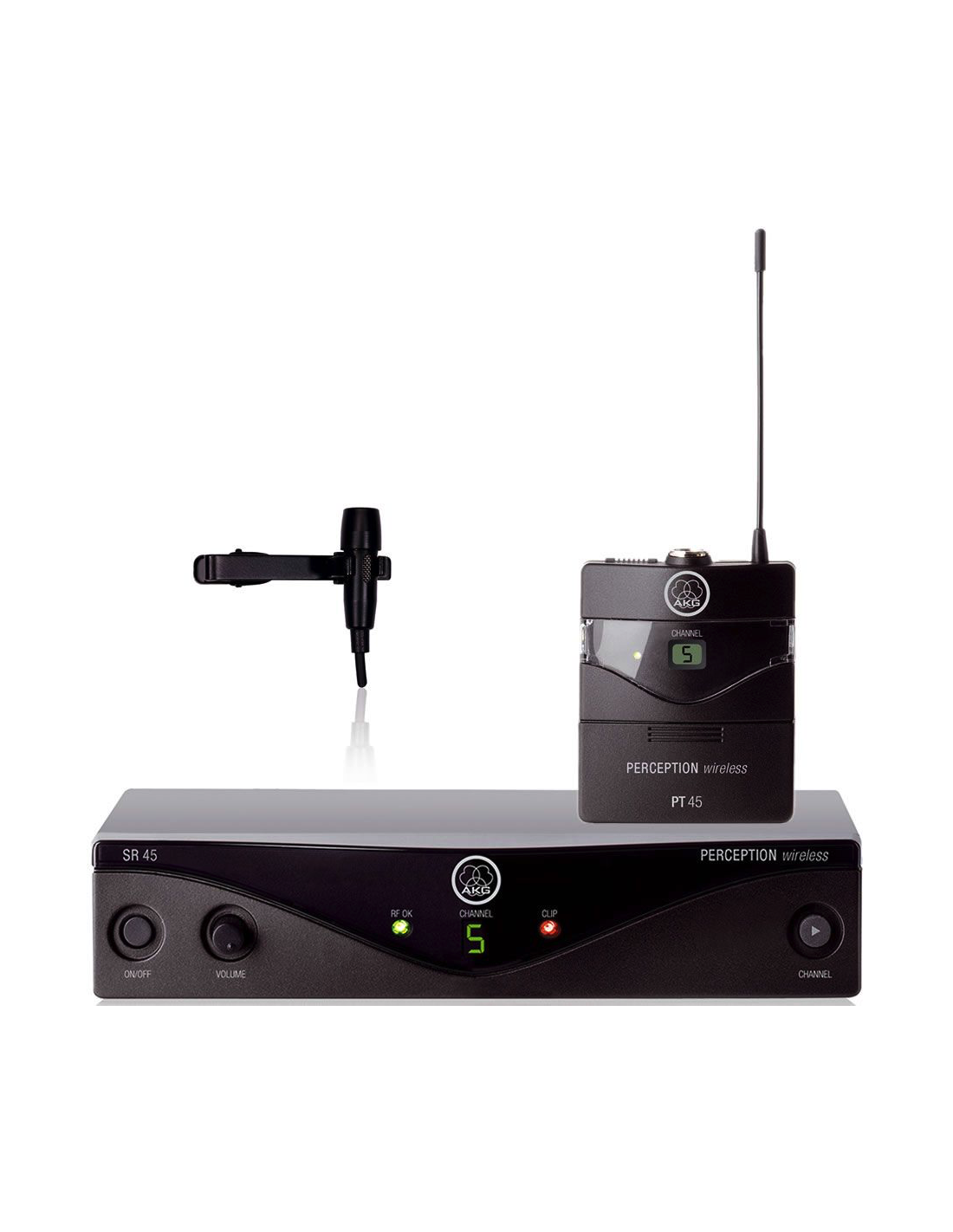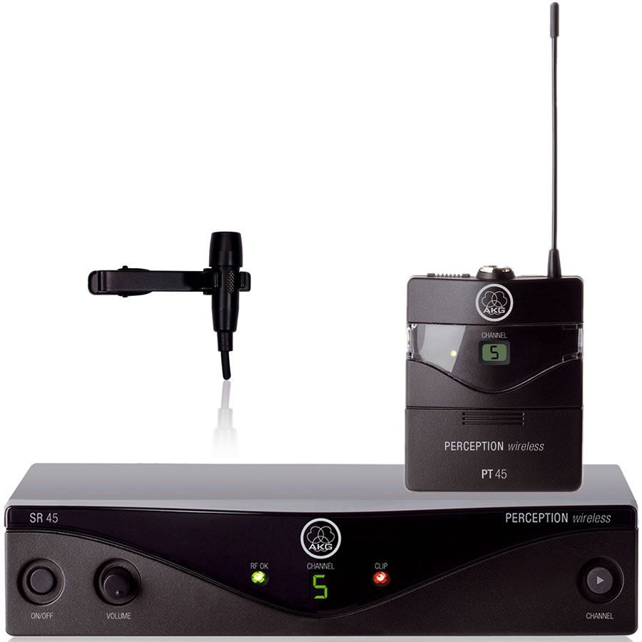 AKG WMS45 PERCEPTION PRESENTER SET 614.100-629.300. Wireless microphone system that includes an SR45 receiver, compatible with all transmitters of the Perception wireless system, and a PT45 bodypack transmitter with a CK99 lavalier microphone. The receiver operates on a bandwidth of up to 30 MHz and can be switched to 8 different selectable frequencies, and both dynamic and condenser microphones can be connected to the transmitter. Includes pop filter, lavalier microphone attachment clip and SMPS switching