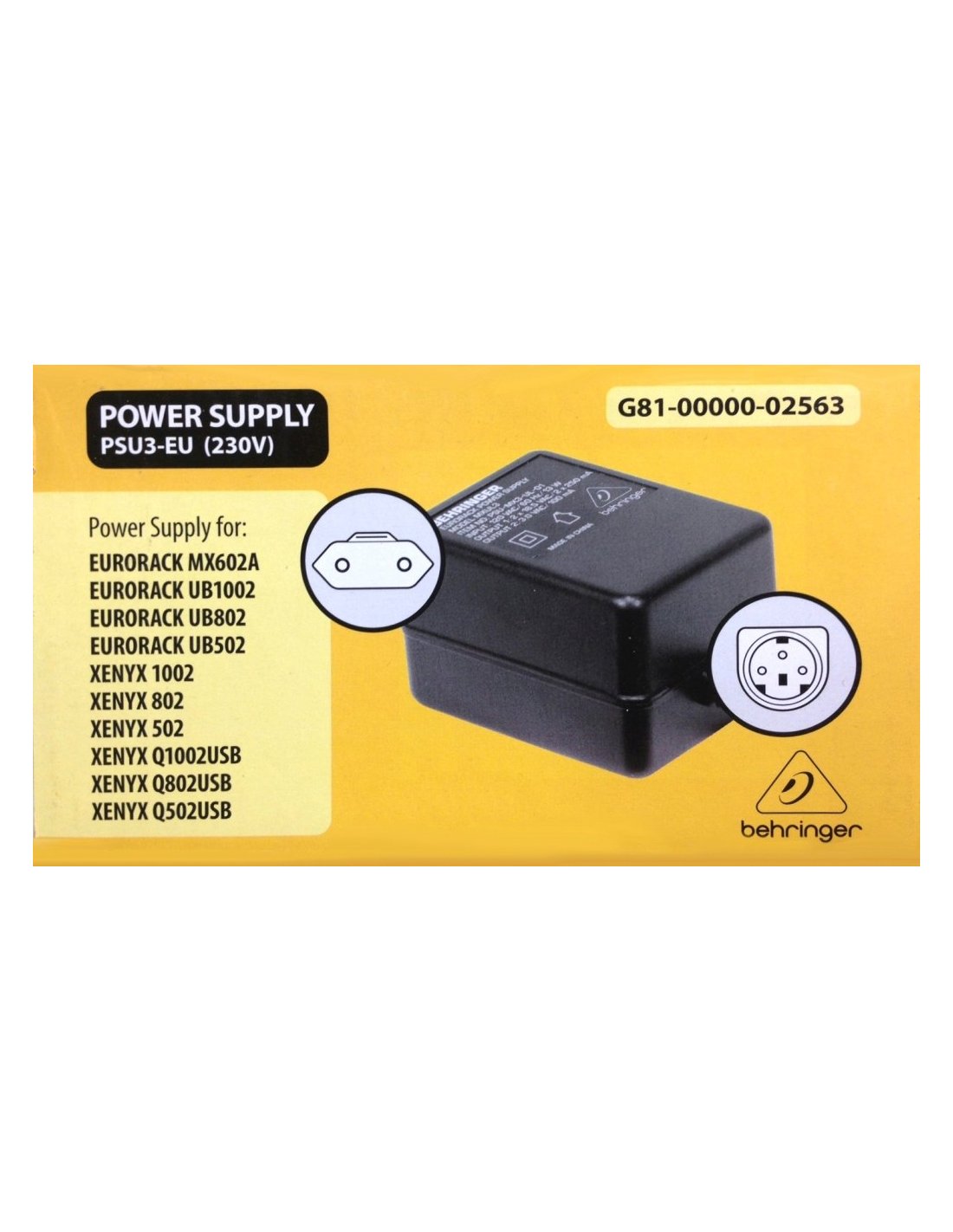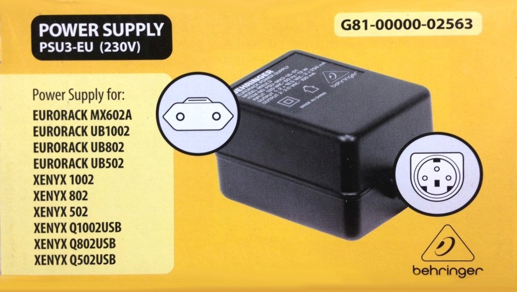 BEHRINGER PS3EU est un adaptateur secteur de remplacement UE 230V pour MX602A, UB502, UB802, UB1002, XENYX (502, 802, 1002), Q502USB, Q802USB et Q1002USB.