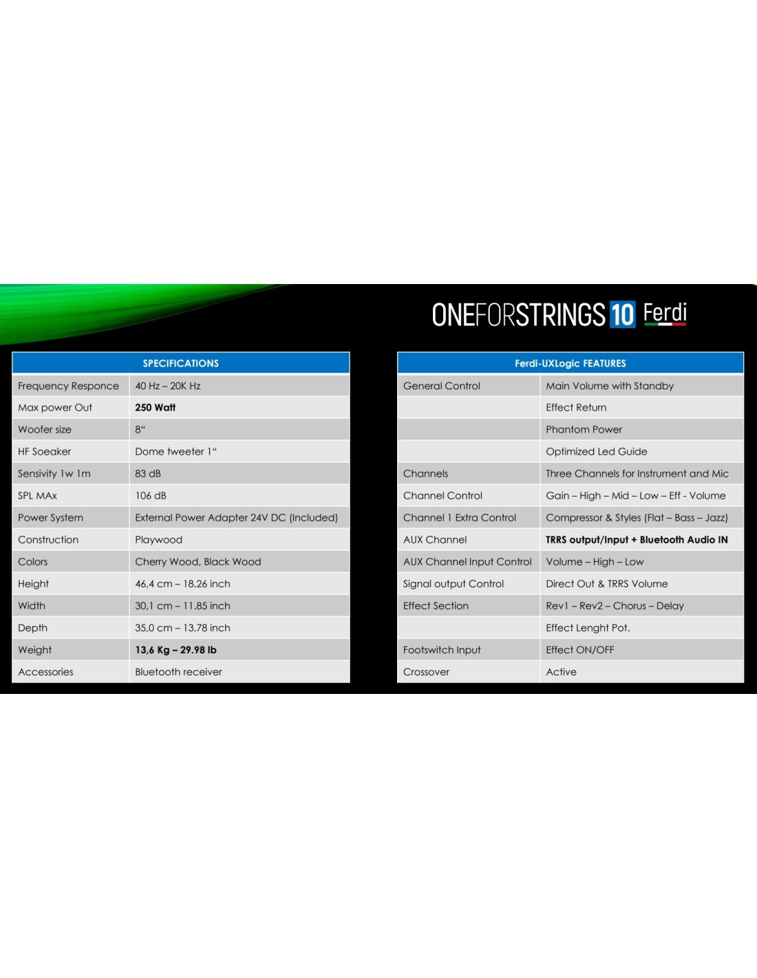 ONEFORSTRINGS 10FERDI è, un amplificateur pour guitare acoustique et classique de 350 Watts équipé de 3 entrées séparées + une entrée Aux