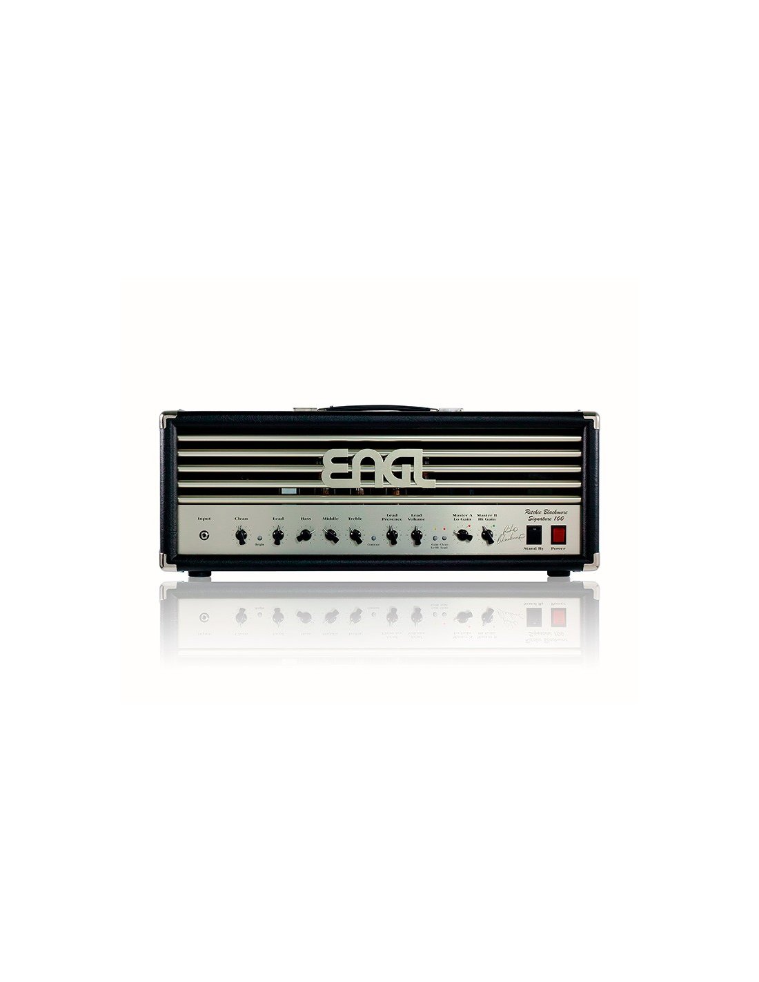 RITCHIE BLACKMORE SIGNATURE - Tête pour Guitare Électrique 100 Watt - Fabriqué en Allemagne - 4 Canaux - Contrôles : Clean + Switch Bright + Lead + Bass + Middle + Treble + Switch Contour + Lead Presence + Lead Volume + Switch Gain Lo/Hi + Switch Clean/Lead + Master A + Master B + Standby + Power - Entrées : 1x Input - Boucle d'effets : 1x Send/Return avec contrôle Dry/Effect - Sorties : 5x Poweramp Output 4/16 Ohm - Footswitch : 1x MasterA-B/Contour + 1x Clean-Lead/Gain Lo-Hi + Port personnalisé pour contrôleur ENGL Z-5 - Master A-B commutable - Contour commutable - Gain Lo/Hi commutable - Lampes Pré : 4x ECC83 - Lampes Finale : 4x 5881 - Dimensions : 71x27x27 cm - Poids : 20 Kg.
