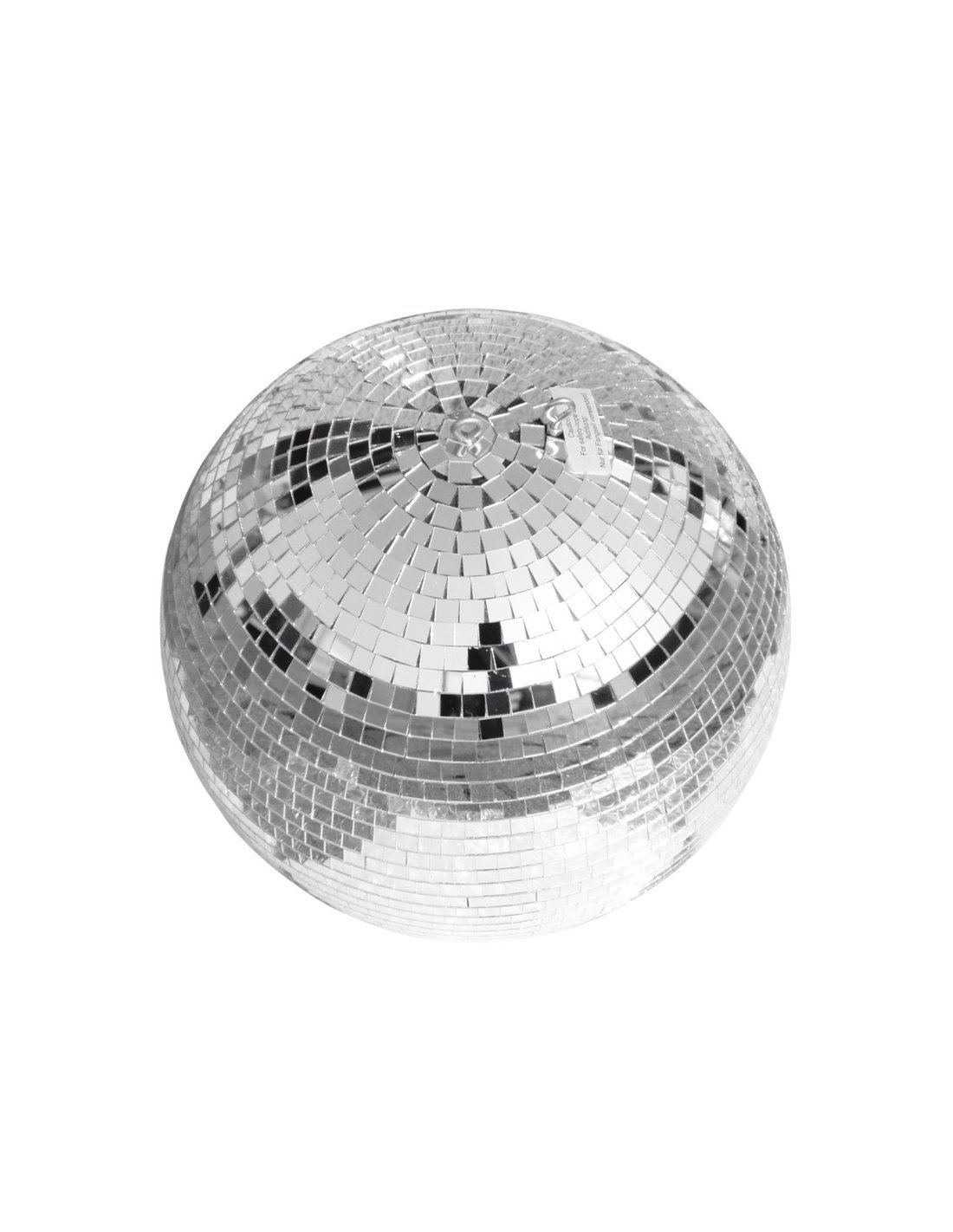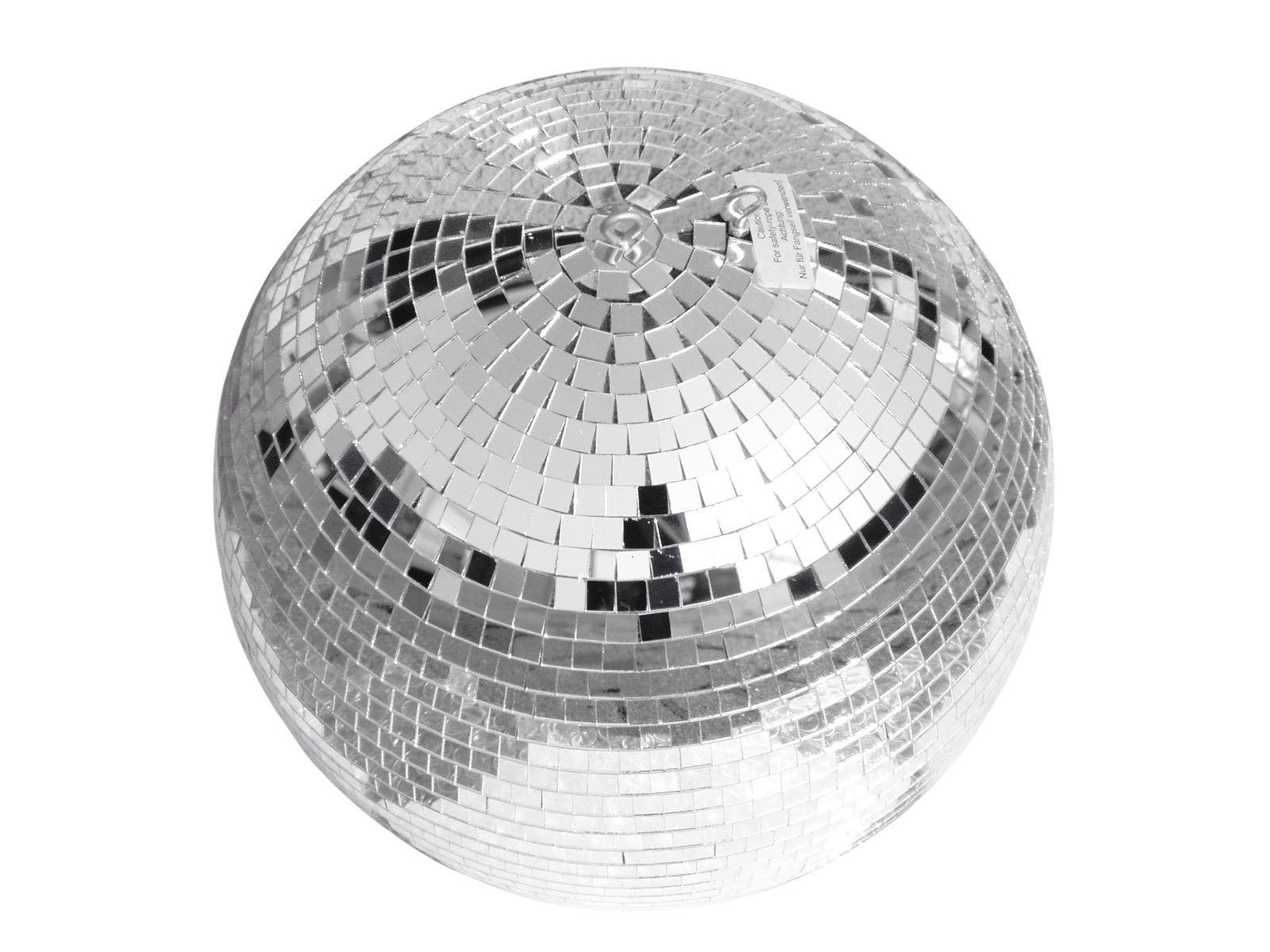 BALLE MIROIR EUROLITE 30 CM. Boule miroir avec une structure en plastique de 30 cm de diamètre, constituée de morceaux de miroir de 10x10 mm avec un œillet pour installation murale/plafond. Fournie sans moteur.