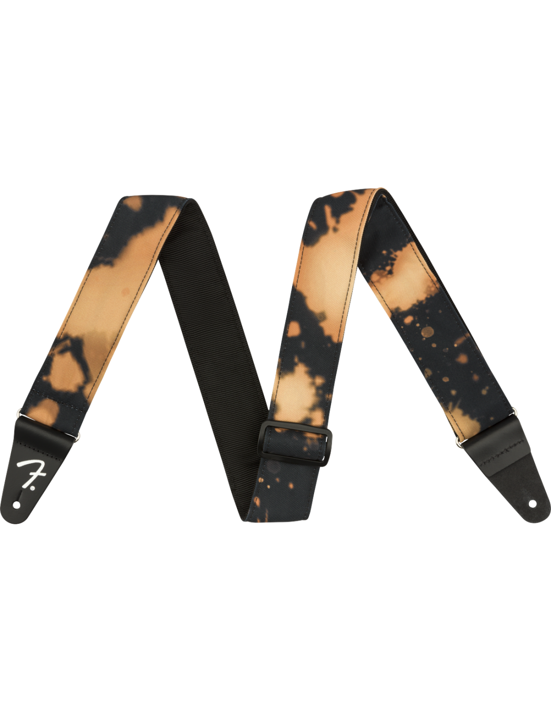 FENDER STRAP TYE DYE ACID WASH BLACK. Sangle pour guitare ou basse avec un design à éclaboussures de javel sur toile décolorée avec des embouts en cuir, 5 cm de largeur et longueur réglable de 86 à 150 cm.