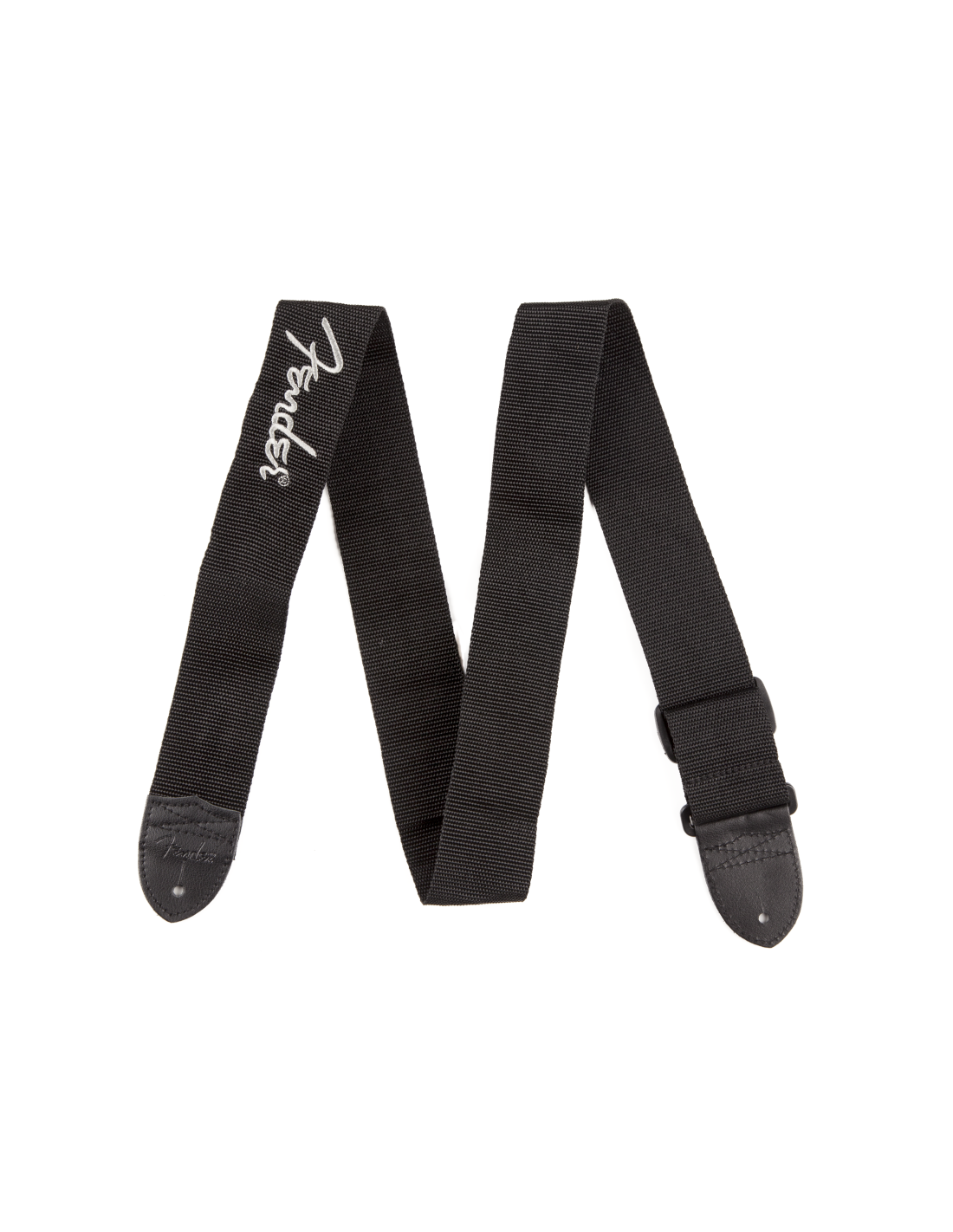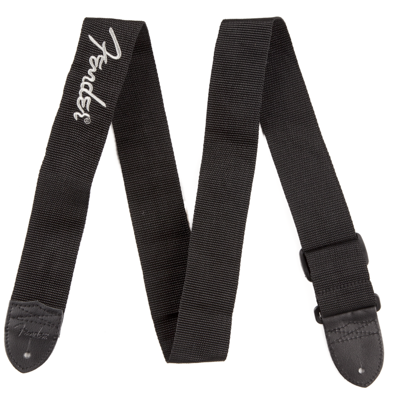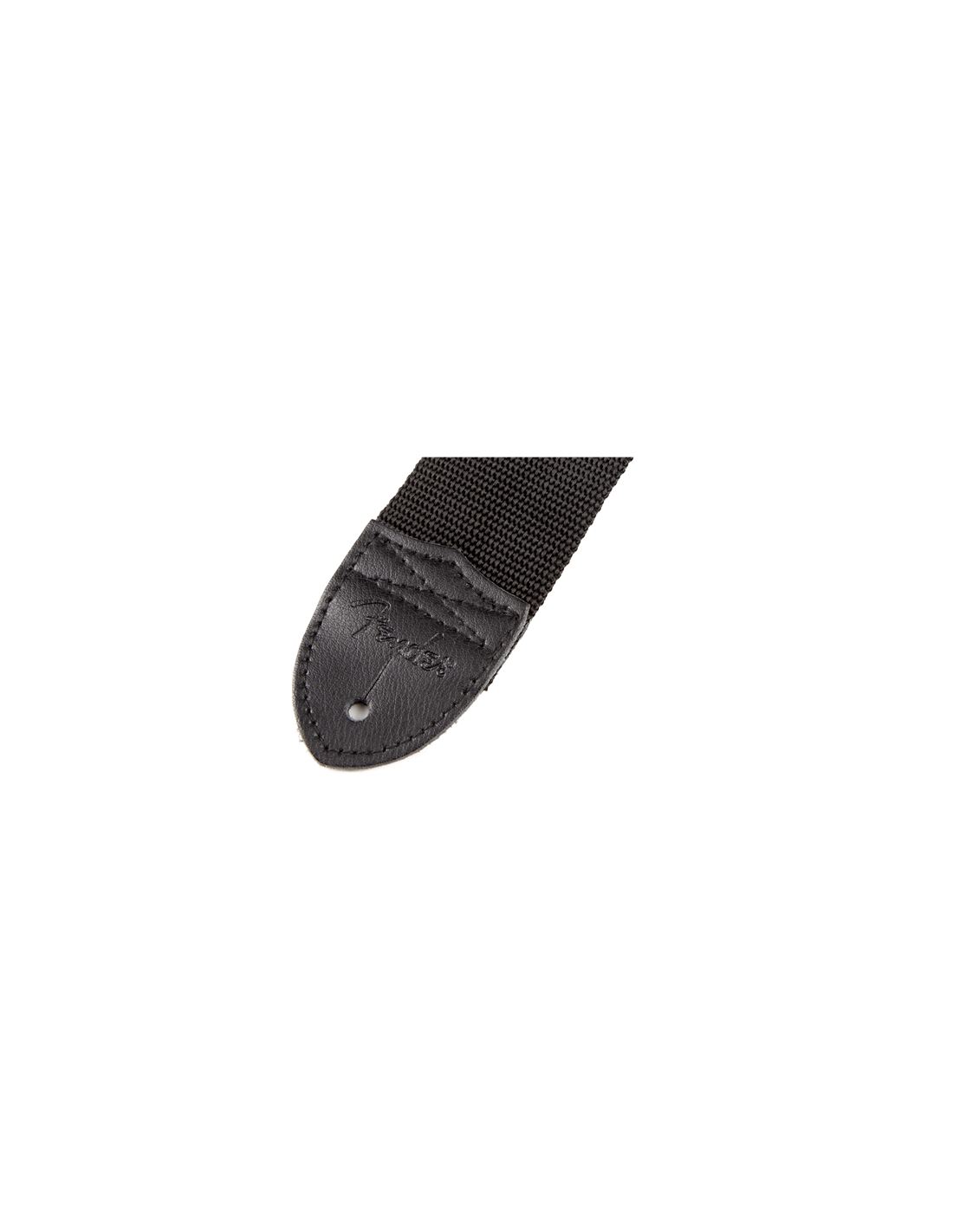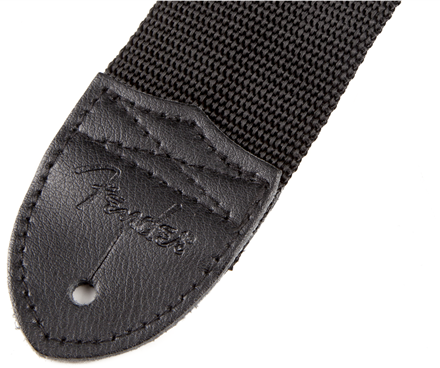 FENDER STRAP POLY BLACK PEWTER LOGO est une sangle en polyester avec une longueur réglable entre 83 et 134 cm, une largeur de 5 cm, des extrémités renforcées en cuir, un logo Fender blanc brodé en relief, poche intégrée pour médiators.