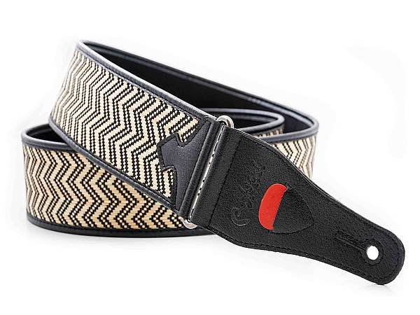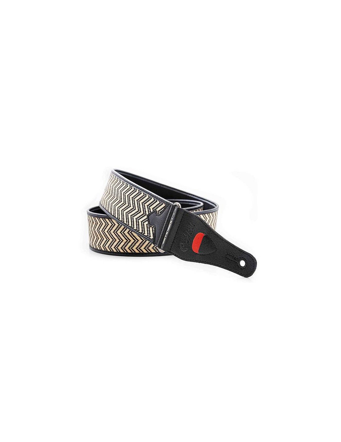 Bandoulière fabriquée de manière artisanale avec des matériaux écologiques, respectueux de l'environnement et sans aucun tissu animal, caractérisée par une légèreté incroyable, un confort élevé et des finitions soignées dans les moindres détails. Finition supérieure en raphia tressé à la main avec des décorations reproduisant le symbole V de victoire. Porte médiators incorporé. Couleur noire avec décorations beiges, largeur 6 cm, longueur réglable de 90 cm à 150 cm. Indiquée pour guitare.