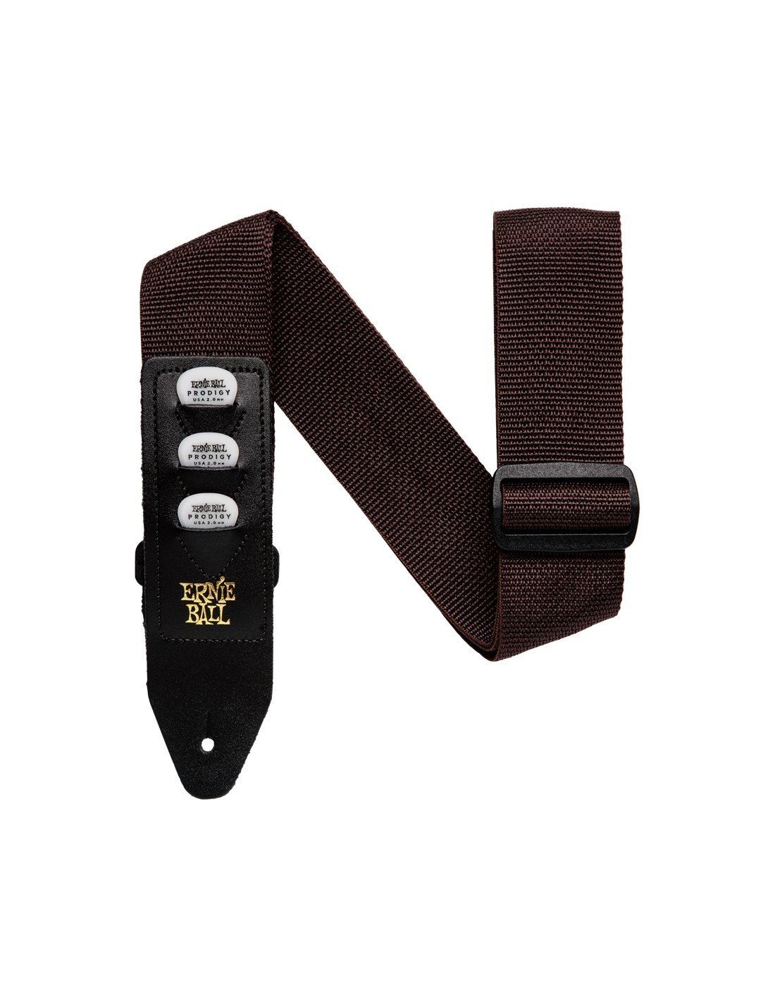La sangle 4250 Pickholder d'Ernie Ball est la sangle pour guitare et basse dans la finition marron, conçue avec une extrémité en cuir qui vous permettra de placer jusqu'à trois médiators en les logeant sur la partie frontale de la sangle.