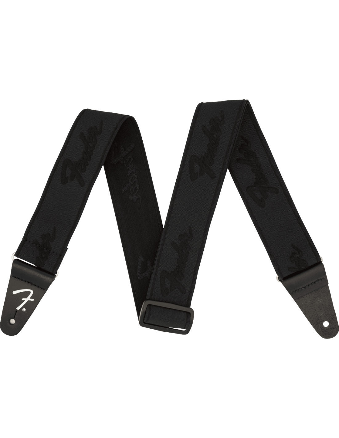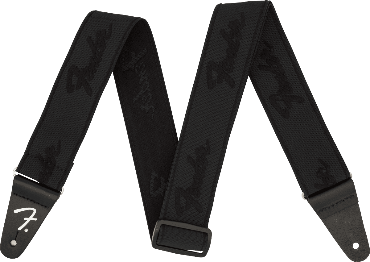 Sangle Fender Strap Weighless Running Logo, couleur Noir. La sangle Fender Strap Weighless Running Logo est tissée en Polyester et Spandex, pour garantir une grande élasticité qui soulage le poids de la guitare sur l'épaule, pour un confort maximal. Réglable de 86 à 150 cm, largeur 5 cm.