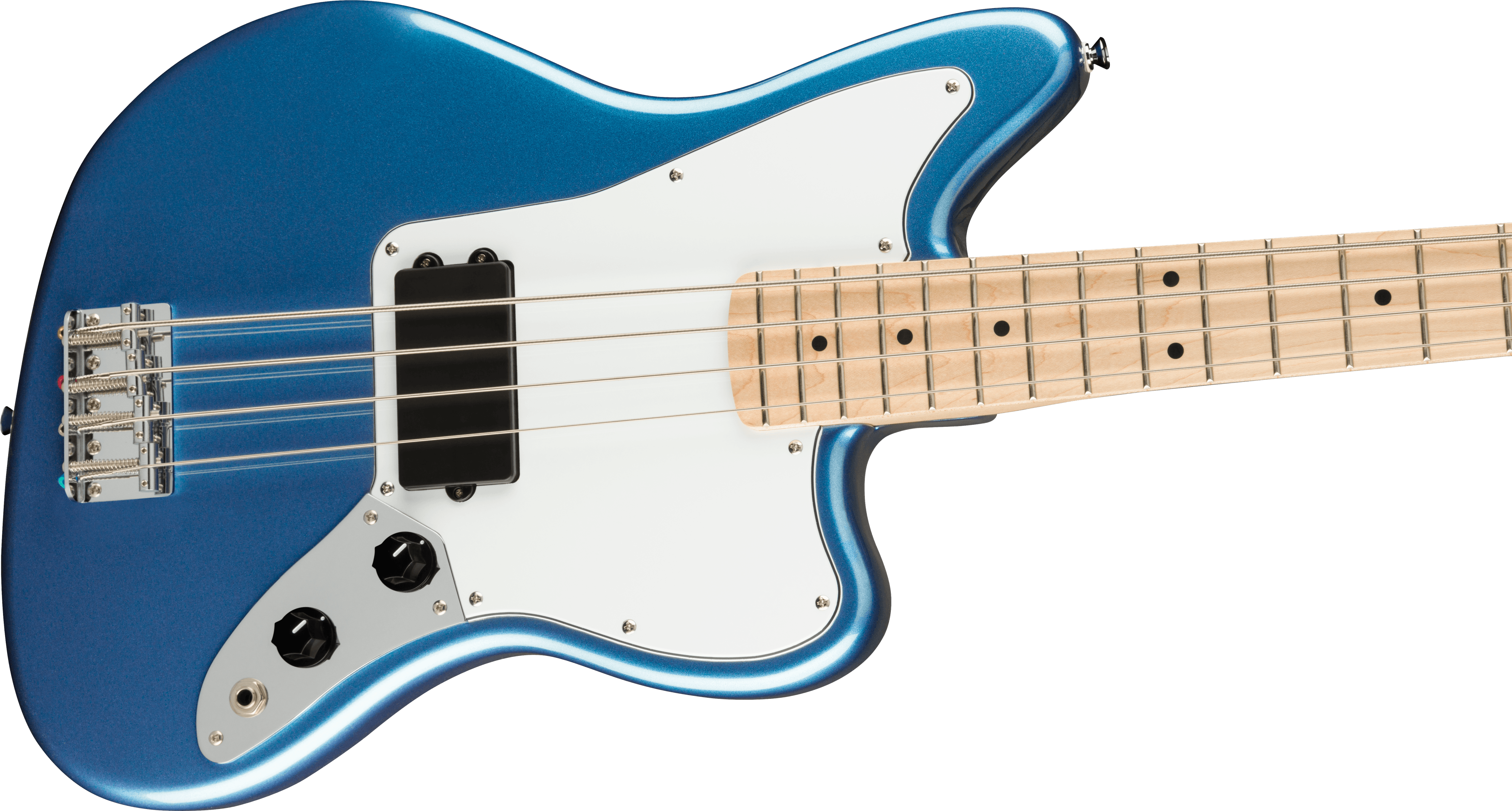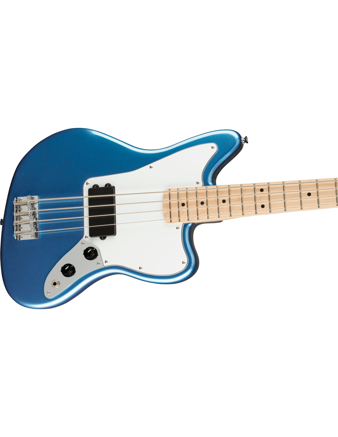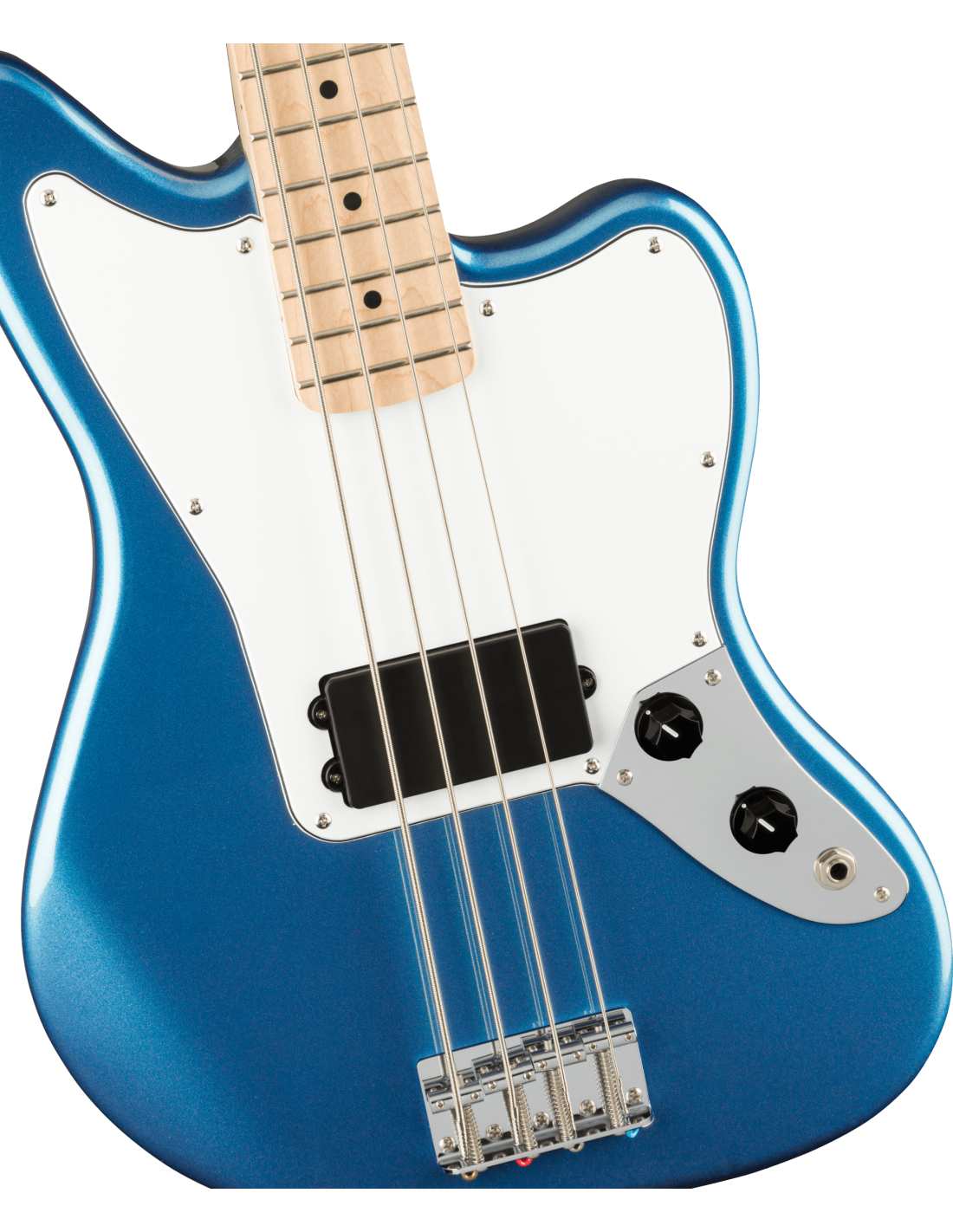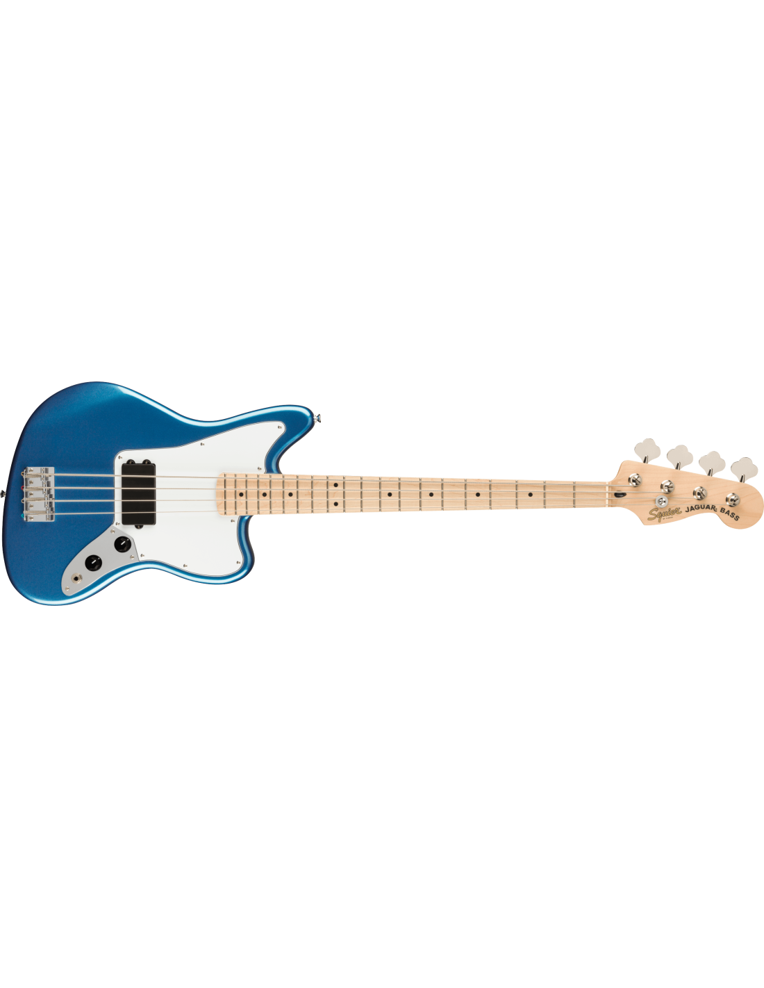 SQUIER AFFINITY JAGUAR BASS WPG LPB est une basse électrique à 4 cordes, modèle Affinity Series Jaguar Bass, avec un corps en peuplier et une finition en polyuréthane brillant, un manche en érable en forme de "C", un doigté en érable avec un rayon de 9,5" et 20 frettes Medium Jumbo et des incrustations Black Dots avec des points latéraux noirs, un pickguard noir, un truss rod à réglage standard, un sillet en os synthétique, un matériel nickelé, des mécaniques de style vintage avec un abaisse-cordes de style vintage et un pont standard à 4 sellette. L'électronique se compose d'un pickup Humbucker Squier Ceramic humbucking avec un contrôle de volume maître et un contrôle de tonalité maître.