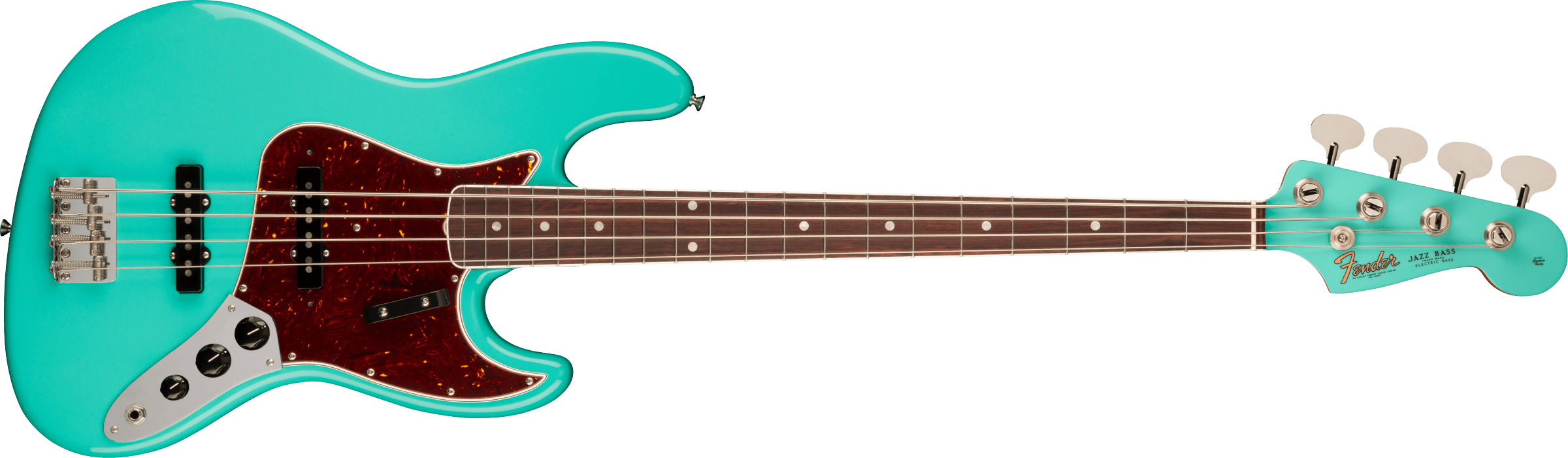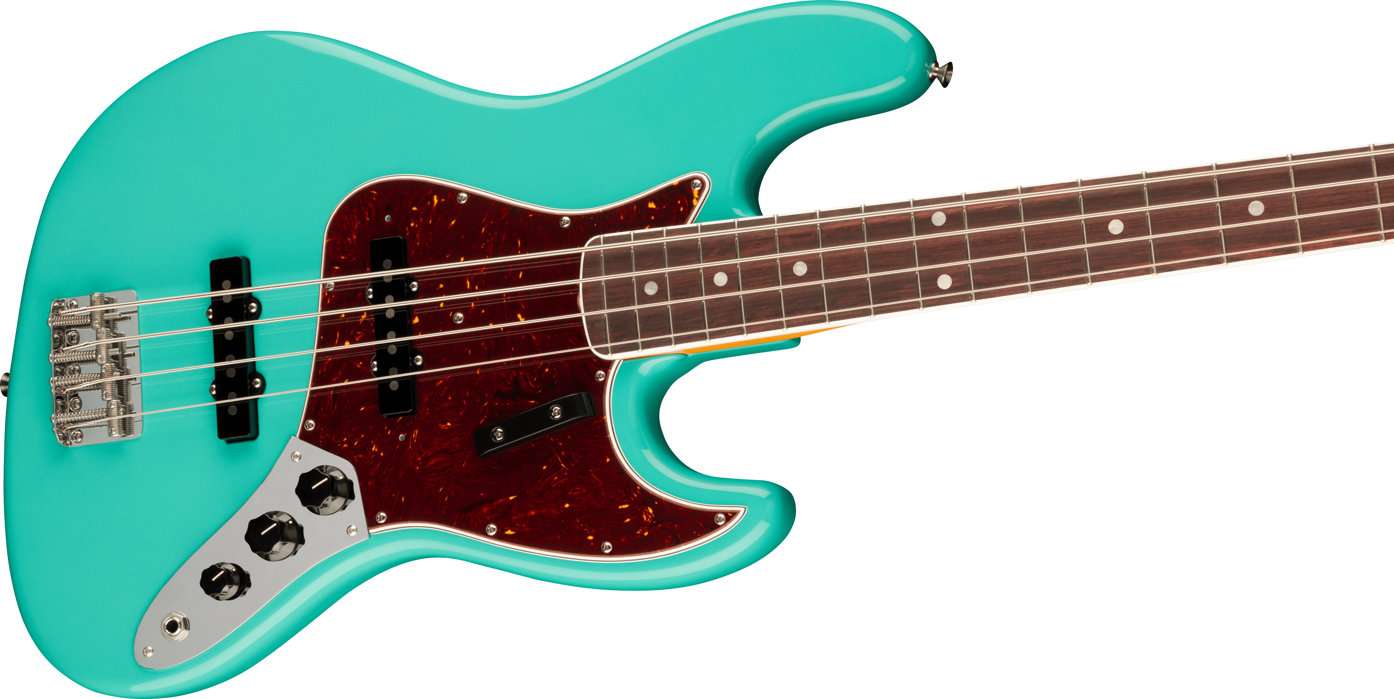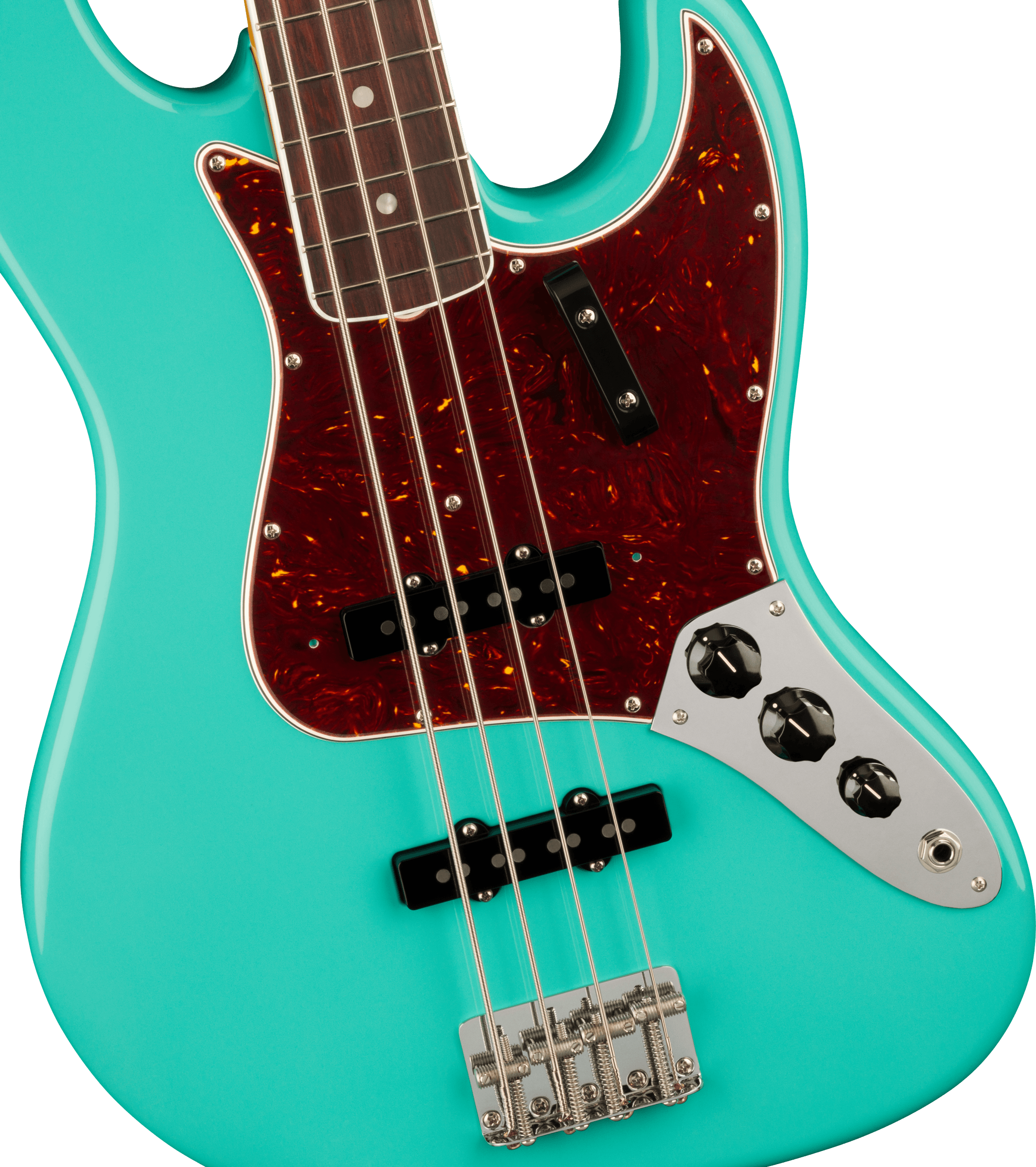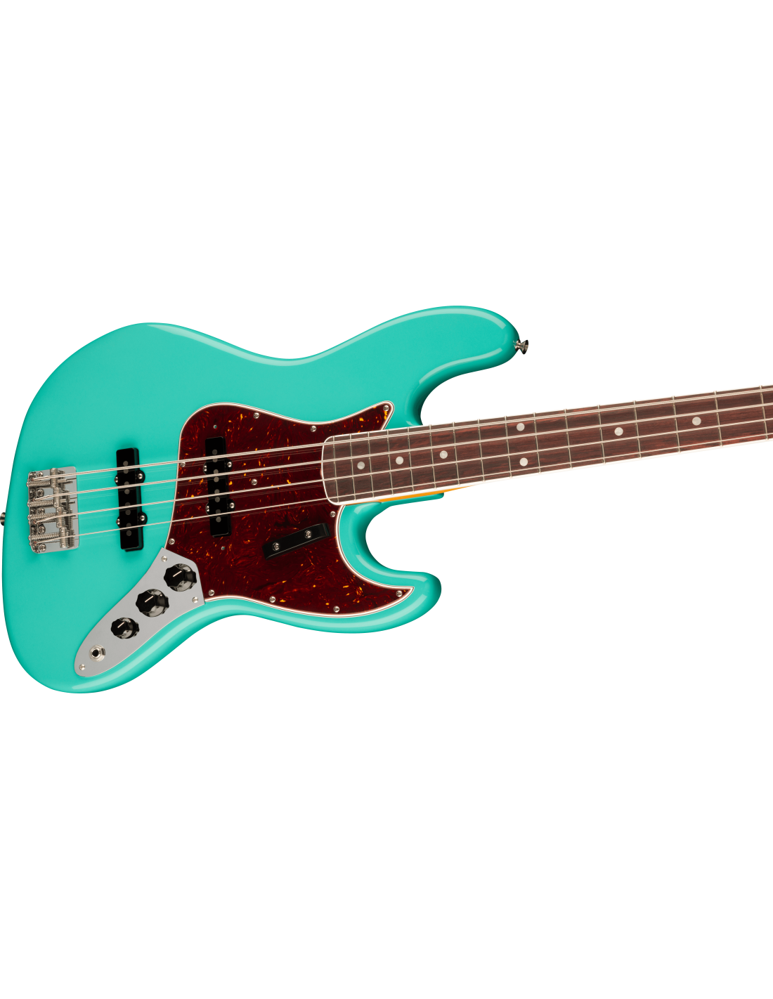 FENDER AM VINTAGE II 66 JAZZ BASS RW SFMG est une basse électrique à 4 cordes, modèle American Vintage II 1966 Jazz Bass, avec un corps en Alder (aulne) et une finition Gloss Nitrocellulose Lacquer, un manche en érable canadien à profil 1966 "U", une touche "Round-Lam" en Palissandre avec un rayon 7,25" et 20 frettes Vintage Tall et des incrustations White Pearloid Dot avec des points latéraux Black, un pickguard 4-Ply Tortoiseshell, une tête assortie, un Truss Rod Vintage-Style Butt Adjust, un sillet en os, un matériel nickelé, des mécaniques Pure Vintage "Lollipop" avec un abaisse-cordes Vintage-Style Disc et un pont Fender Pure Vintage à 4 sellette. L'électronique se compose de 2 micros Pure Vintage '66 Single-Coil Jazz Bass avec 2 contrôles Volume et Master Tone. Inclut la housse Fender Vintage-Style Black.
