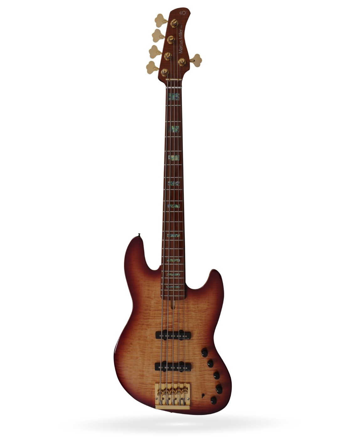 Corps : Frêne (swamp ash) avec érable massif, placage flammé. Format du corps : Nouveau type Jazz Marcus Miller. Manche : érable torréfié avec finition satinée. Manche : Profil en C. Échelle : 34''. Jonction : Bolt-on. Touche (bords roulés) : érable torréfié. Rayon : 9,5''. Frettes : 2.4 Medium. Sillet : 5 cordes, 46mm, Os naturel. Incrustations : Rectangulaires en Abalone. Micro : Ensemble Marcus Premium-J Revolution. Électronique : Marcus Heritage-3 avec contrôle des médiums. Contrôles : Volume / Ton (Dual Pot) Mélangeur de micro Mediums (Dual Pot) Graves, Mini Toggle (actif / passif). Boutons : Aluminium noir. Pont : Hipshot Kickass. Mécaniques : Hipshot USA Ultralite. Matériel : Doré. Plaque de protection : Transparente. Étui inclus. Finition : Tobacco Sunburst.