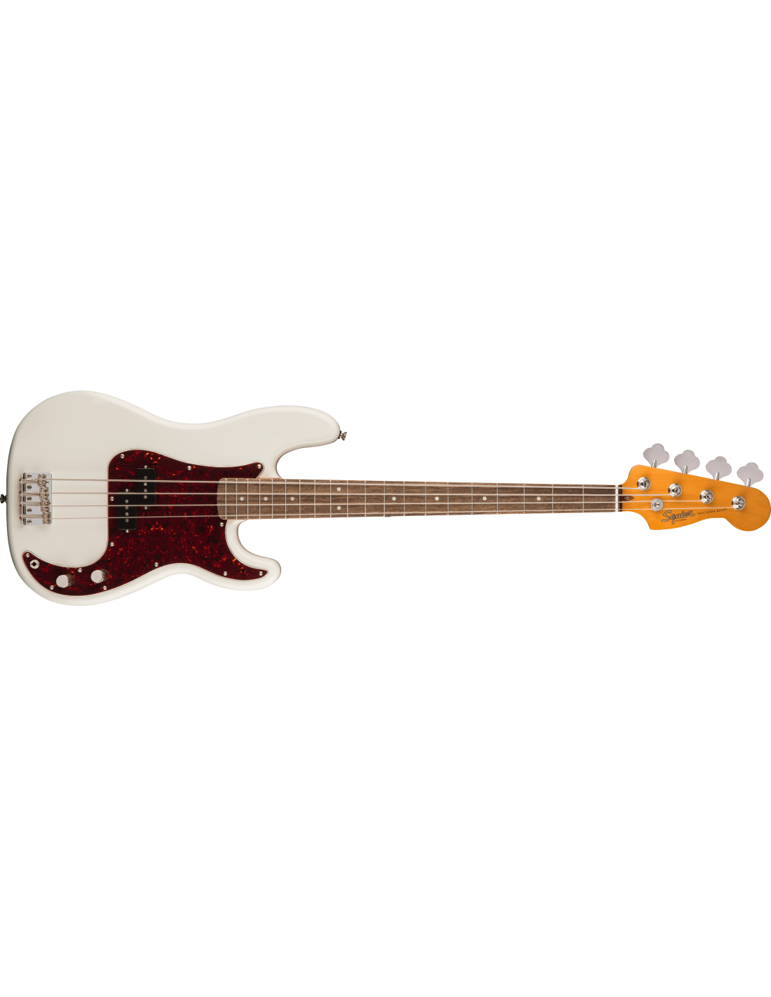 SQUIER CV 60s PRECISION BASS LRL OWT est une basse électrique à 4 cordes, modèle Classic Vibe '60s Precision Bass, avec un corps en peuplier et une finition en polyuréthane brillant, un manche en érable en forme de profil "C", un doigté en laurier indien avec un rayon de 9,5" et 20 frettes Narrow Tall et des incrustations White Pearloid Dot, un pickguard en tortue 4-Ply, un truss rod à réglage standard, un sillet en os synthétique, un matériel en nickel, des mécaniques de style vintage avec un abaisse-cordes Vintage-Style Disc et un pont standard à 4 sellette zigrinées. L'électronique consiste en un système de micros Fender Designed Alnico Split Single-Coil avec contrôle de volume maître et tonalité maître.
