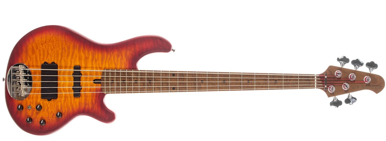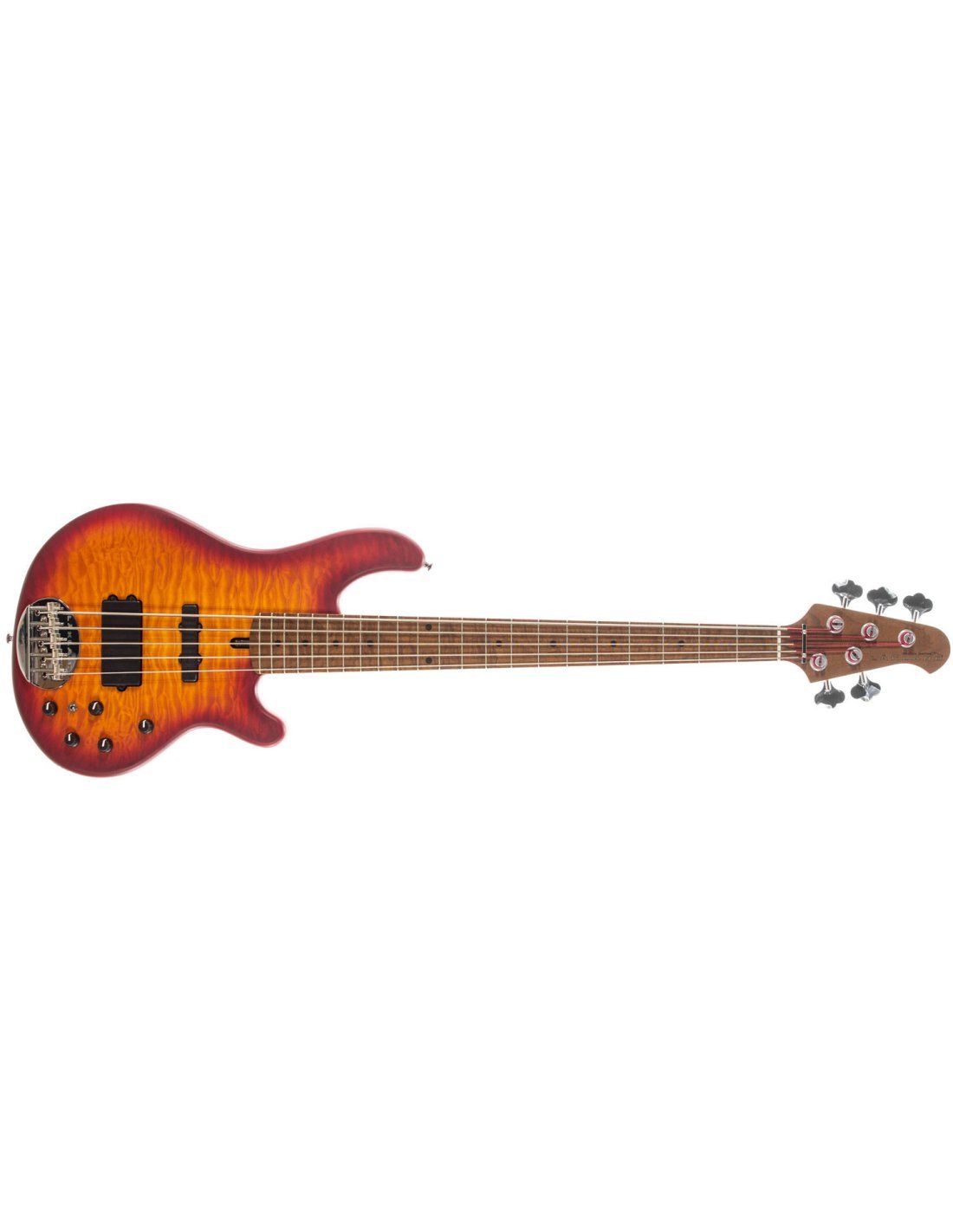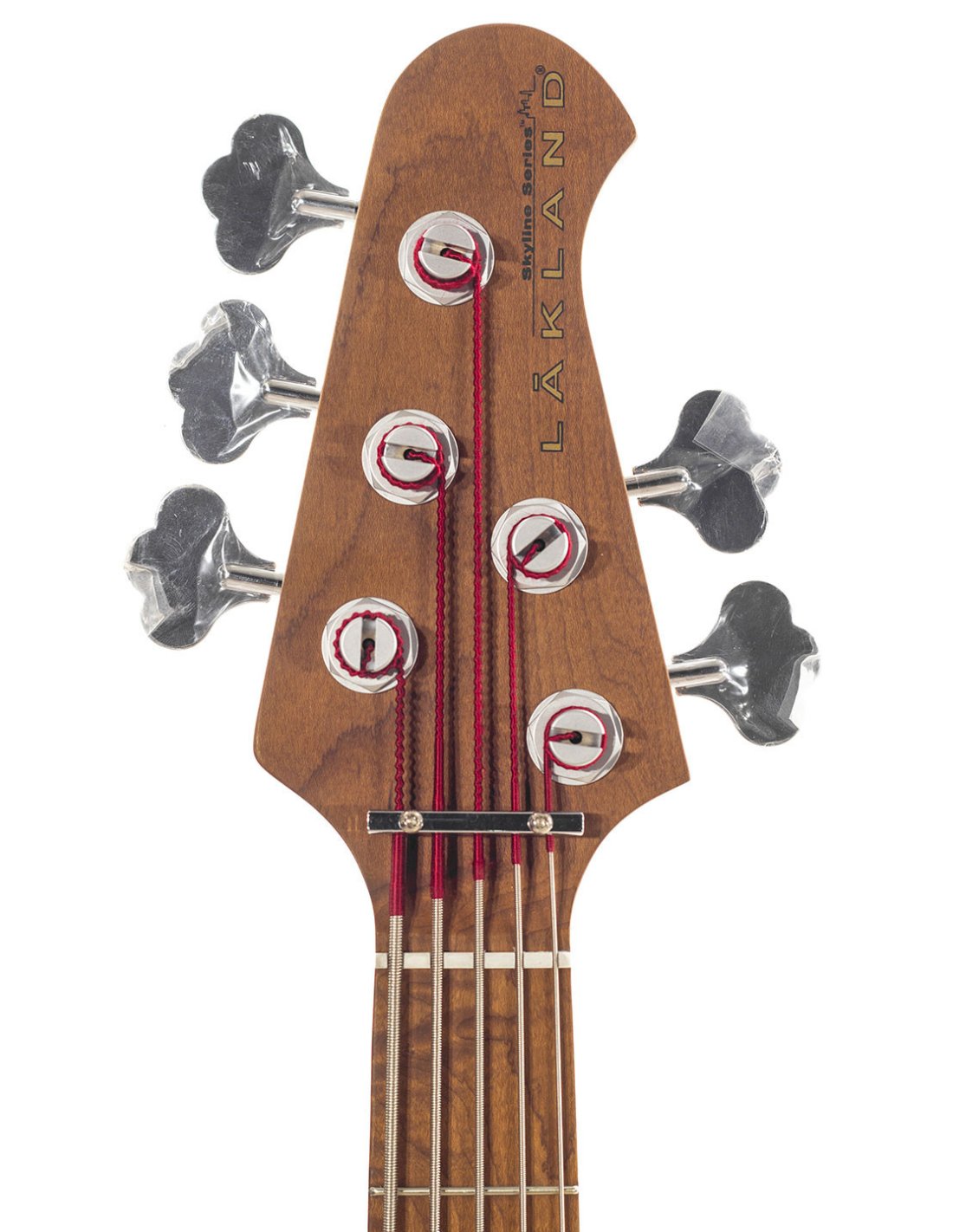 LAKLAND SKYLINE 5502 DELUXE CHERRY BURST SATIN est une basse électrique à 5 cordes, modèle Skyline Series 55-02 Deluxe, avec un corps en frêne et un dessus en érable quilté, un manche bolt-on en érable rôti avec des barres de renfort en graphite, un touche en érable rôti à rayon composite 10"-13" avec 22 frettes Jumbo et des incrustations Black Dot, un sillet en os de 45 mm, un matériel Chrome, des mécaniques Hipshot Ultra-Lite et un pont Lakland Dual Access (à travers le corps ou à travers le pont). L'électronique active à configuration HS consiste en un ensemble de micros Lakland MM-J avec préampli Lakland LH3 intégré et contrôles Bass, Midrange, Treble, contrôle de mélange de micros, volume principal avec push/pull pour bypass du préampli et interrupteur à 3 voies pour le contrôle de la bobine du humbucker au pont.