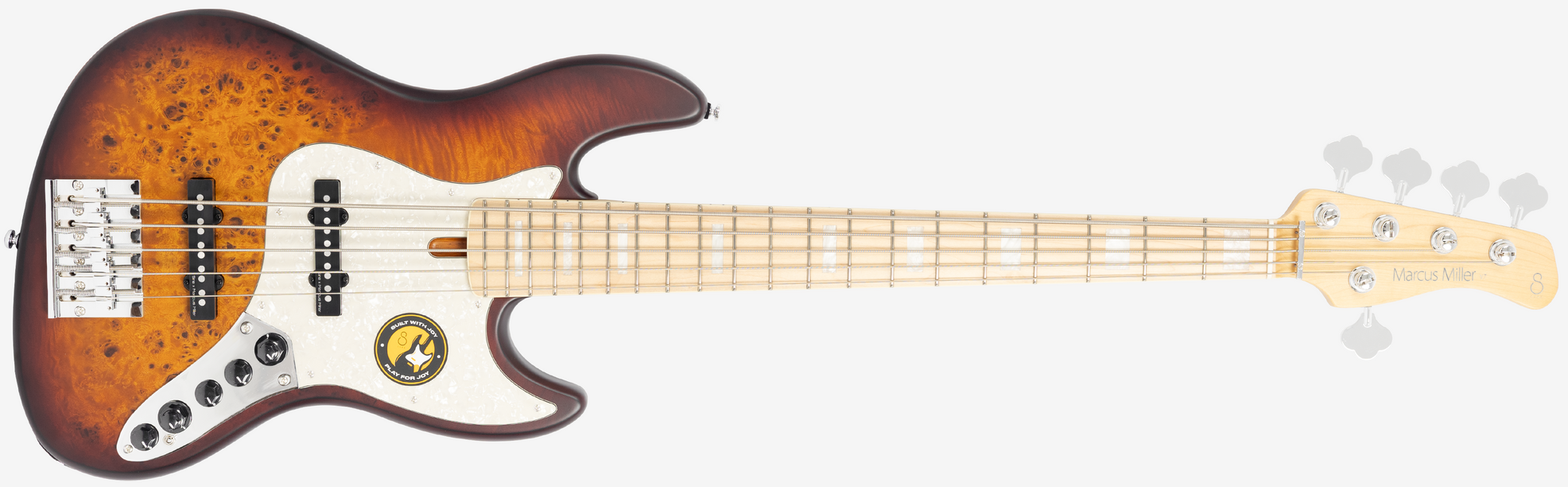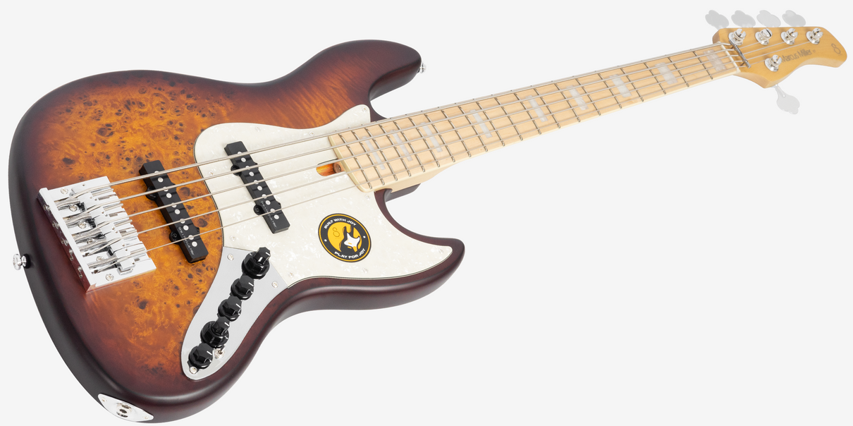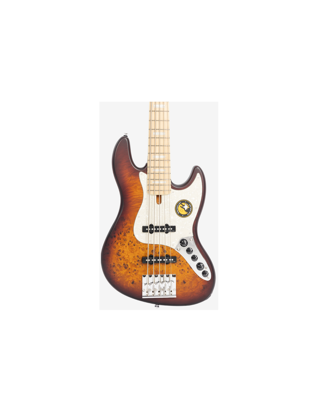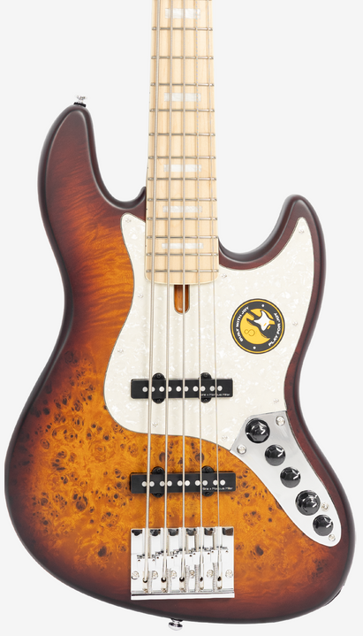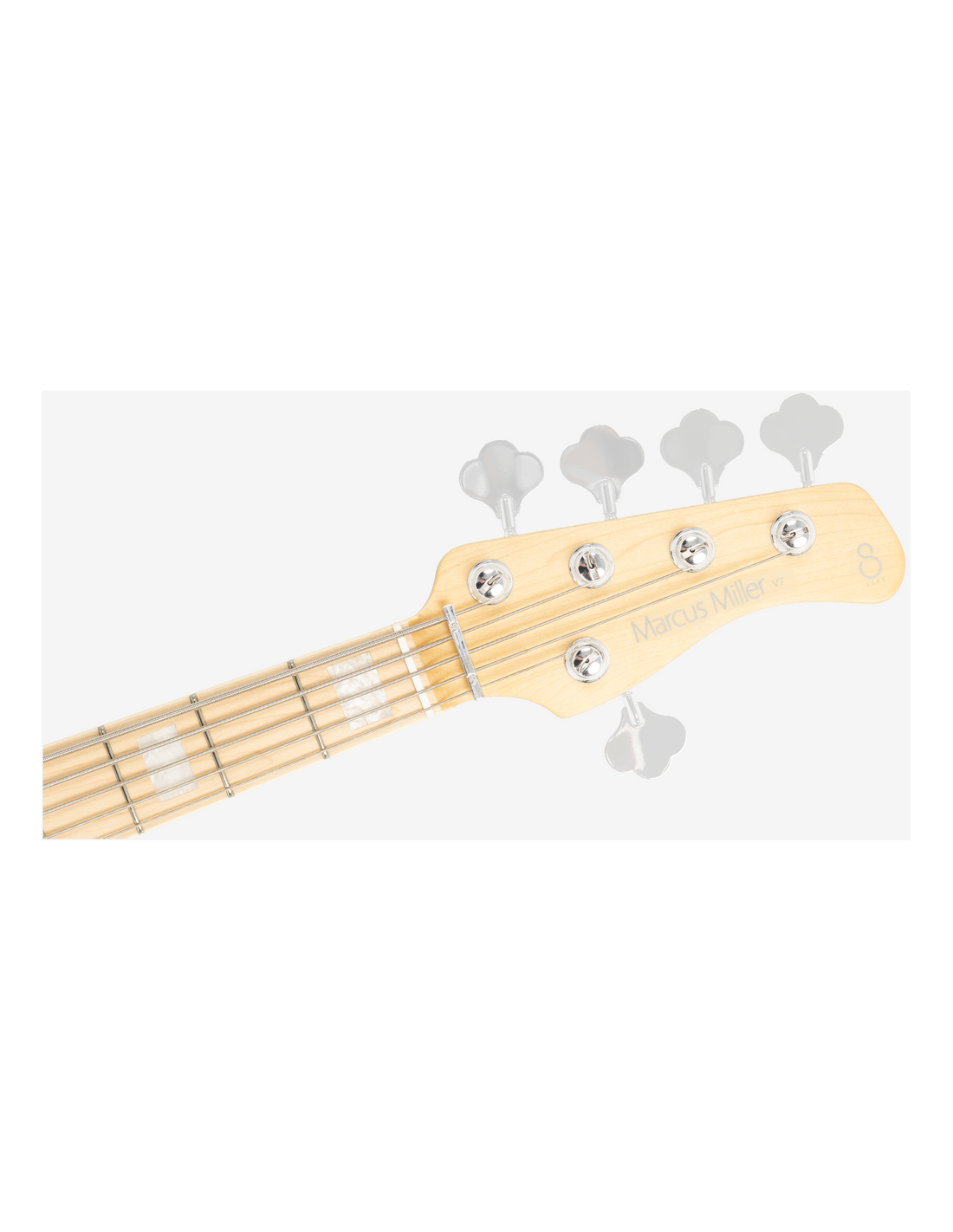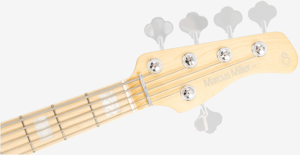 MARCUS MILLER V7 5 SWAMP ASH REISSUE TS est une basse électrique à 5 cordes, modèle Sire Marcus Miller V7 ASH REISSUE 5-String, avec un corps en Swamp Ash (frêne de marais) et un dessus en placage de peuplier, forme Marcus Miller Jazz Shape, manche en érable dur à profil "C" Shape, touche en érable dur Edgeless à rayon 9,5" avec 20 frettes Medium et incrustations White Pearloid Block, sillet de 46mm en os, matériel Chrome, mécaniques Premium Open Gear et pont New Marcus Heavymass II Bridge. L'électronique active à configuration JJ consiste en un ensemble de micros Marcus Super-J Revolution Set avec préampli Marcus Heritage-3/3band EQ, contrôle Volume/Tone, interrupteur Actif/Passif, contrôle Blender et contrôles Treble, Bass et Middle avec contrôle de fréquence.