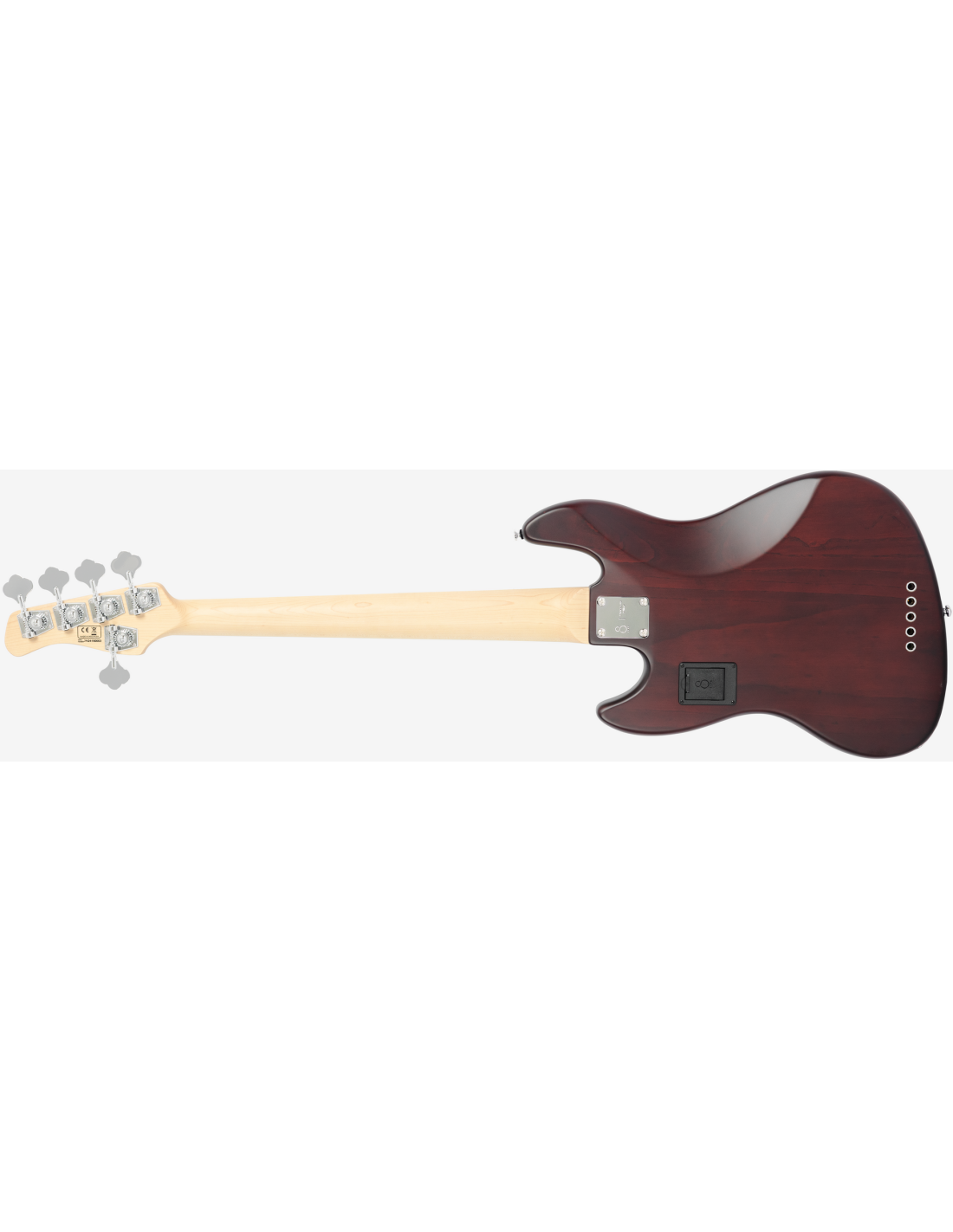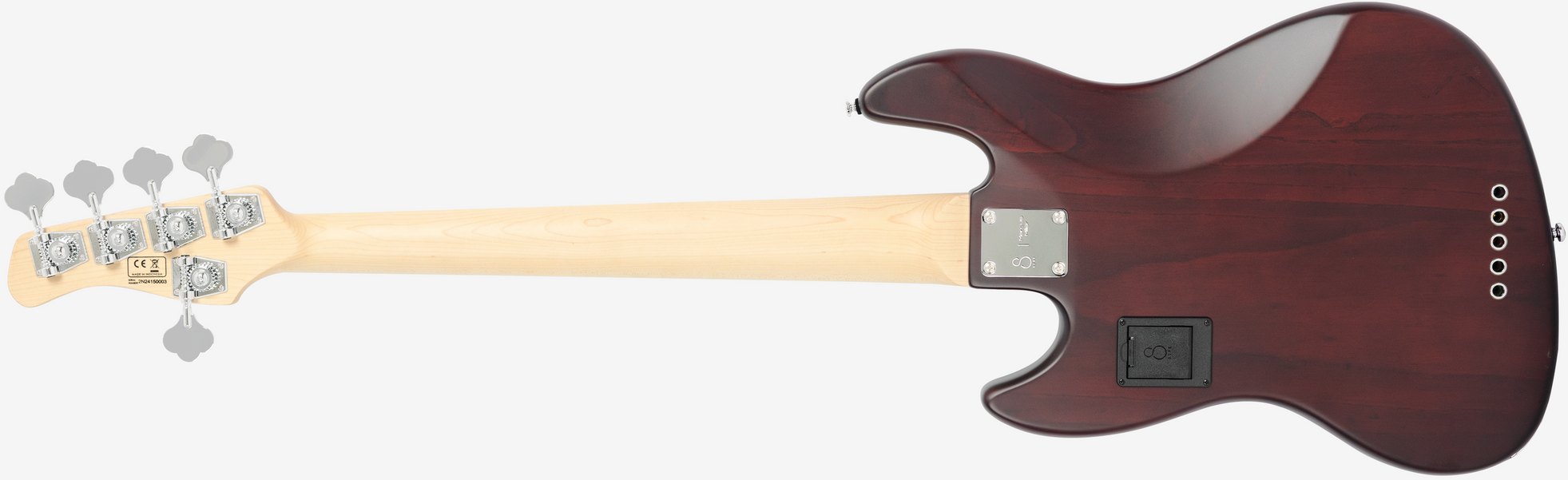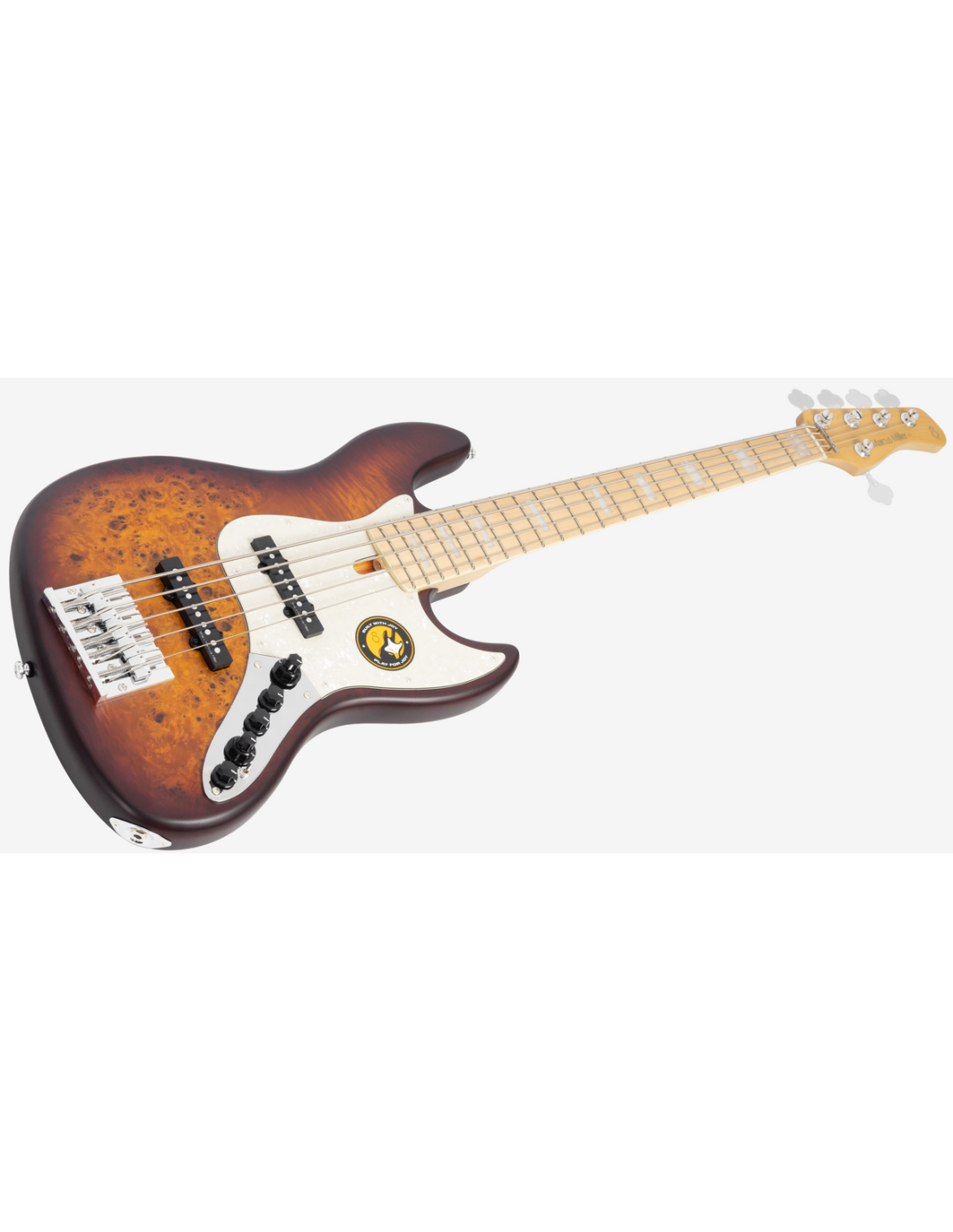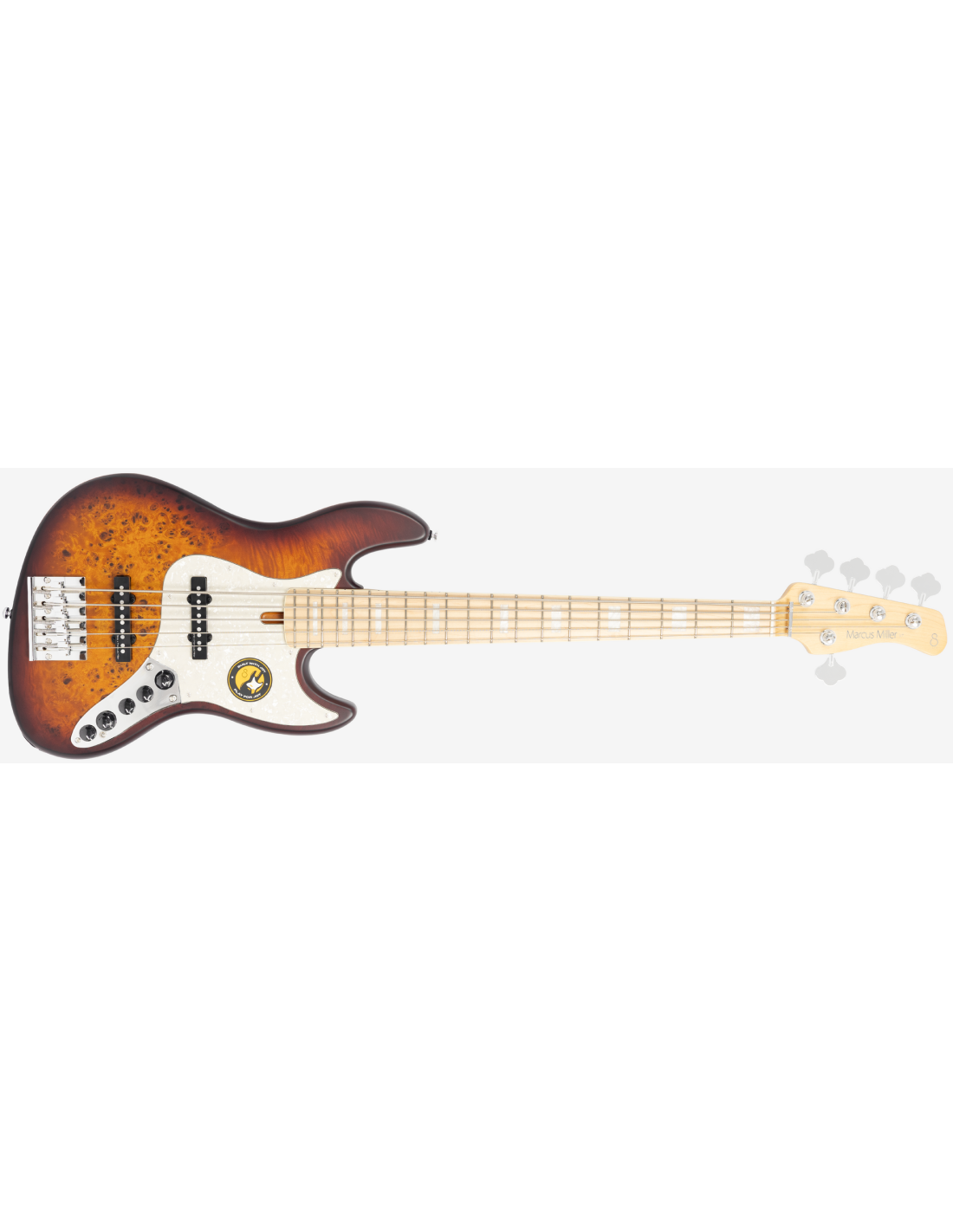MARCUS MILLER V7 5 SWAMP ASH REISSUE TS est une basse électrique à 5 cordes, modèle Sire Marcus Miller V7 ASH REISSUE 5-String, avec un corps en Swamp Ash (frêne de marais) et un dessus en placage de peuplier, forme Marcus Miller Jazz Shape, manche en érable dur à profil "C" Shape, touche en érable dur Edgeless à rayon 9,5" avec 20 frettes Medium et incrustations White Pearloid Block, sillet de 46mm en os, matériel Chrome, mécaniques Premium Open Gear et pont New Marcus Heavymass II Bridge. L'électronique active à configuration JJ consiste en un ensemble de micros Marcus Super-J Revolution Set avec préampli Marcus Heritage-3/3band EQ, contrôle Volume/Tone, interrupteur Actif/Passif, contrôle Blender et contrôles Treble, Bass et Middle avec contrôle de fréquence.