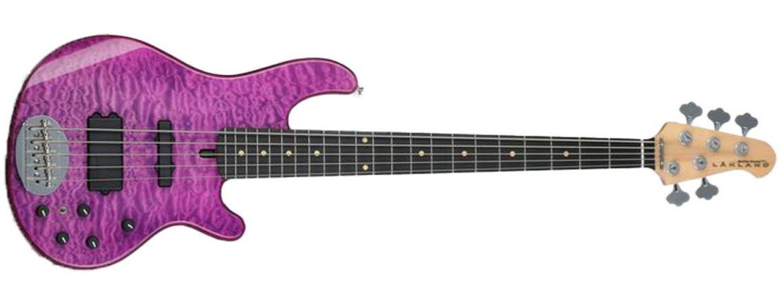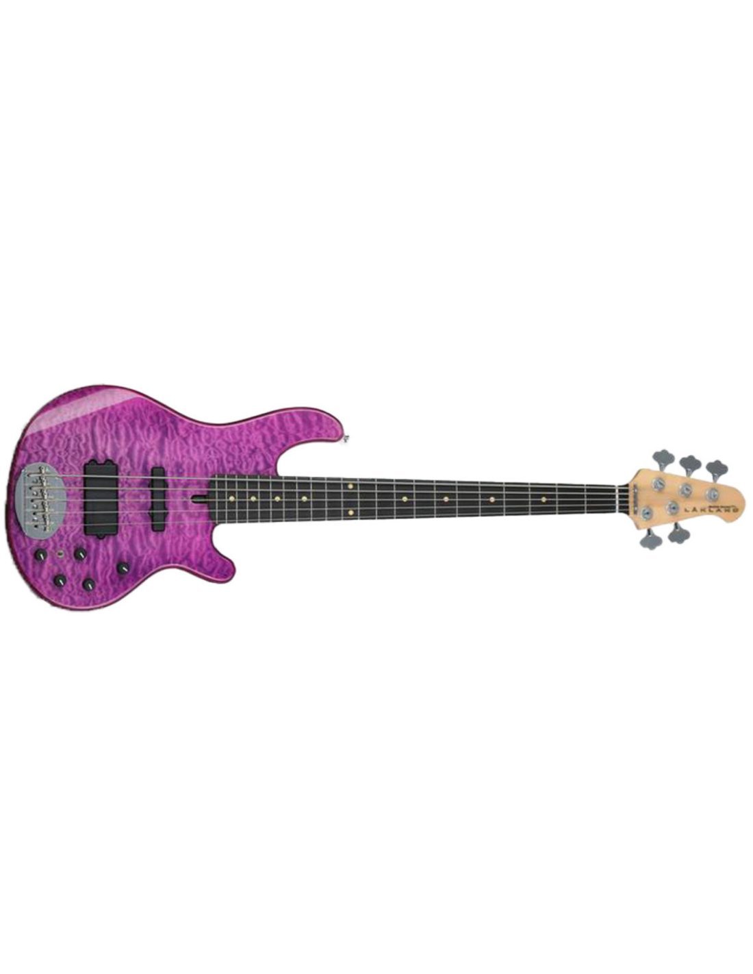 LAKLAND SKYLINE 5502 DELUXE TRANSPARENT PURPLE est une basse électrique à 5 cordes, modèle Skyline Series 55-02 Deluxe, avec un corps en frêne et un dessus en érable quilté, un manche bolt-on en érable plat scié rôti avec des barres de renfort en graphite, un touche en ébène à rayon composite 10"-13" avec 22 frettes Jumbo et des incrustations White Dot, un sillet en os de 45 mm, du matériel en chrome, des mécaniques Hipshot Ultra-Lite et un pont Lakland Dual Access (à travers le corps ou à travers le pont). L'électronique active à configuration HS consiste en un ensemble de micros Lakland MM-J avec préampli Lakland LH3 intégré et contrôles Bass, Midrange, Treble, contrôle de mélange des micros, volume principal avec push/pull pour bypass du préampli et interrupteur à 3 voies pour le contrôle de la bobine de l'humbucker au pont.