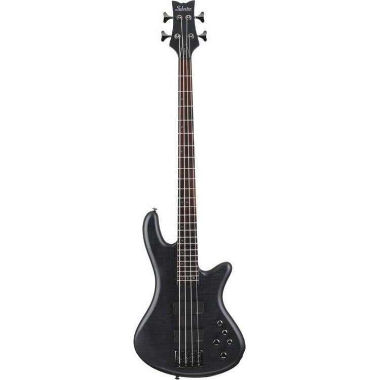 STILETTO STUDIO-4-STBLS - Basse électrique 4 cordes - Structure : neck-thrucon ultra accès - Corps : acajou et dessus en érable quilté - Manche : érable et noyer multilaminé - Touche : palissandre - Échelle : 34” - 24 frettes X-jumbo - Incrustations : points - Micros : EMG-35 HZ - Contrôles : 1x Blend + 1x Volume + Égaliseur actif 3 bandes EMG 18v - Chevalet : Diamond Custom - Mécaniques : Schecter - Finitions matériel : noires chromées - Couleur : noir transparent - Finition : satinée.