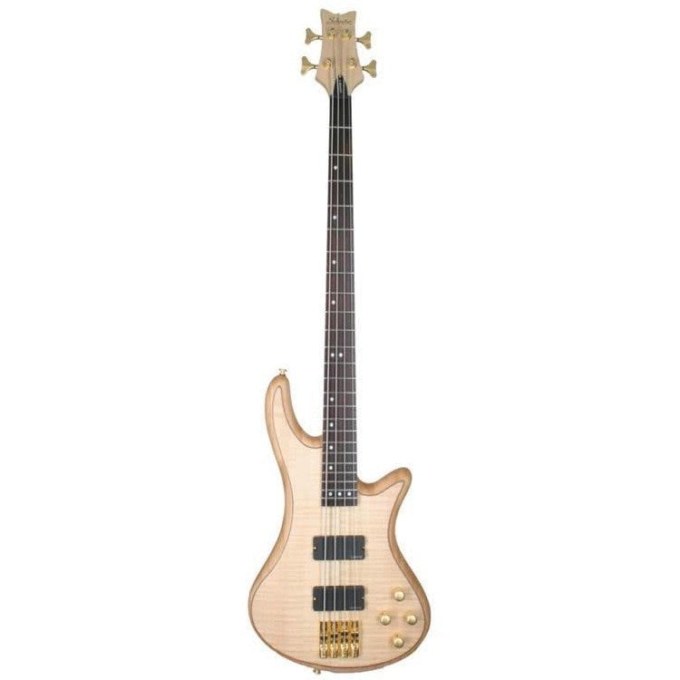 STILETTO CUSTOM-4-NAT - Basse électrique 4 cordes - Structure : bolt-on - Corps : acajou et table en érable flammé - Manche : érable et noyer multicouche - Touche : palissandre - Échelle : 34” - 24 frettes X-jumbo - Incrustations : points - Micros : EMG-35HZ - Contrôles : 1x Blend + 1x Volume + Égaliseur actif 2 bandes EMG - Chevalet : S-Tek - Mécaniques : Schecter - Finitions matériel : dorées satinées - Sillet : Graph Tech - Couleur : bois naturel - Finition : satinée.