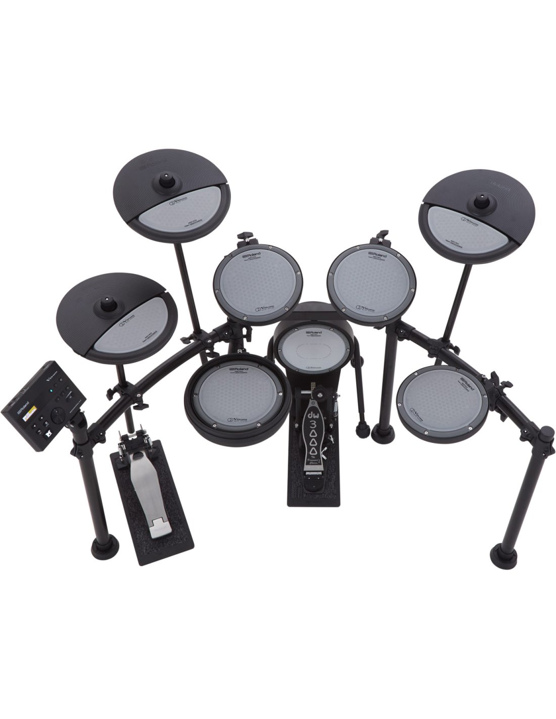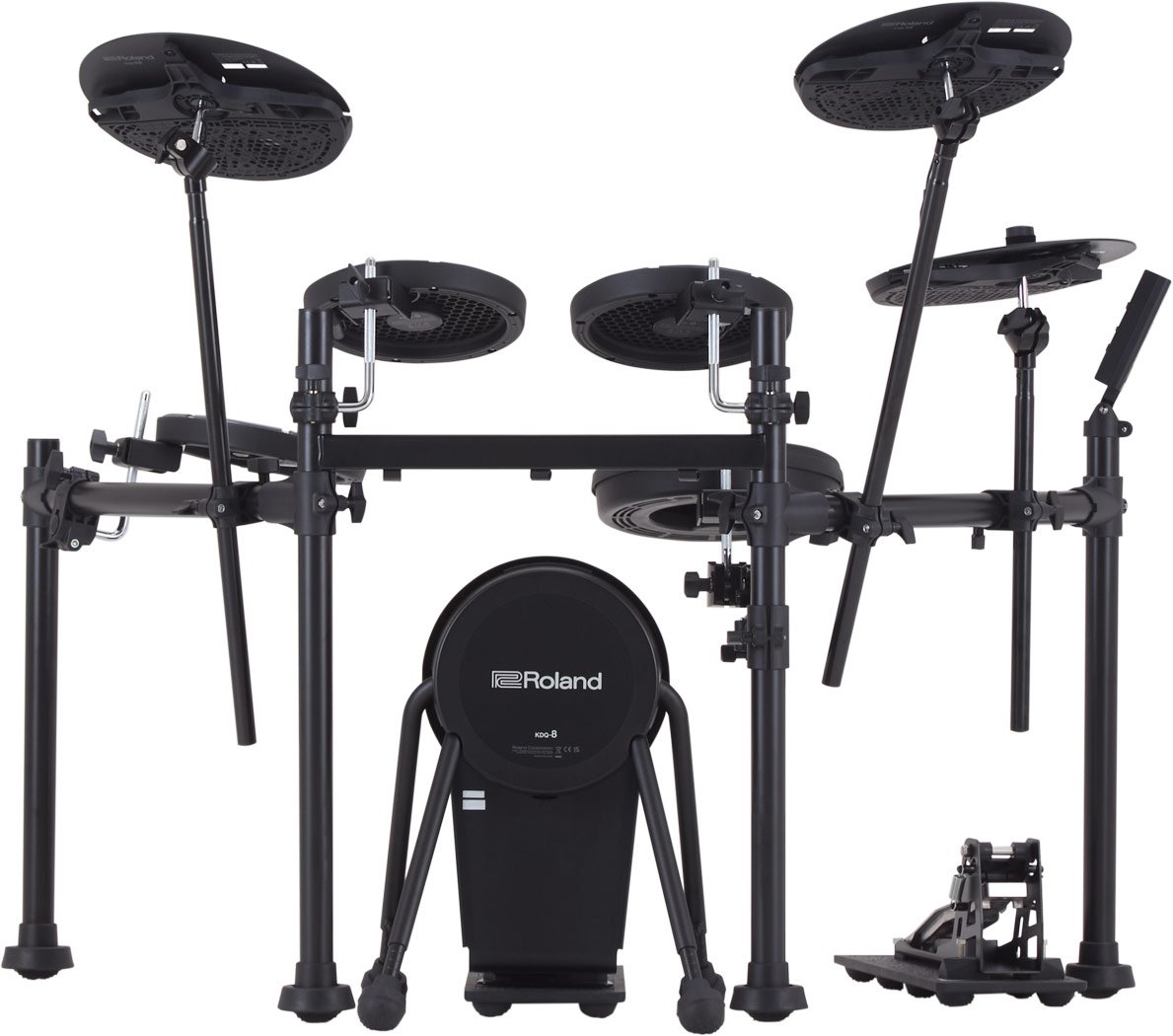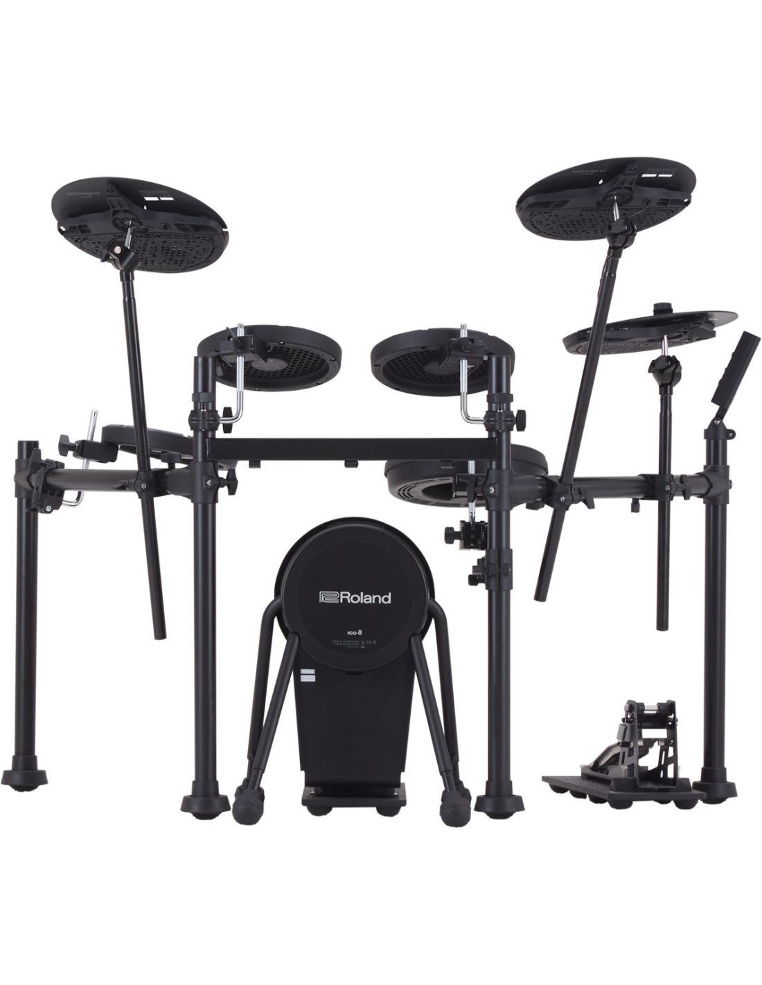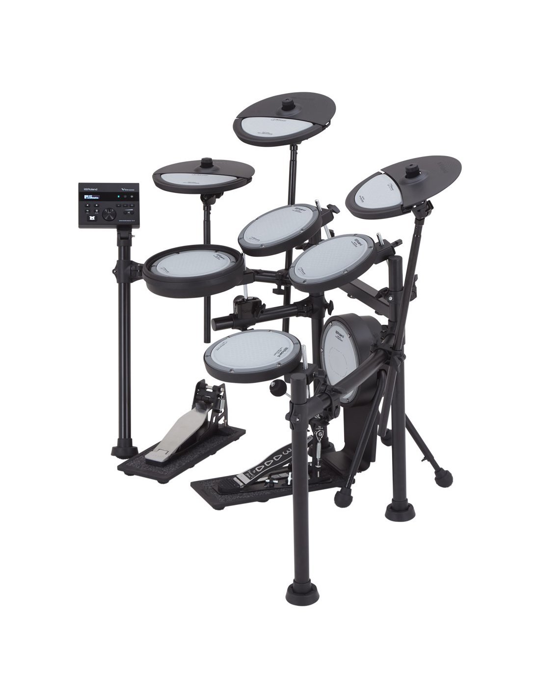 ROLAND VQD106 est une batterie électronique de la série Roland V-Drums, complète avec 5 pièces, module sonore, pad hi-hat et set de cymbales. Les caractéristiques techniques incluent kick : KDQ-8, caisse claire : PDQ-8S, Hi-hat : CYQ-12, pédale de contrôle hi-hat : FD-9, tom : PDQ-8 x 3 *2, crash : CYQ-12, ride : CYQ-12, base de la pédale Kick : NEQ-K, base de la pédale hi-hat : NEQ-H, structure rack à 4 montants. Le module sonore comprend 50 kits de batterie, 143 instruments virtuels, 1 système multi-effets avec 30 types d'effets, fonction Coach à 5 modes, métronome, implémentation Bluetooth 4.2, Affichage LCD, 4 entrées Trigger sur Jack 6,3mm, Sortie/Phones sur connecteurs minijack, Mix In sur minijack, interface audio USB 2 canaux. Ne comprend pas de pédale kick et de tabouret.