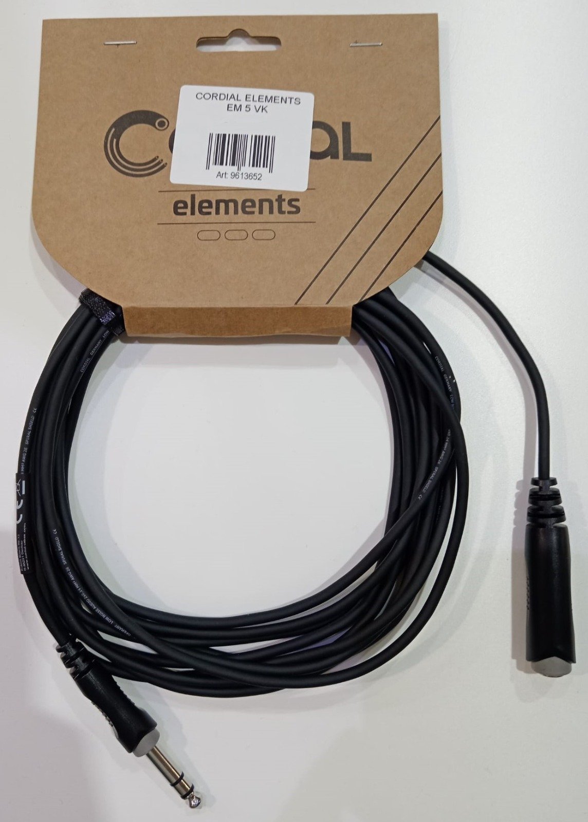 CORDIAL ELEMENTS EM 5 VK est une rallonge audio équilibrée de la gamme CORDIAL ELEMENTS, avec un câble AWG 26 doté d'un blindage en spirale et des connecteurs Jack 6,3mm TRS mâle et Jack 6,3mm TRS femelle