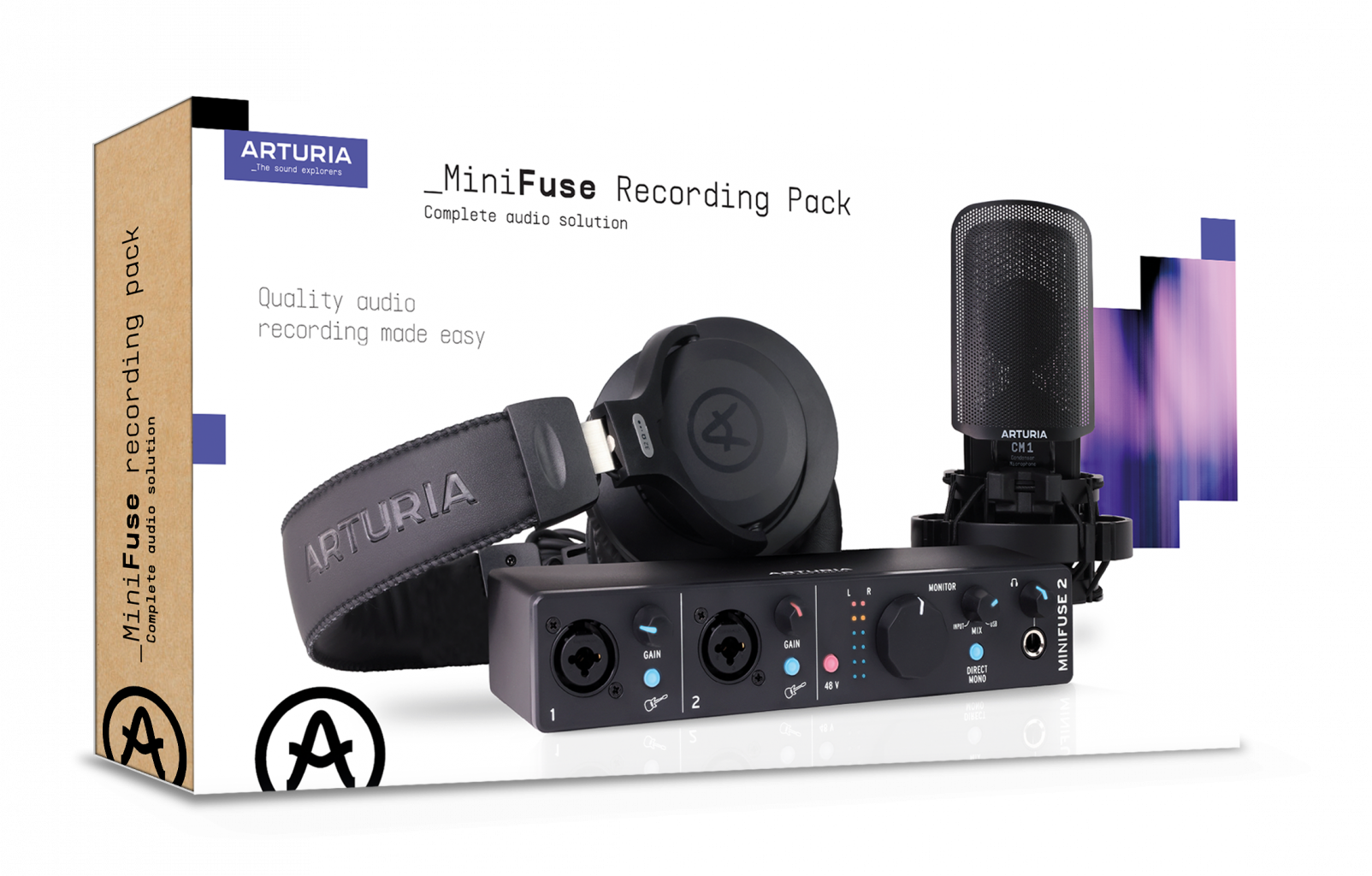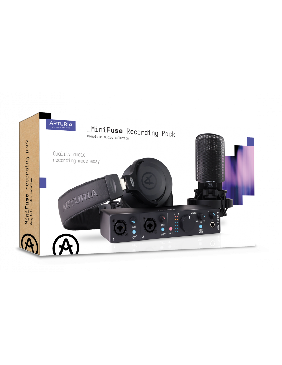 Bundle avec MiniFuse 2, microphone, casque et câbles. La version noire du MiniFuse Recording Pack est le nouveau bundle complet d'Arturia idéal pour les musiciens, producteurs et "explorateurs sonores" qui souhaitent avoir en une seule solution tout le nécessaire pour la production musicale "entrée de gamme" avec la possibilité de créer et d'enregistrer à domicile avec une qualité sans compromis. Le MiniFuse Recording Pack comprend dans un seul paquet une interface audio, un microphone, un casque et tous les câbles nécessaires pour démarrer facilement et immédiatement le travail de production et d'enregistrement à domicile. C'est le choix parfait pour les débutants qui s'approchent pour la première fois de la production musicale ou du secteur en pleine expansion de la création de contenu, mais aussi pour les producteurs et musiciens à un niveau plus avancé qui recherchent une solution 'à petit budget' ou 'de secours' avec des limites d'espace dans leur environnement de travail. L'Arturia MiniFuse 2, incluse dans le MiniFuse Recording Pack, propose des connexions MIDI et deux entrées et deux sorties audio, et est parfaite pour enregistrer la voix, la guitare, les podcasts et pour produire des pistes avec la meilleure qualité, avec également un paquet de logiciels inclus très riche et complet. Du logiciel de production musicale prêt à l'emploi à des centaines de presets synthétiseurs extraordinaires et aux effets de qualité studio d'Arturia, le paquet logiciel inclus permet d'élever les enregistrements à un niveau supérieur, offrant un son unique et adapté à chaque style musical. Avec le logiciel inclus, il est possible de donner la priorité totale à sa créativité grâce à des tutoriels pour la production musicale, des conseils sur le mixage et des modèles de projet Ableton réalisés par des artistes, producteurs et beatmakers. Le logiciel gratuit est constamment mis à jour et ne nécessite aucun abonnement supplémentaire. Le MiniFuse Recording Pack comprend : MiniFuse 2 : une interface audio/MIDI avec 2 entrées et 2 sorties, microphone cardioïde CM1 avec support anti-choc et filtre anti-pop, casques fermés EF1 avec adaptateur, câble XLR de 3 m, 6 paquets de logiciels premium pour la production musicale. Le MiniFuse Recording Pack est disponible en double coloris 'noir' ou 'blanc'.