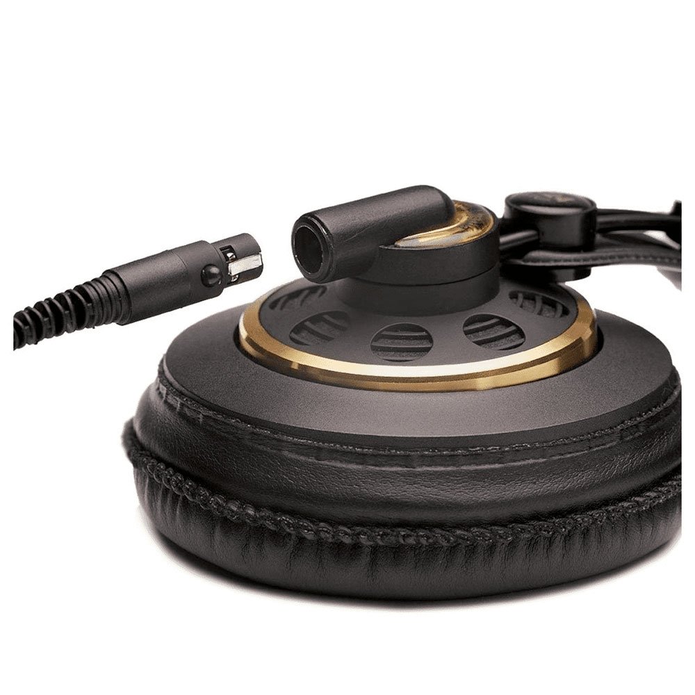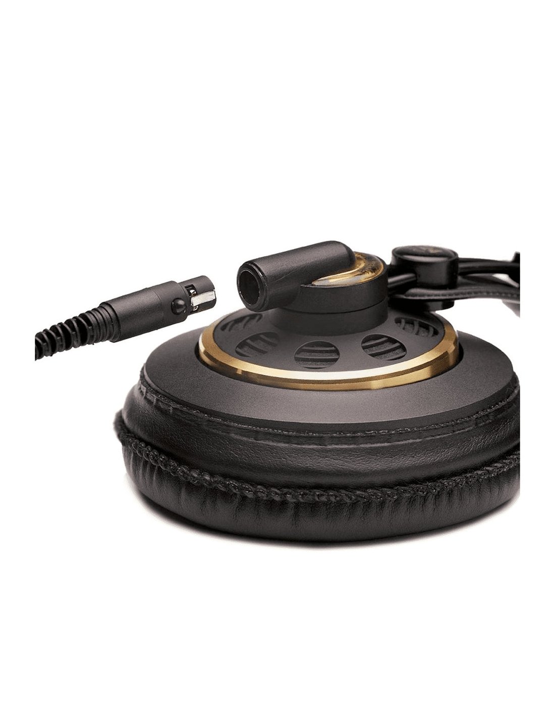 Casques de studio semi-ouverts circumauraux avec des coussinets en cuir synthétique, détails classiques noir et or, câble détachable