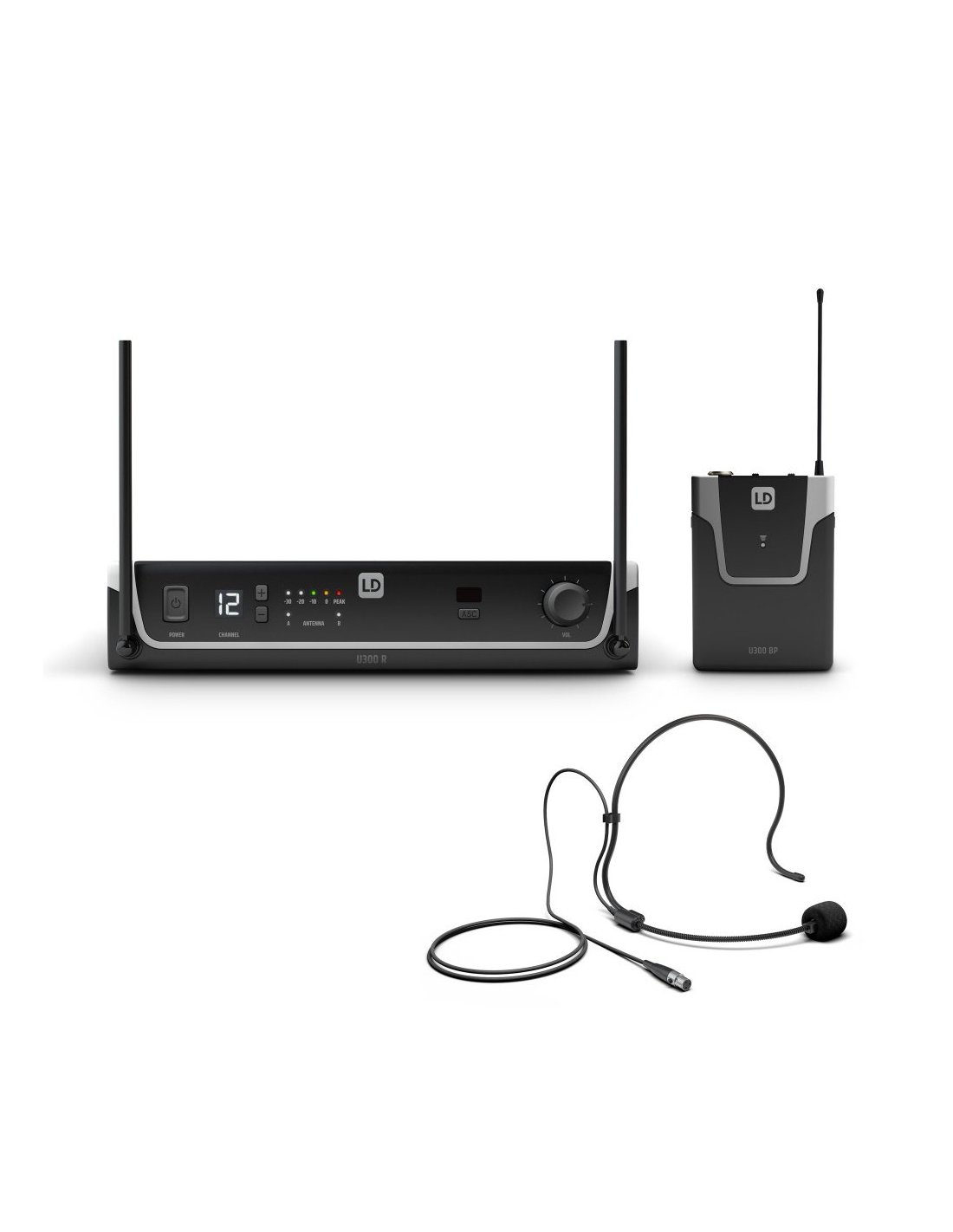 CASQUE LD SYSTEMS U308 BPH (863-865 MHZ). Système de radiomicrophone UHF comprenant Émetteur U300R avec 5 bandes de fréquence sélectionnables, synchroniseur de fréquence one-touch via infrarouge, indicateurs à LED avec un mètre LED à 5 segments et indicateur de batterie, Bodypack U300BP avec niveau de signal d'entrée réglable sur 3 positions, bouton de veille, Lavalier à diagramme polaire cardioïde omnidirectionnel avec connecteur mini XLR 3 broches et clip à l'extrémité de la capsule pour le positionnement. Plage de fréquence 863-865 MHZ