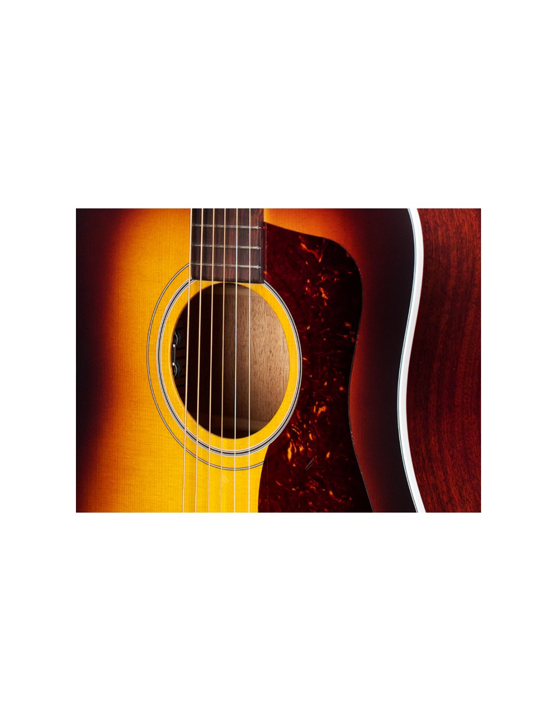 Nouvelle entrée dans la série Guild USA, la D-40 est parfaite pour les guitaristes à la recherche d'un son dreadnought moderne. La combinaison classique d'un dessus en épicéa Sitka massif et d'un fond et de éclisses en acajou offre un volume remarquable, une définition et une résonance. La D-40 présente un chevalet et une touche en palissandre indien avec des repères en nacre, un manche en acajou avec profil C, et une échelle de 651 mm. Les mécaniques sont ouvertes dans un style vintage avec un rapport de 20:1, le sillet (capotasto) mesure 43 mm et le barré est en os. Une élégante et légère finition satinée Antique Sunburst donne à cette guitare un look familier, permettant au bois de vibrer librement. Les équipements classiques de la D-40 incluent également une rosace de style vintage, un pickguard en celluloïd tortoise, un binding et un purfling en ABS, et le logo Guild en nacre sur la tête. Chaque D-40 est accompagnée d'un certificat d'authenticité numéroté, d'un étui rigide en bois avec un système d'humidification Humicase®. Le système d'amplification est L.R. Baggs EAS VTC Element (Anthem sur demande).em,balaje mal estadoArtículo reembalado